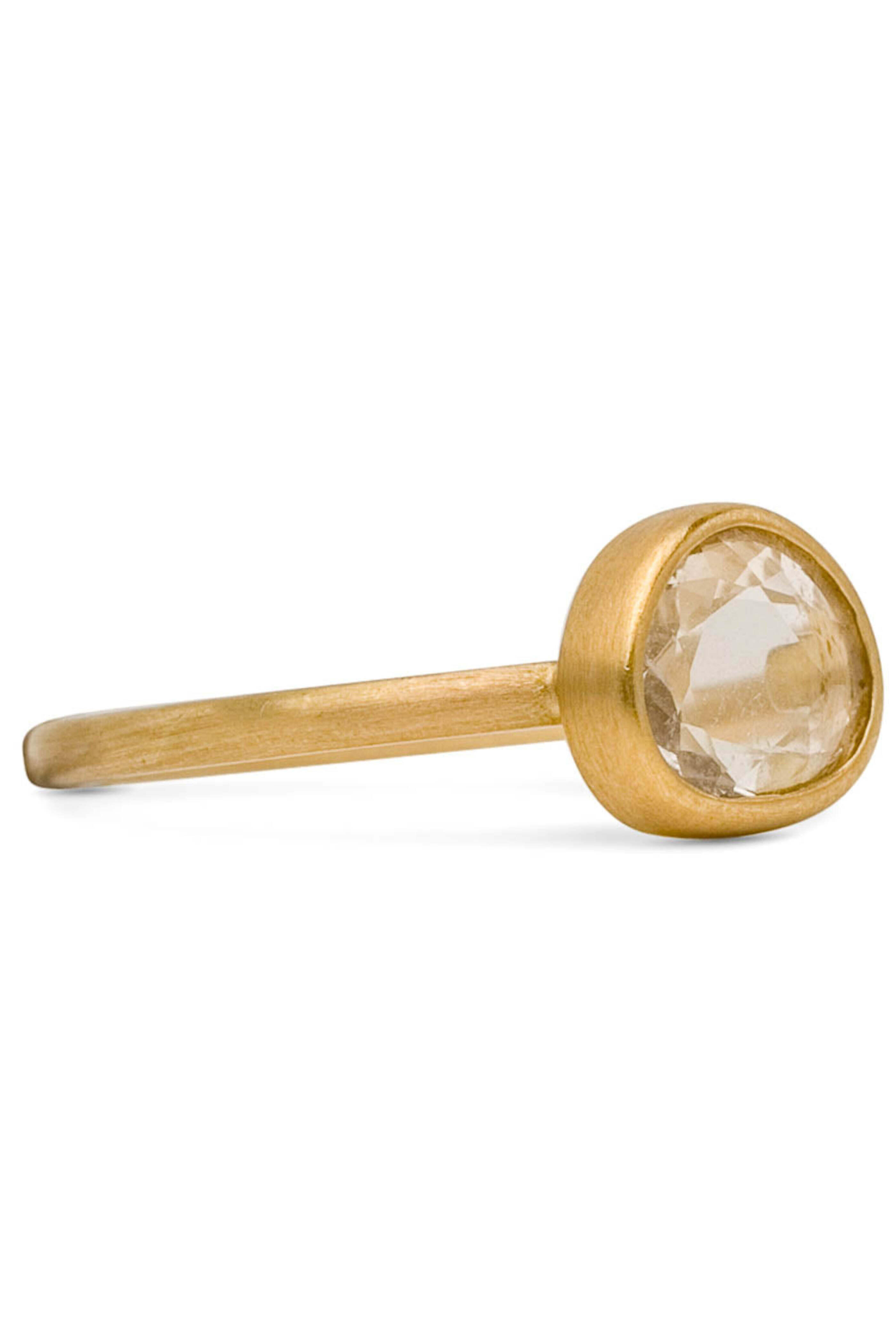 Caroline Ellen Yellow Gold Rose Cut Round White Sapphire Ring 20k yellow gold band 22k yellow gold setting 0.92 ct. rose cut white sapphire Organic round shape Size 6.75.