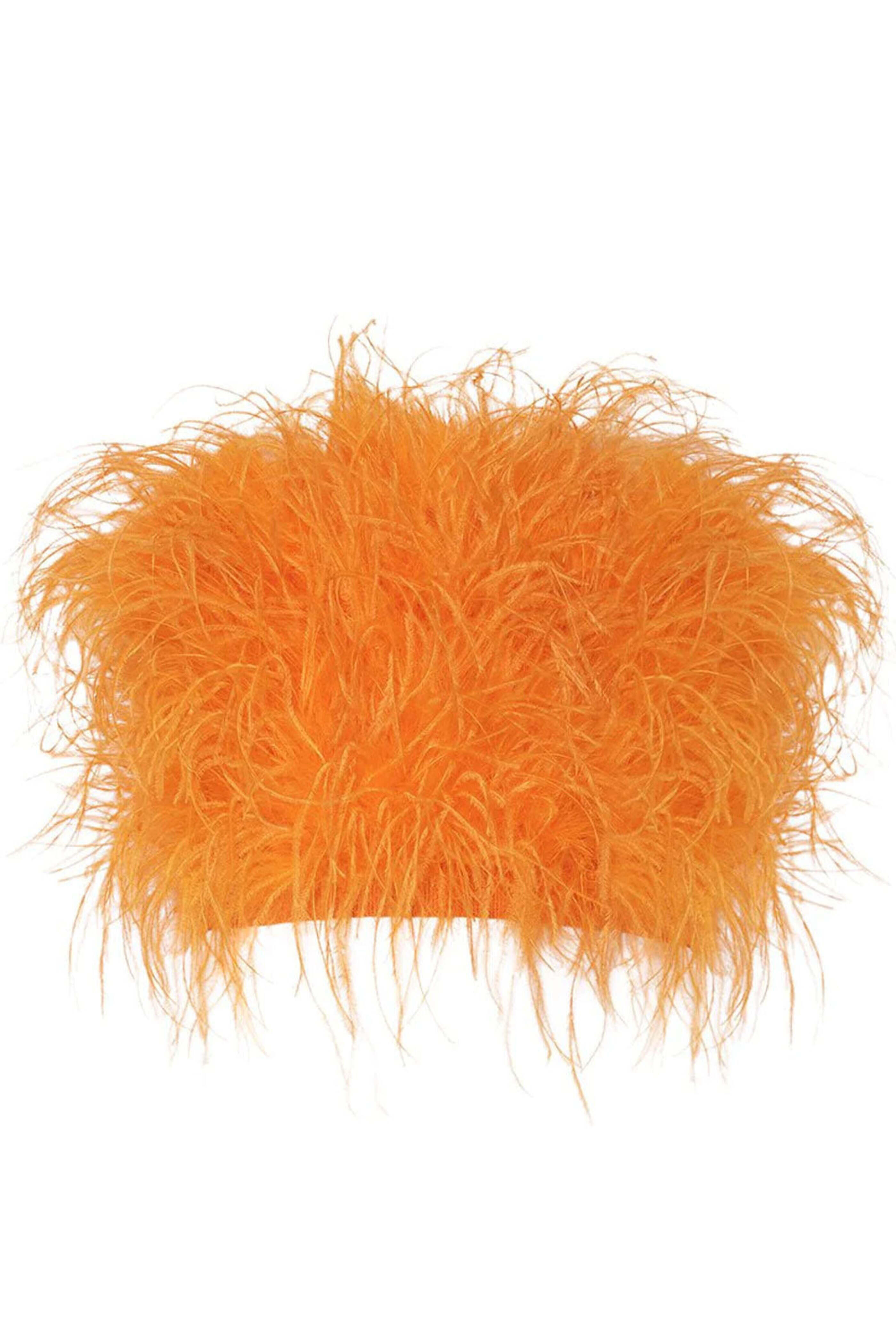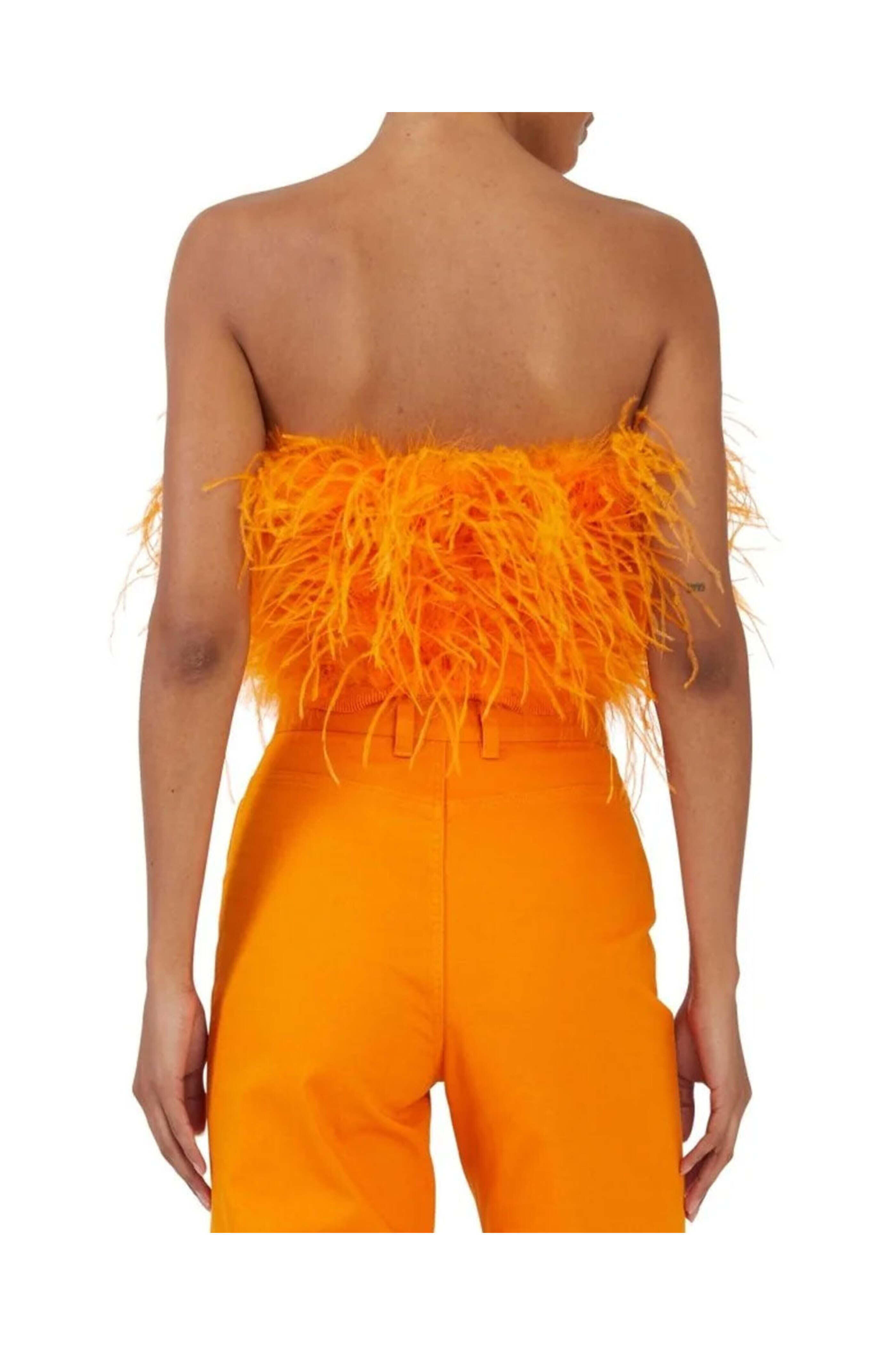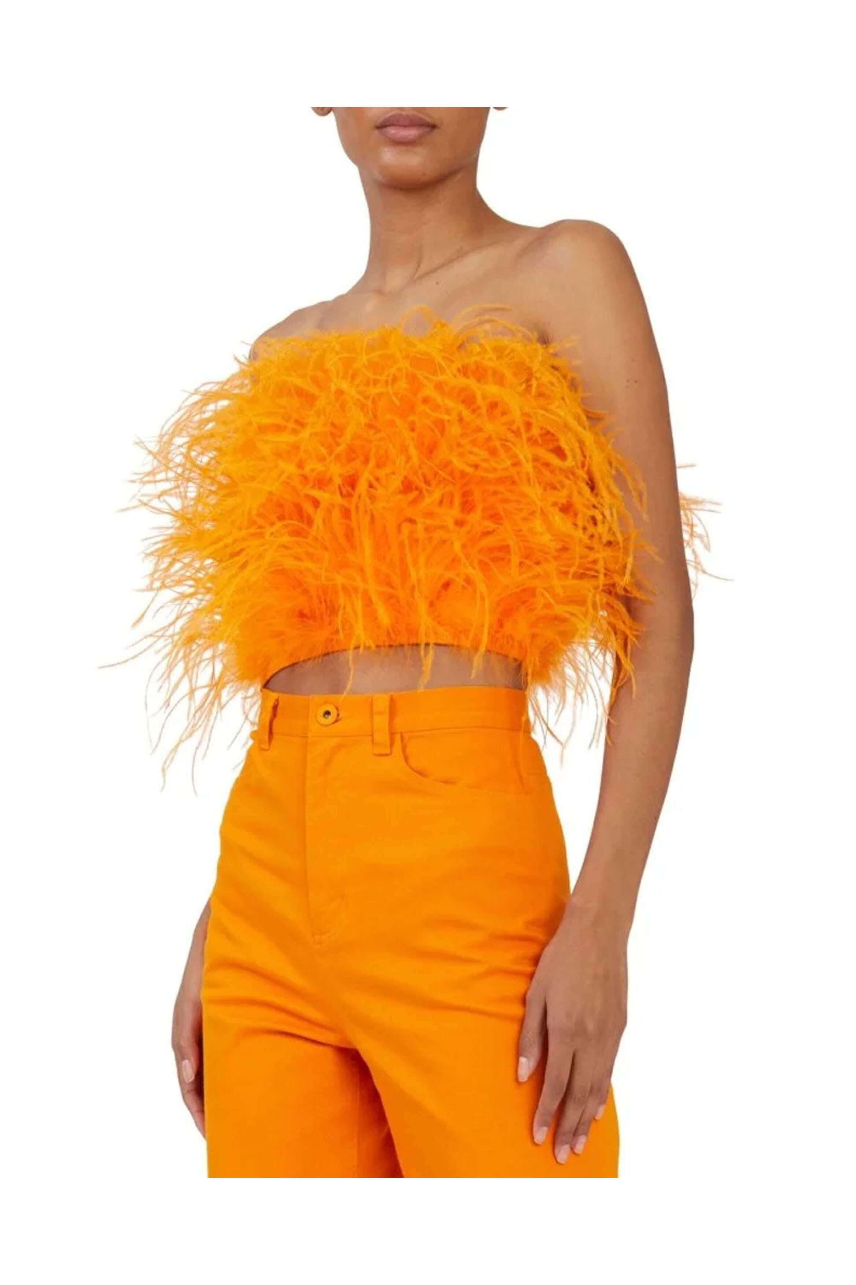 Lapointe Tangerine Ostrich Feather Tube Top. Strapless. Slim silhouette. Ostrich feather detail throughout. Cropped length. 83% viscose, 17% elite polyester outer, 100% ostrich feather detail.
