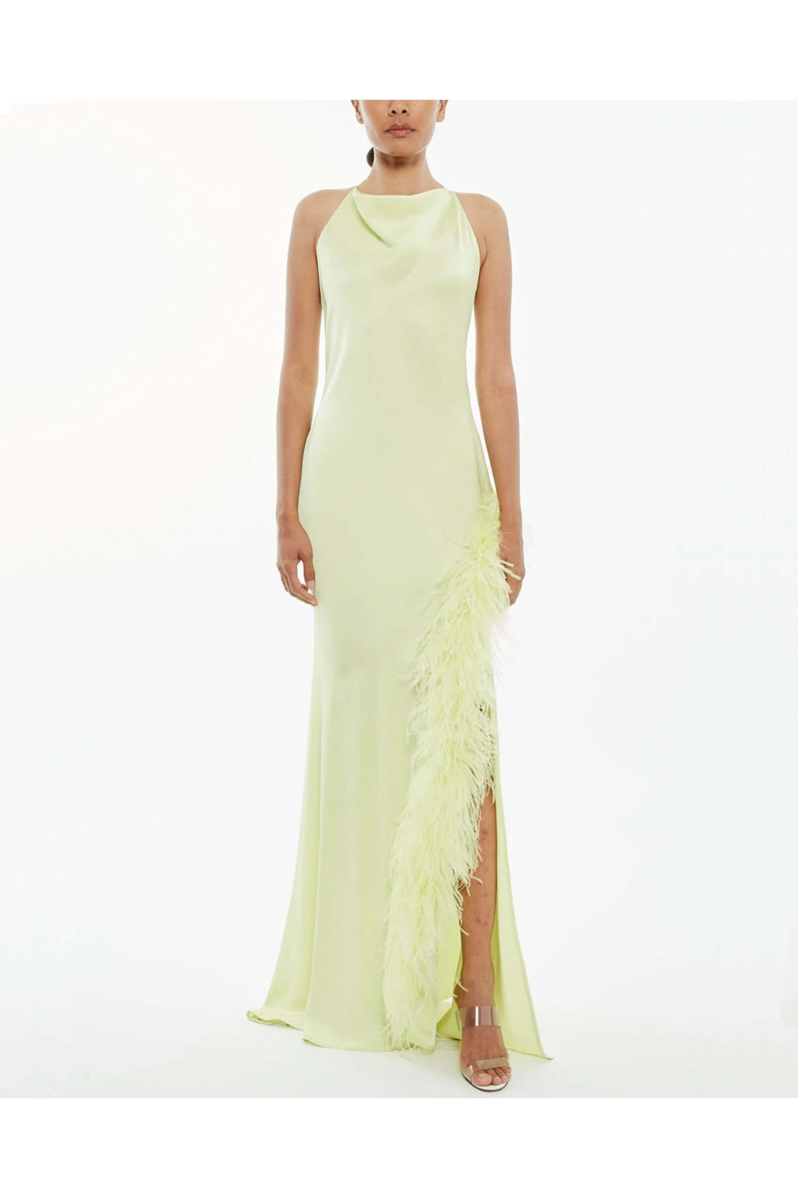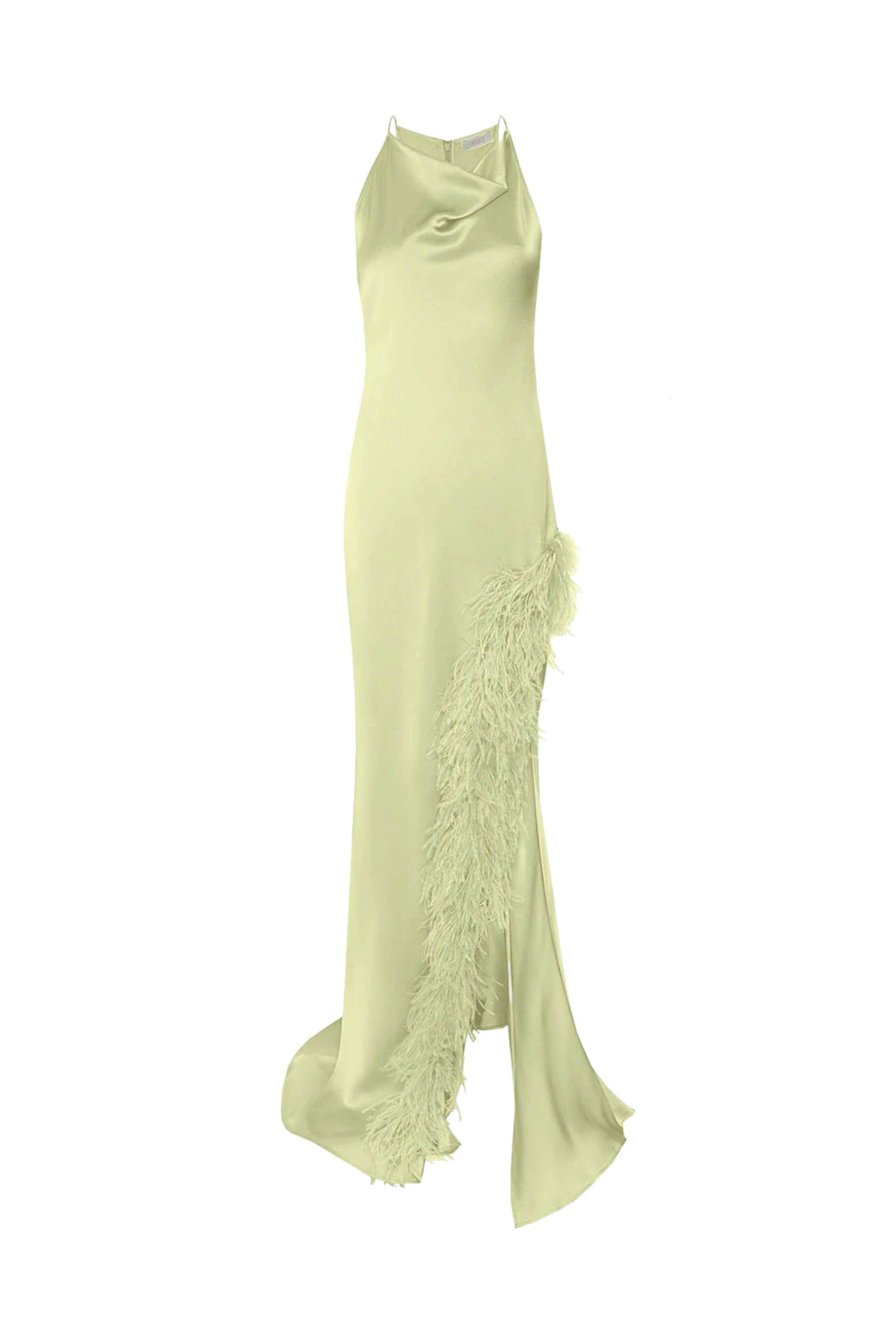 Lapointe Limon Satin Halter Neck Feather Gown. High cowl neck. Sleeveless. Concealed back zip closure. Slim silhouette. High hem slit. Ostrich feather detail. Maxi length. Made in USA. 61% acetate, 39% viscose.
