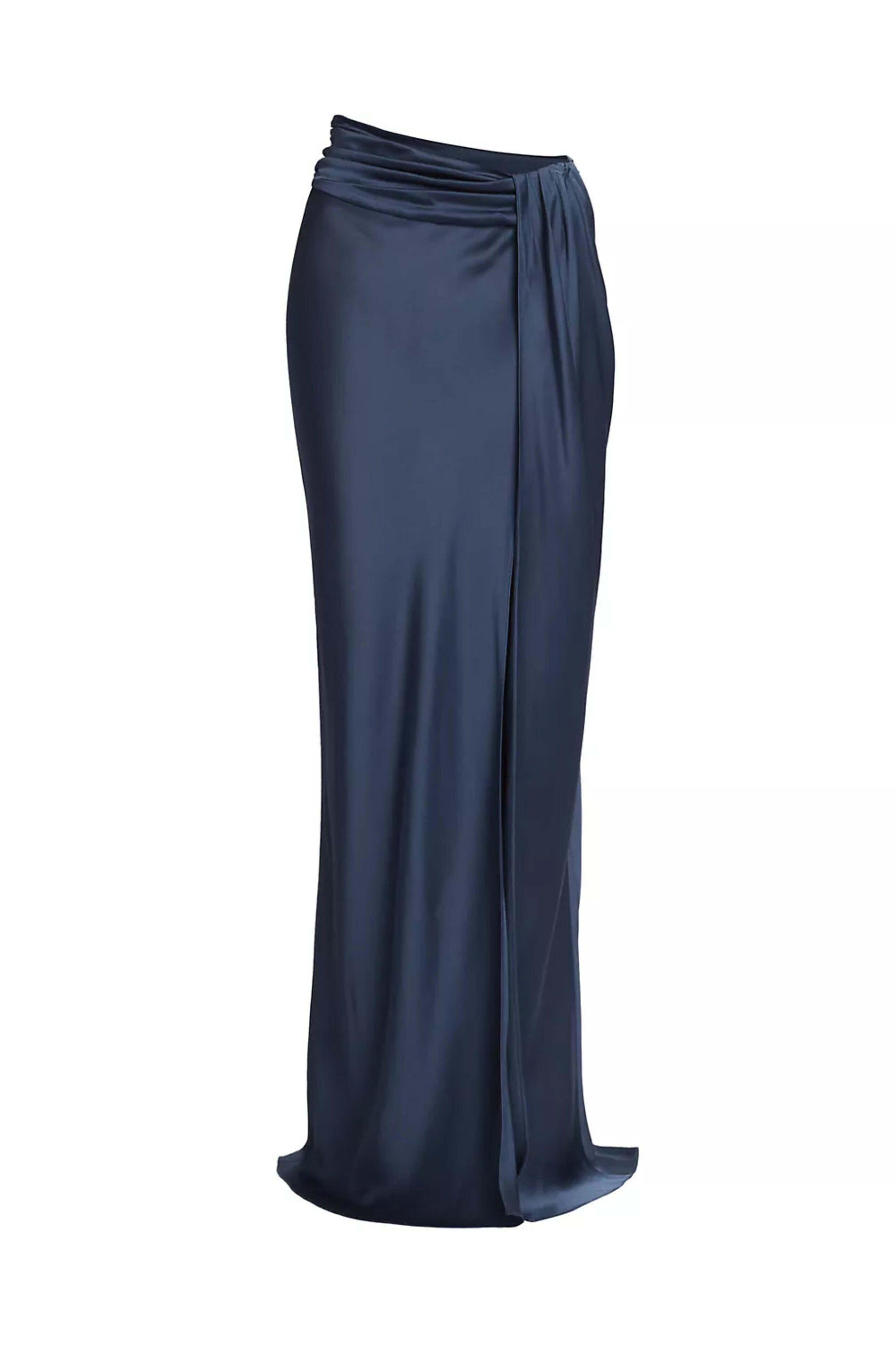 Lapointe Ink Satin Asymmetrical Maxi Skirt. Asymmetrical gathered waist. Drape detail. Slim silhouette. High hem slit. Maxi length. Made in USA. 61% acetate, 39% viscose.