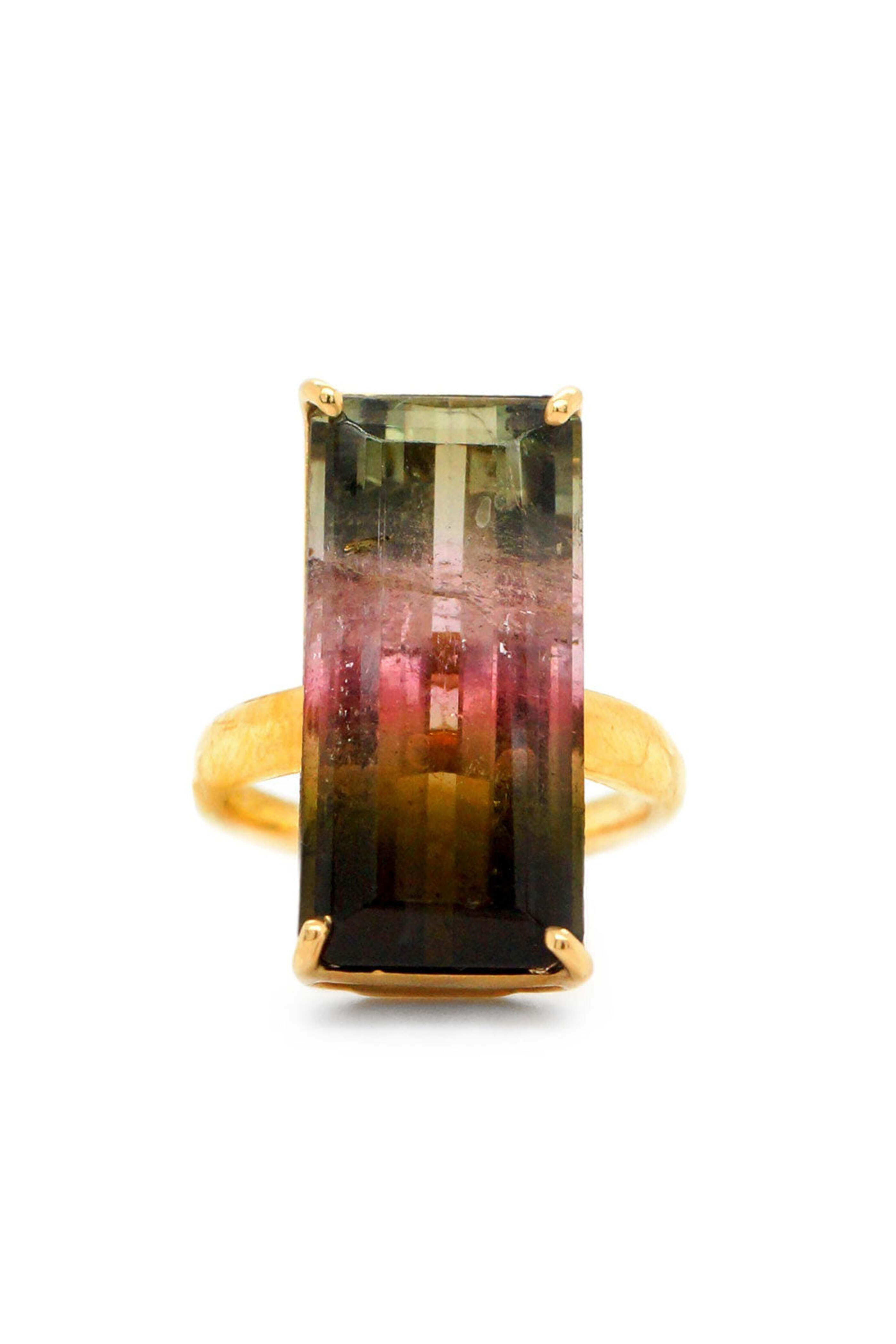 Sharon Khazzam Sateem Ring. 18k rose gold. Watermelon tourmaline 13.21 total carat weight. Emerald cut tourmaline. Prong setting. Ring size 6. One of a kind. Handcrafted in New York.