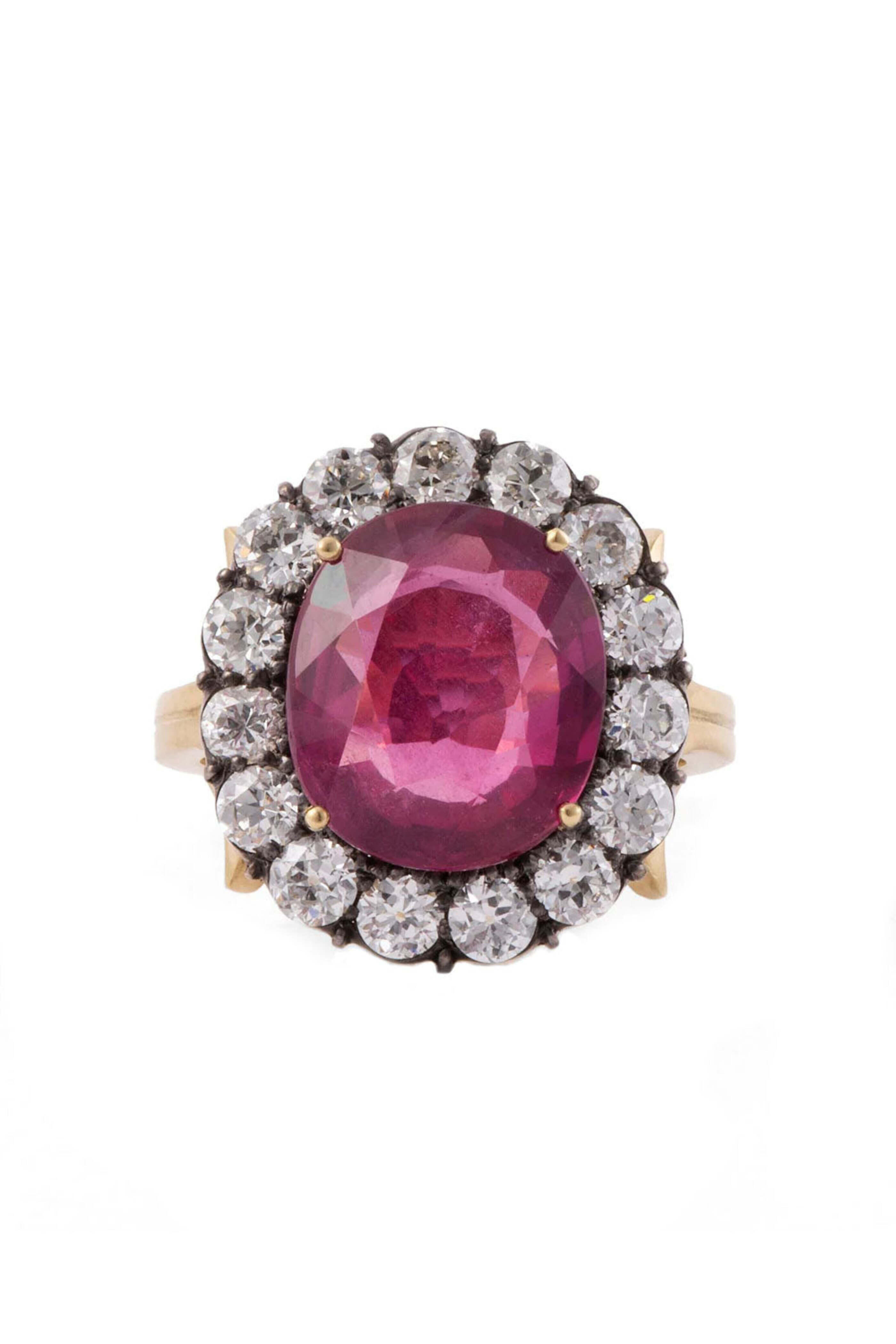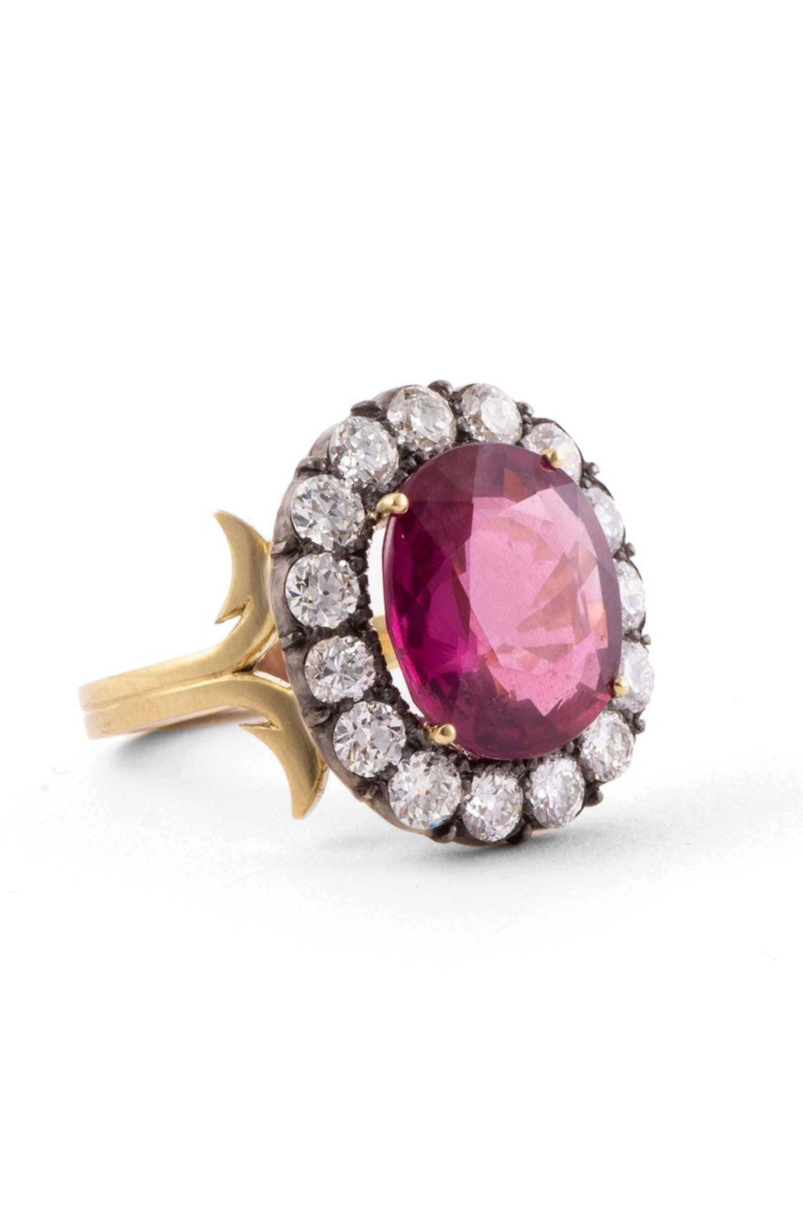 Sylva & Cie Ruby and Diamond Ring. 18k yellow gold. Sterling silver. Ruby 7.65 total carat weight. Old european cut diamond. Ring size 7.25. Made in the USA.