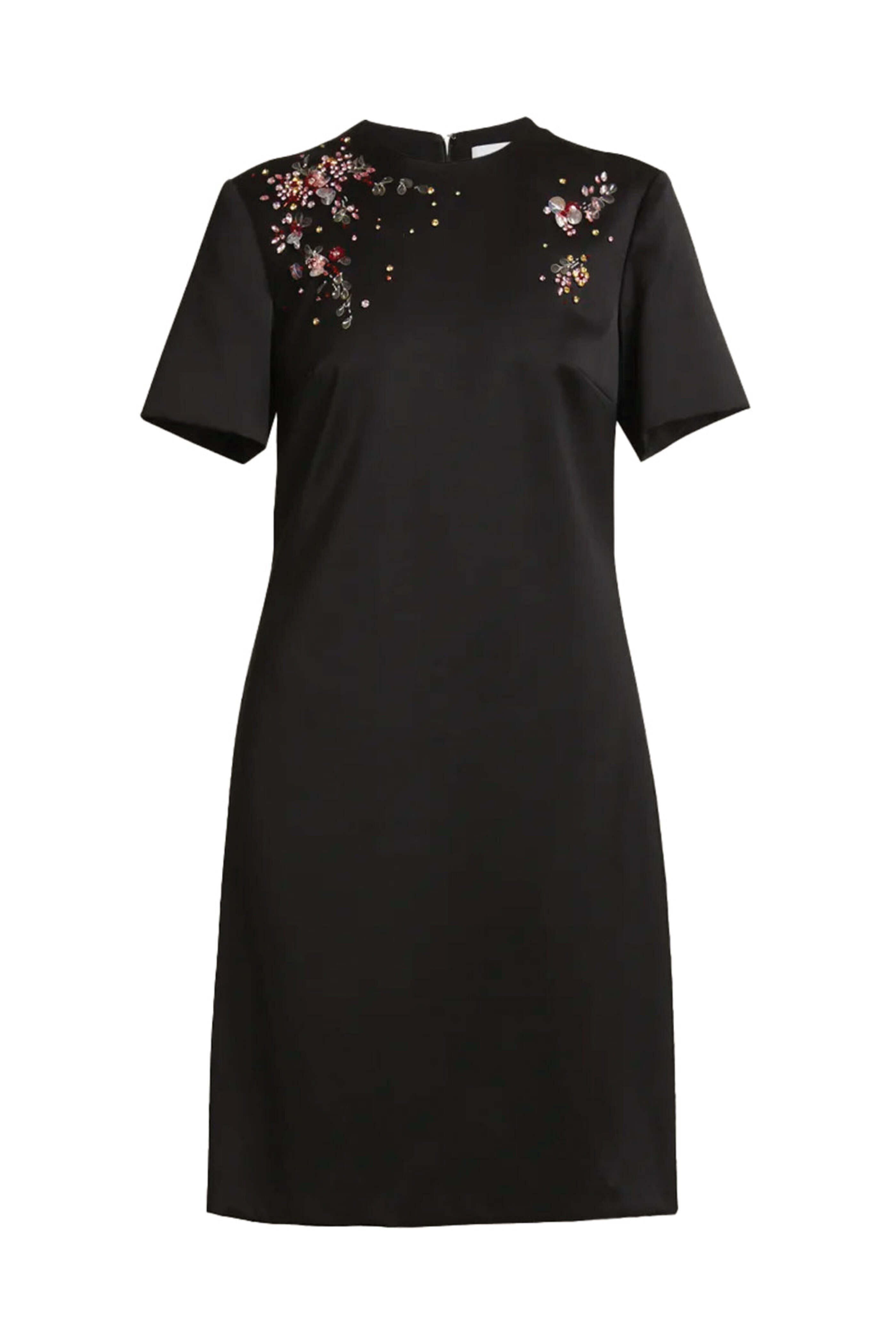 ERDEM Black Short Sleeve Mini Dress. Round neck. Short sleeves. Embellished detail at shoulders. Concealed back zip closure. Shift silhouette. Mini to knee length. Lined. 100% silk.