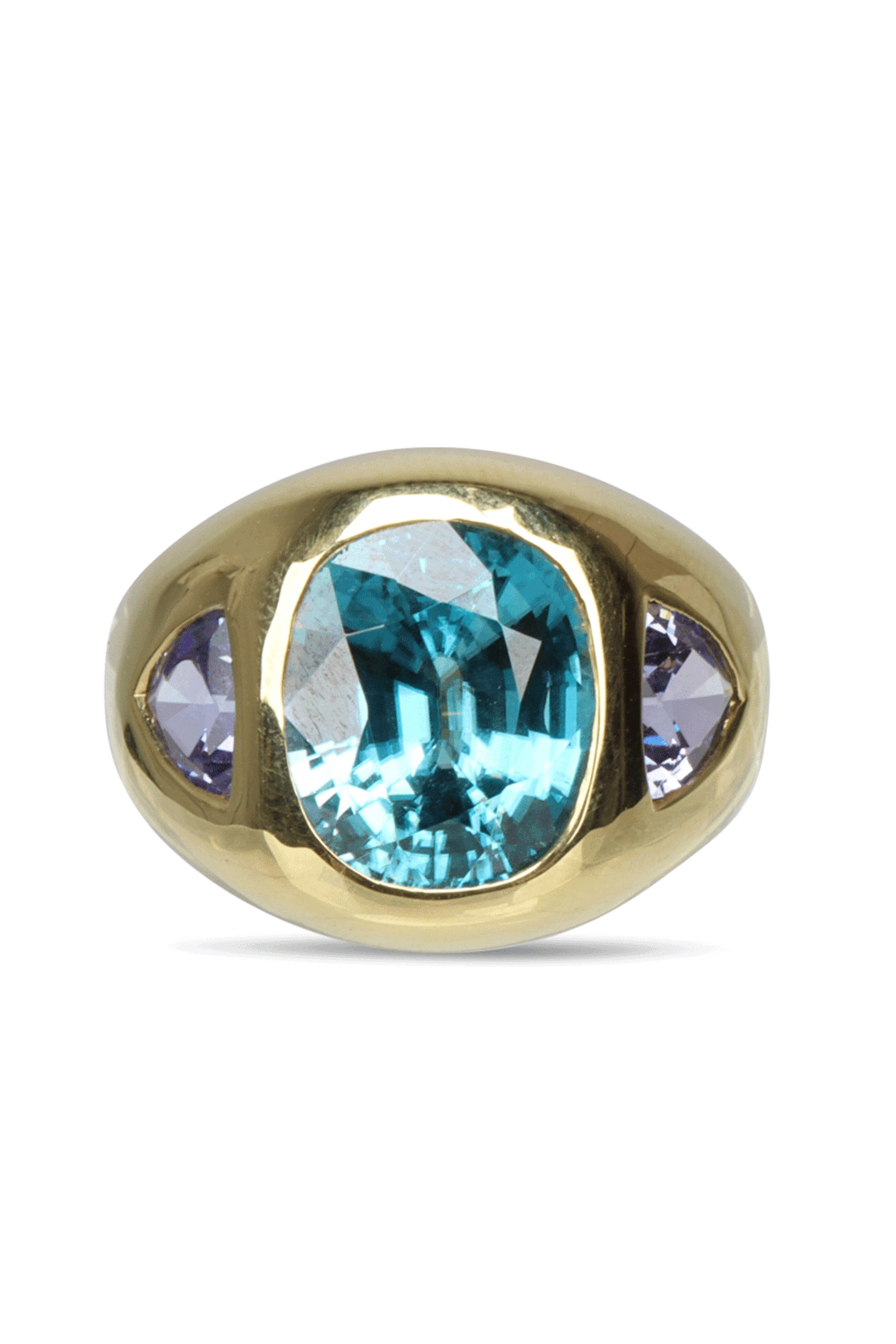 18k gold. Tanzanite 3.22 total carat weight. Tourmaline 3.91 total carat weight. Oval cut. Pear cut. Gold bezel. Prong setting. Made in the USA. Ring size: 7.