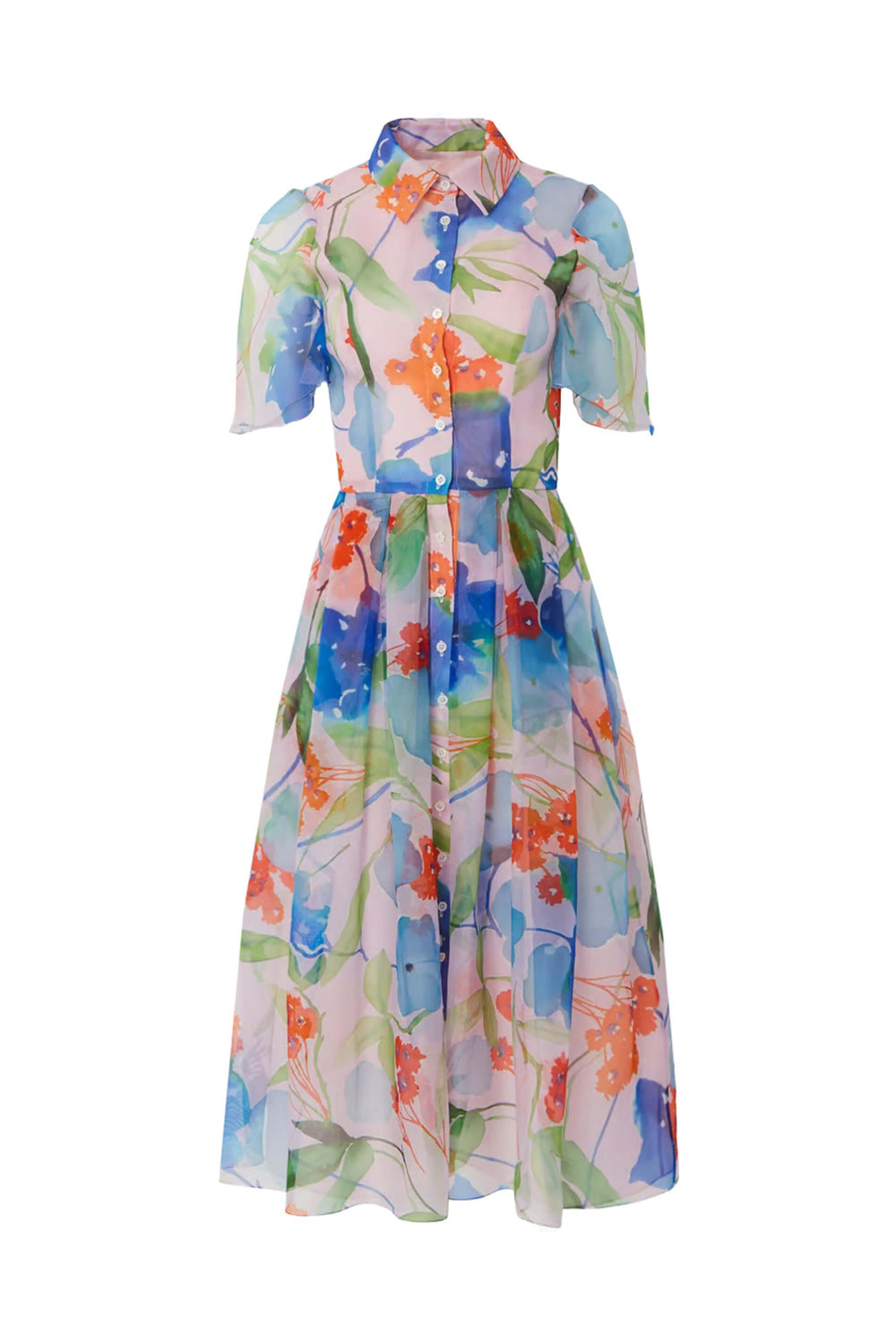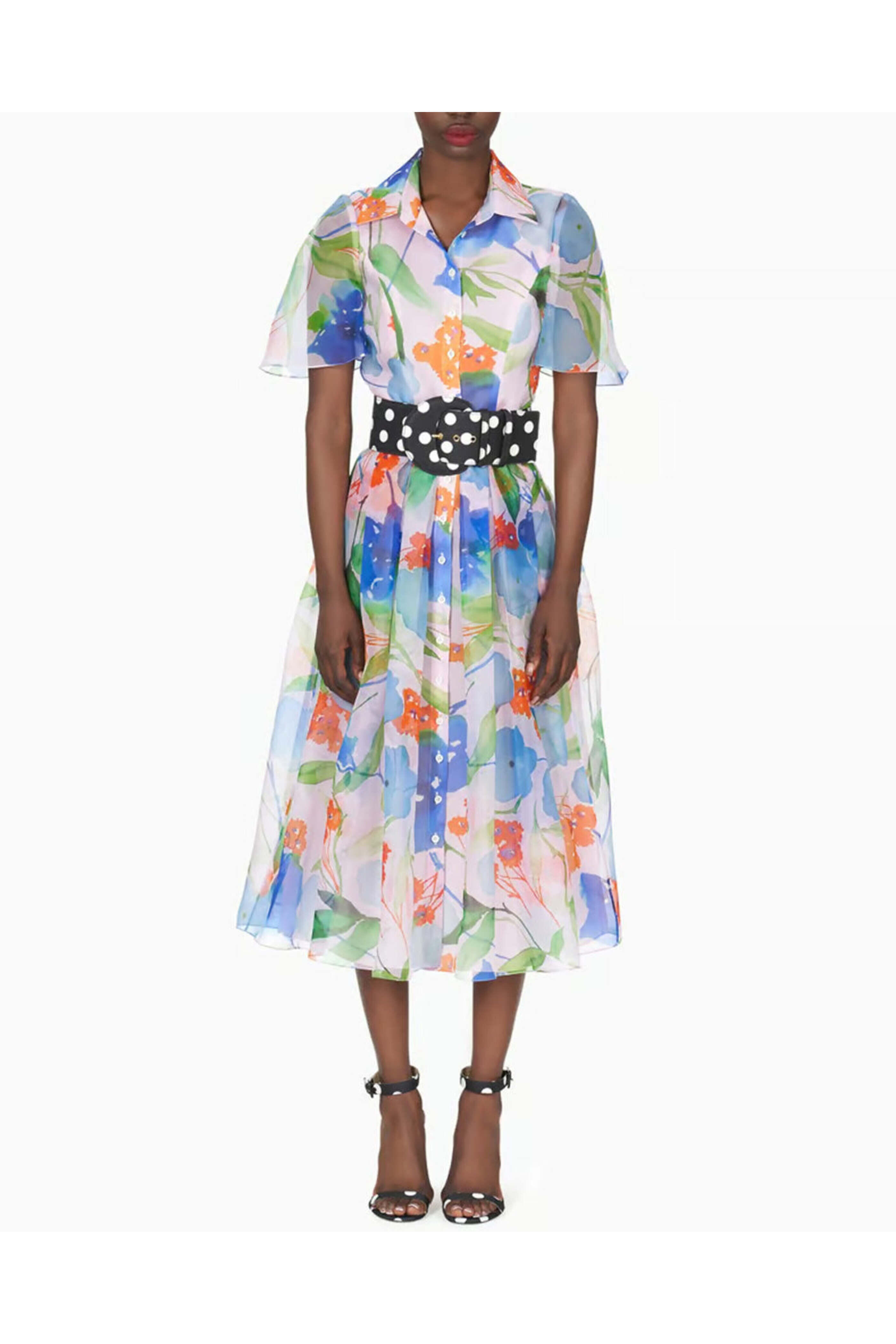 - Carolina Herrera Blush Floral Short Sleeve Button Down Midi Dress