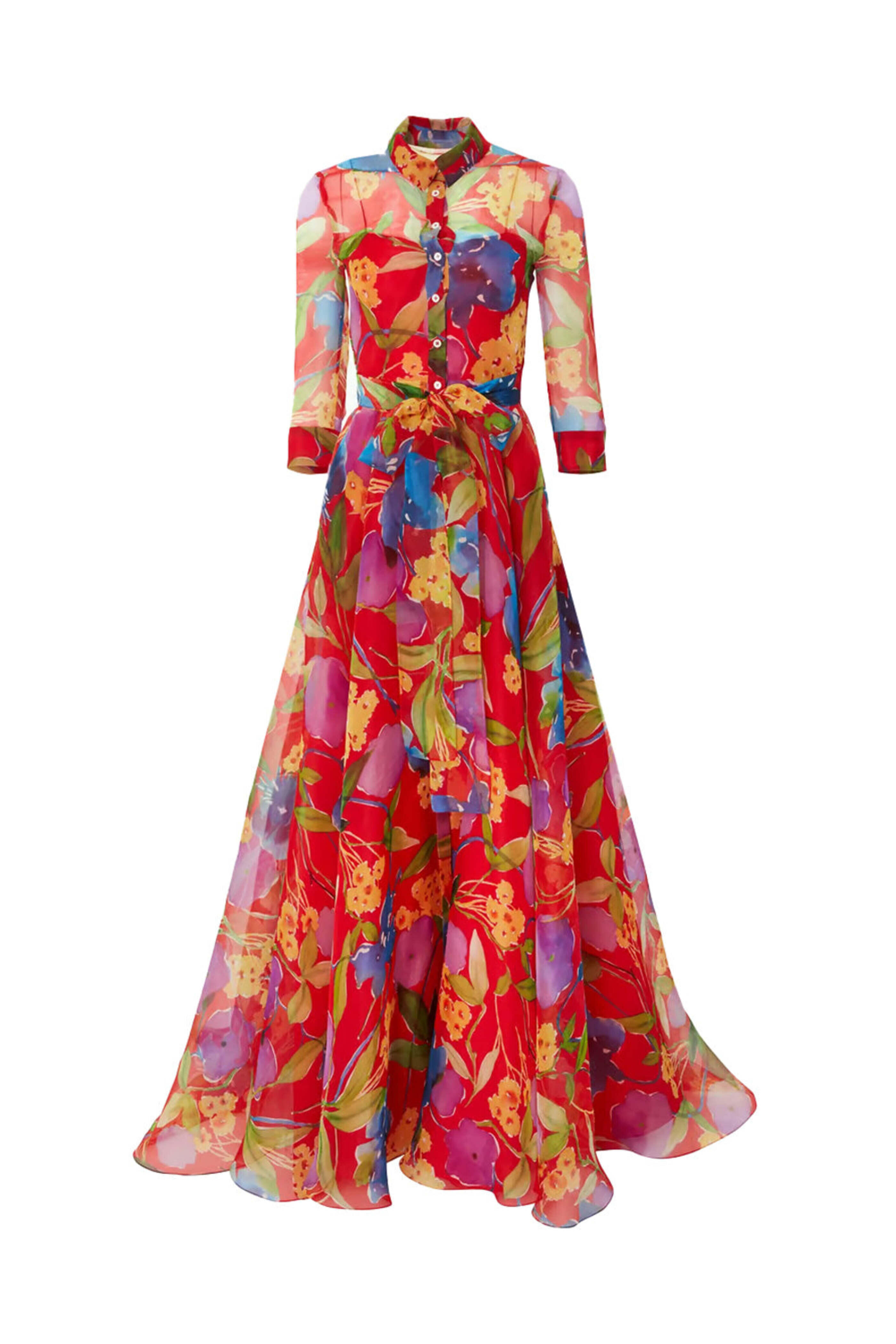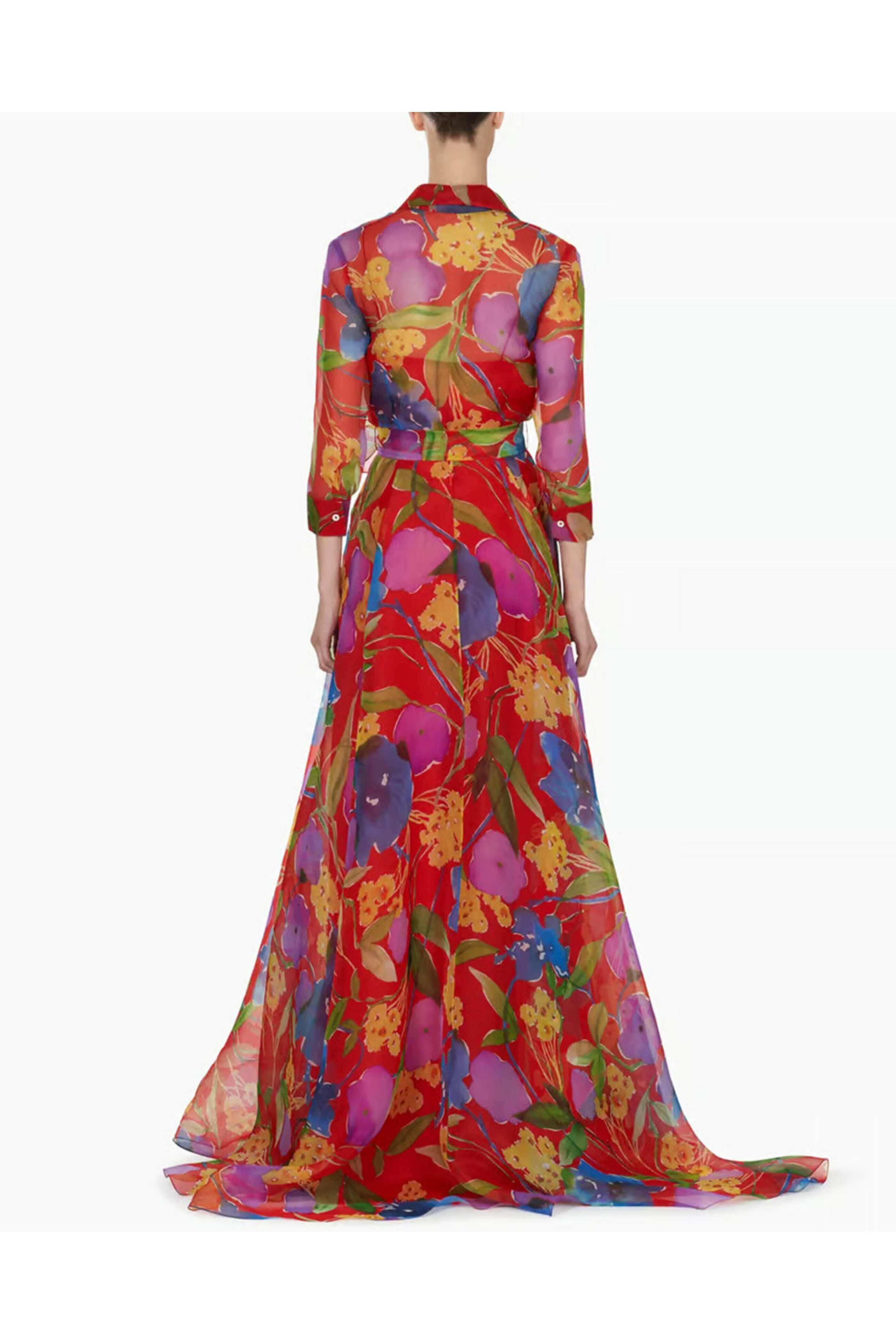 Carolina Herrera Lacquer Red Three Quarter Sleeve Trench Gown. Collar. ¾ length sleeves; button cuffs. Button down front closure. Tie detail at waist. Side slip pockets. Full skirt. Maxi length. Lined/ slip included. Made in USA. 100% silk.