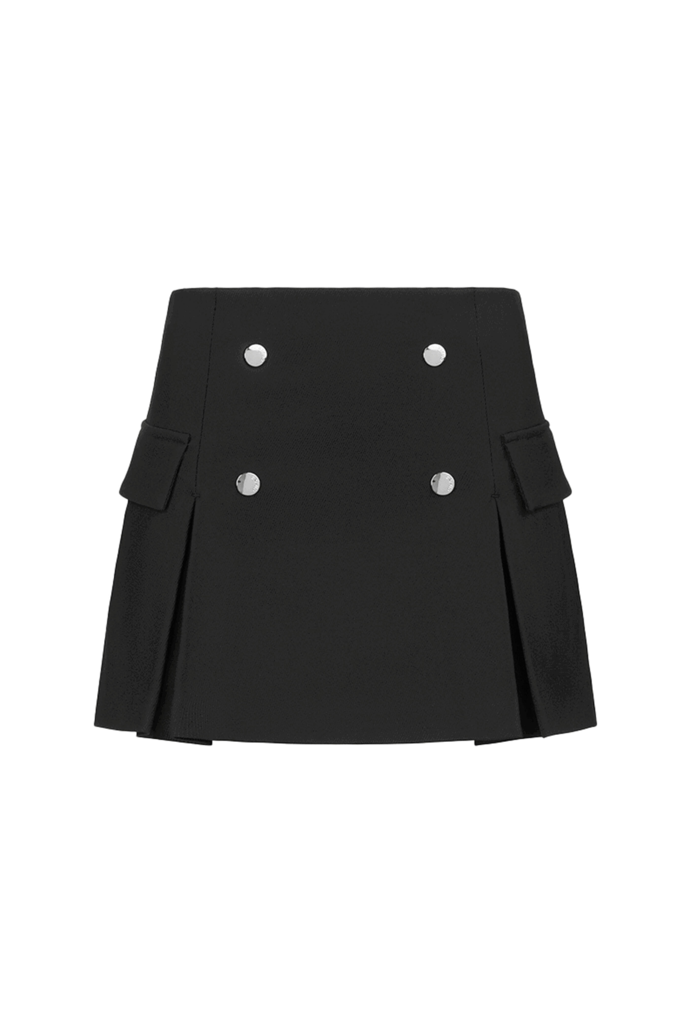 STAUD Division Skirt in Black. Mini length. Metal logo snap details. Side cargo pockets. Concealed back zip closure. 60% polyester, 29% rayon, 3% spandex.