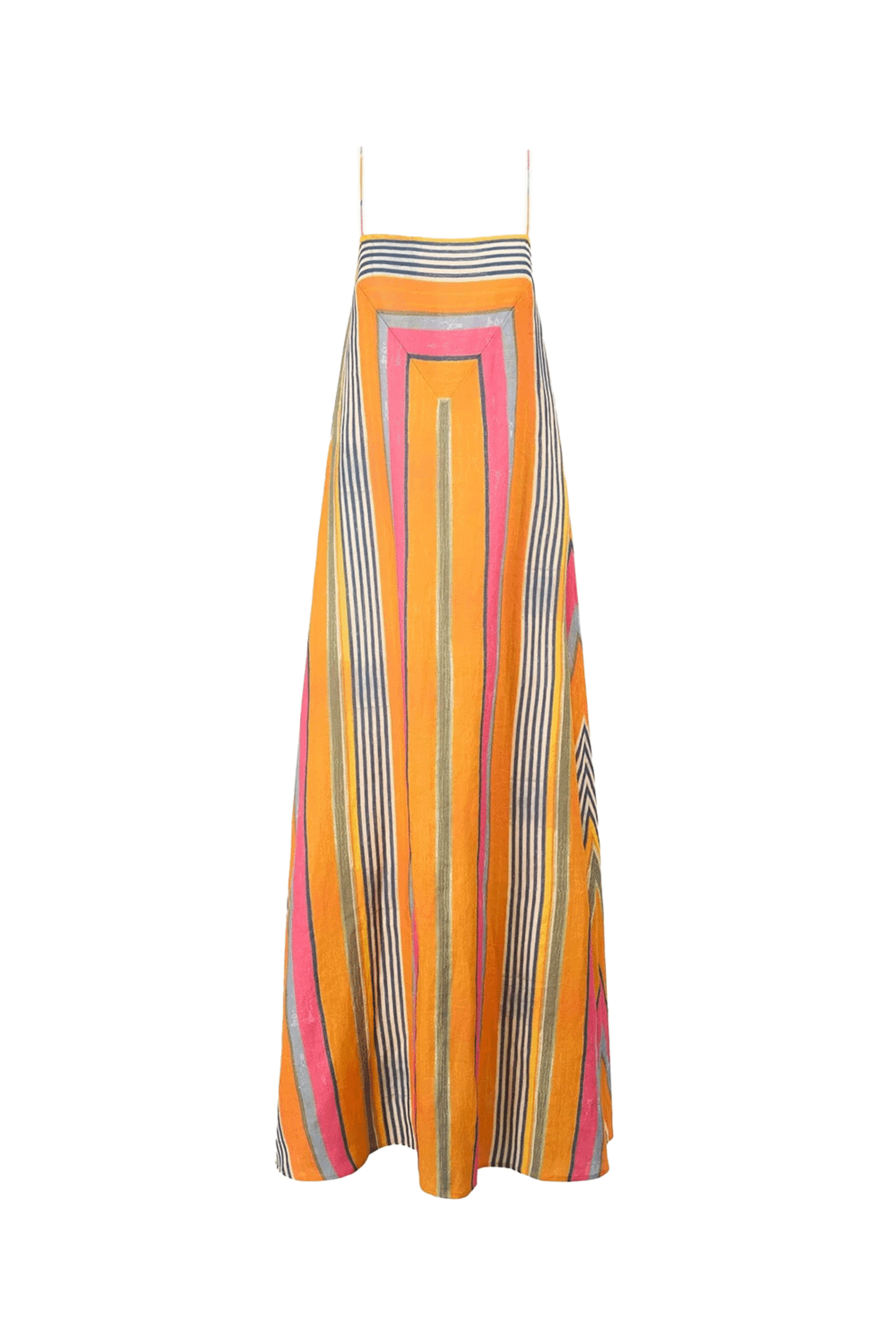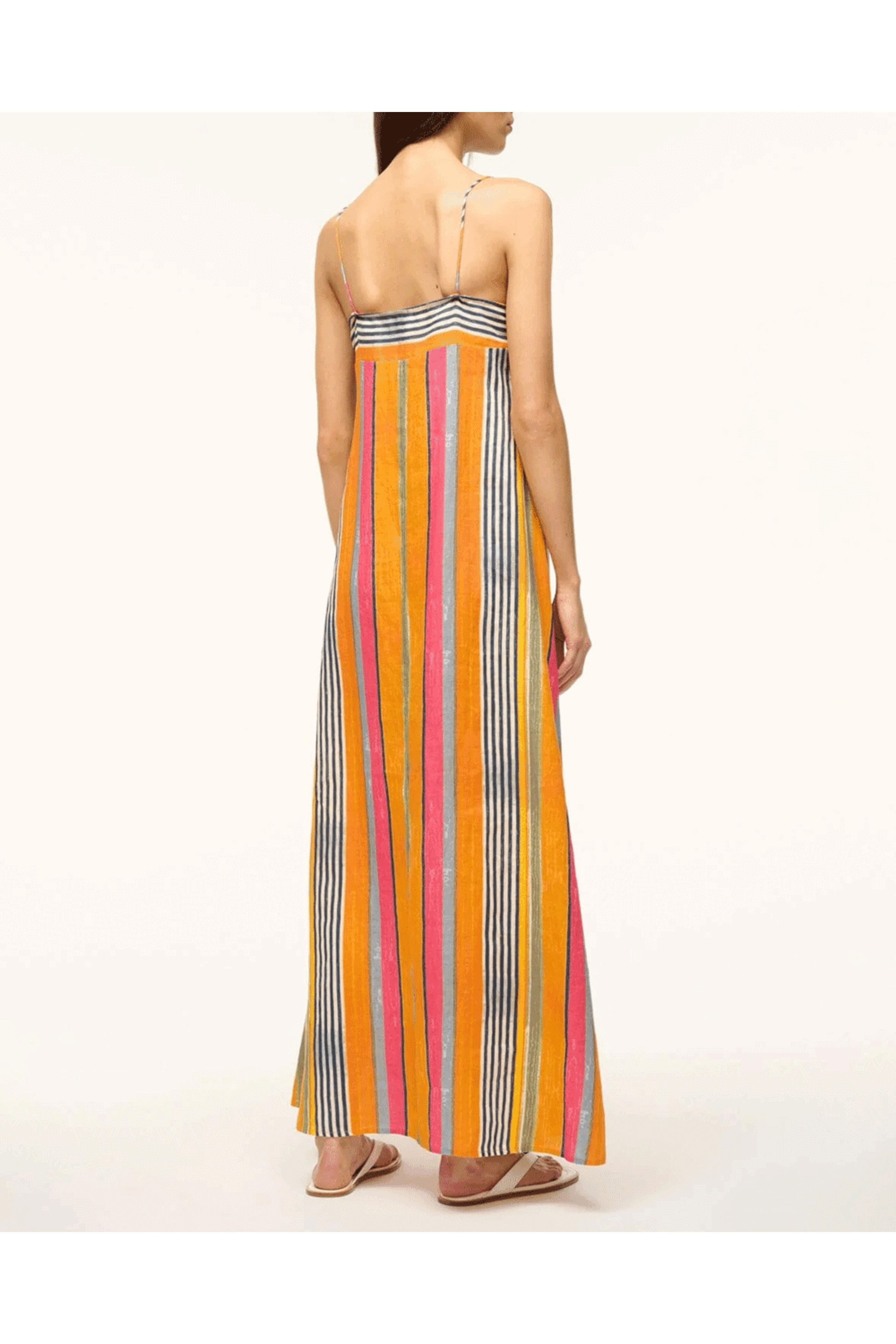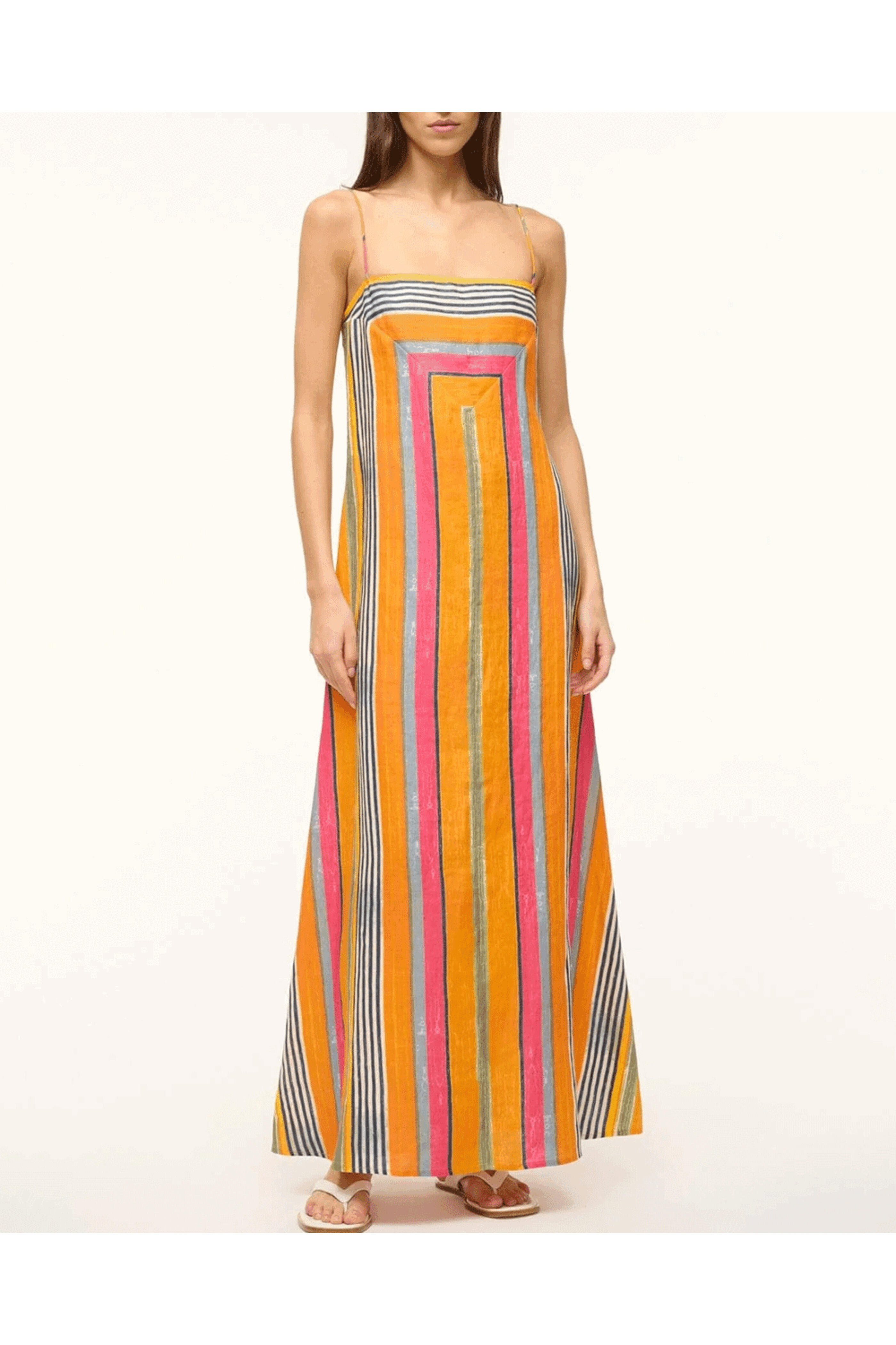 STAUD Multibayadere Stripe Laura Dress. Straight neckline. Sleeveless; thin shoulder straps. Relaxed fit. Maxi length. 100% linen.