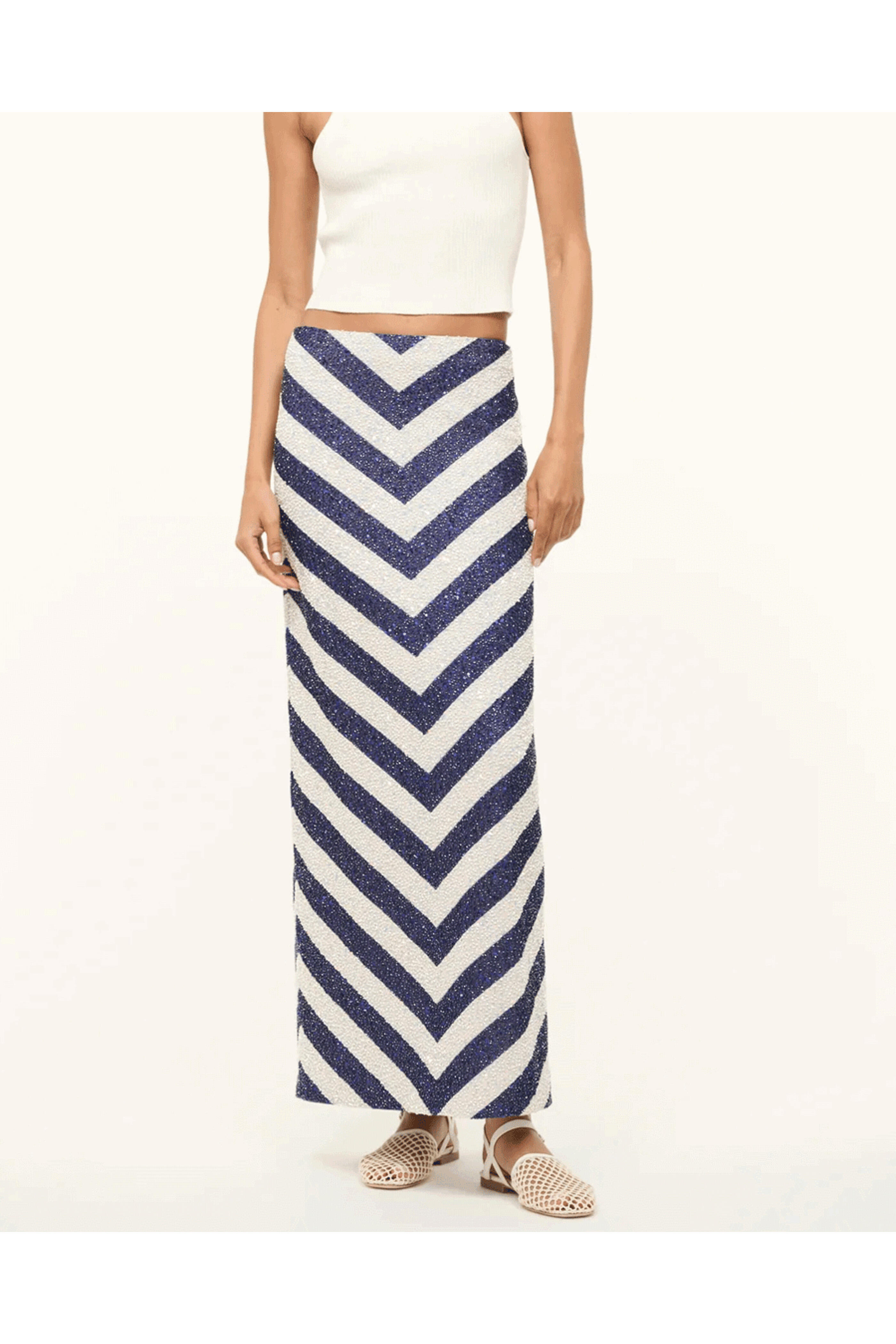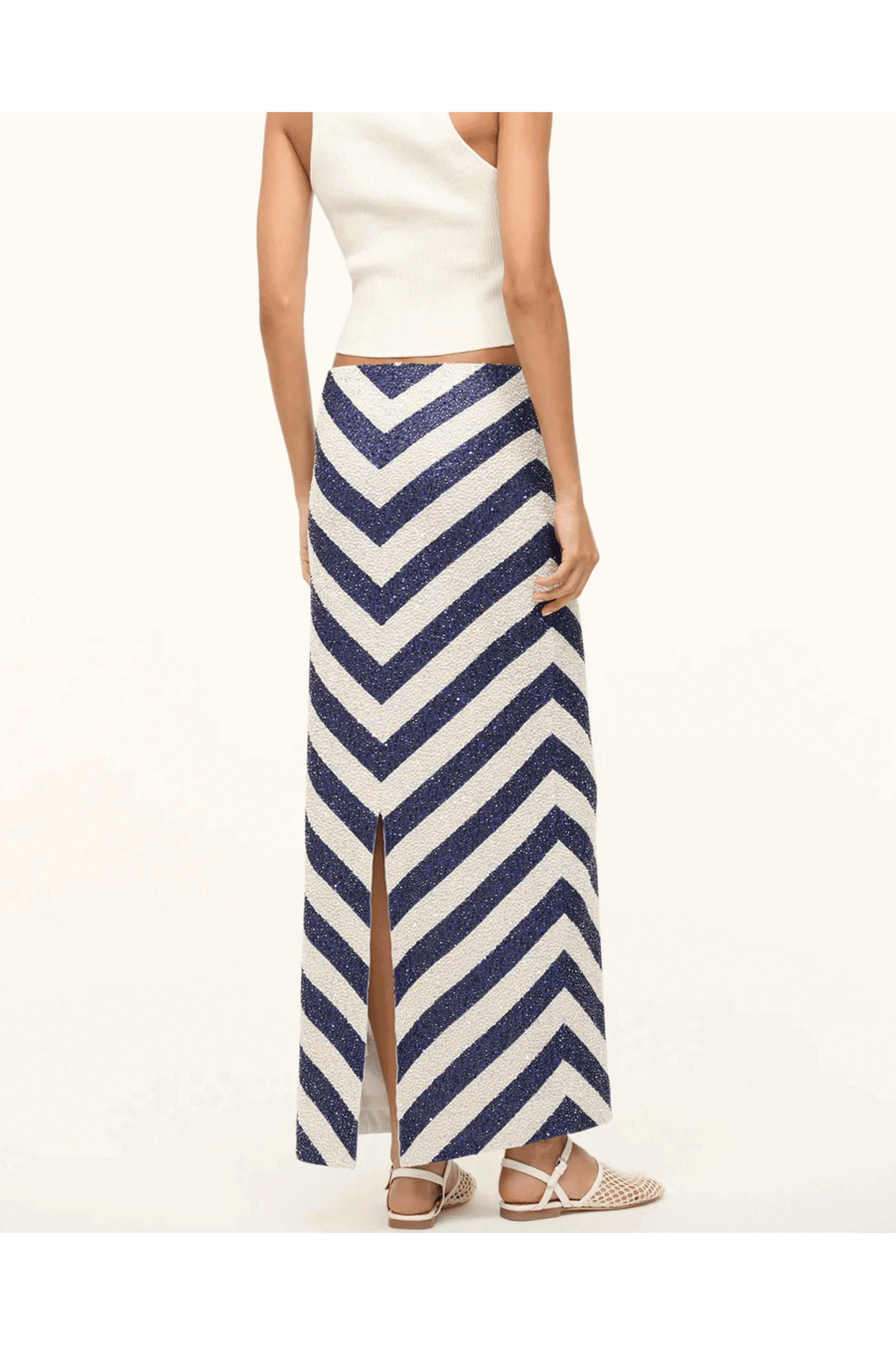 STAUD Horizon St. Tropez Skirt . Mid rise. Elastic waistband. Skirt cut on the bias. Slim fit. Ankle length. Lined. Face: 95% nylon, 5% elastane; Base: 100% glass beads.