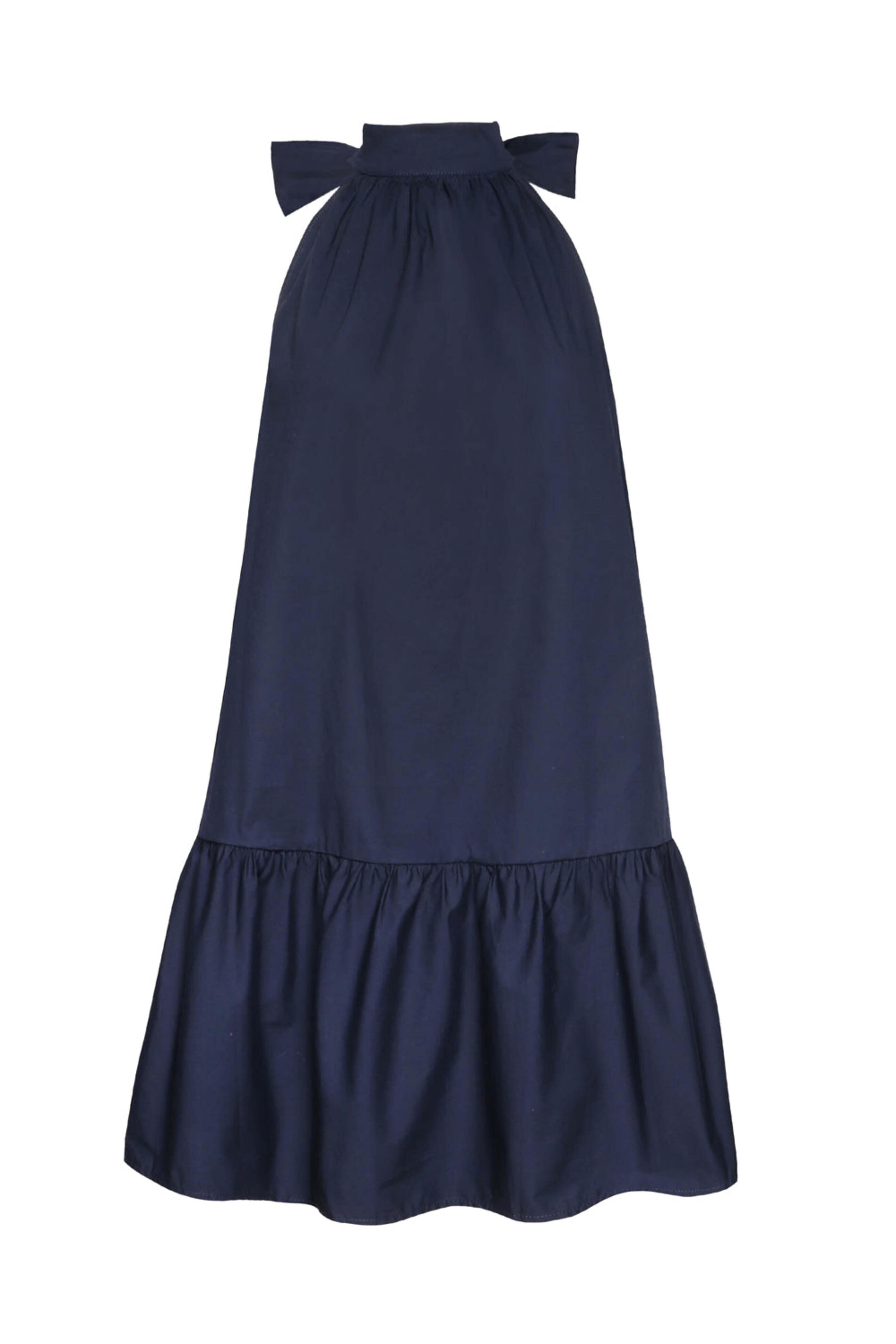 STAUD Navy Marlowe Mini Dress. High neck. Back self-tie closure. Sleeveless. Aline silhouette. Flounce hem. Mini length. 98% cotton, 2% spandex.