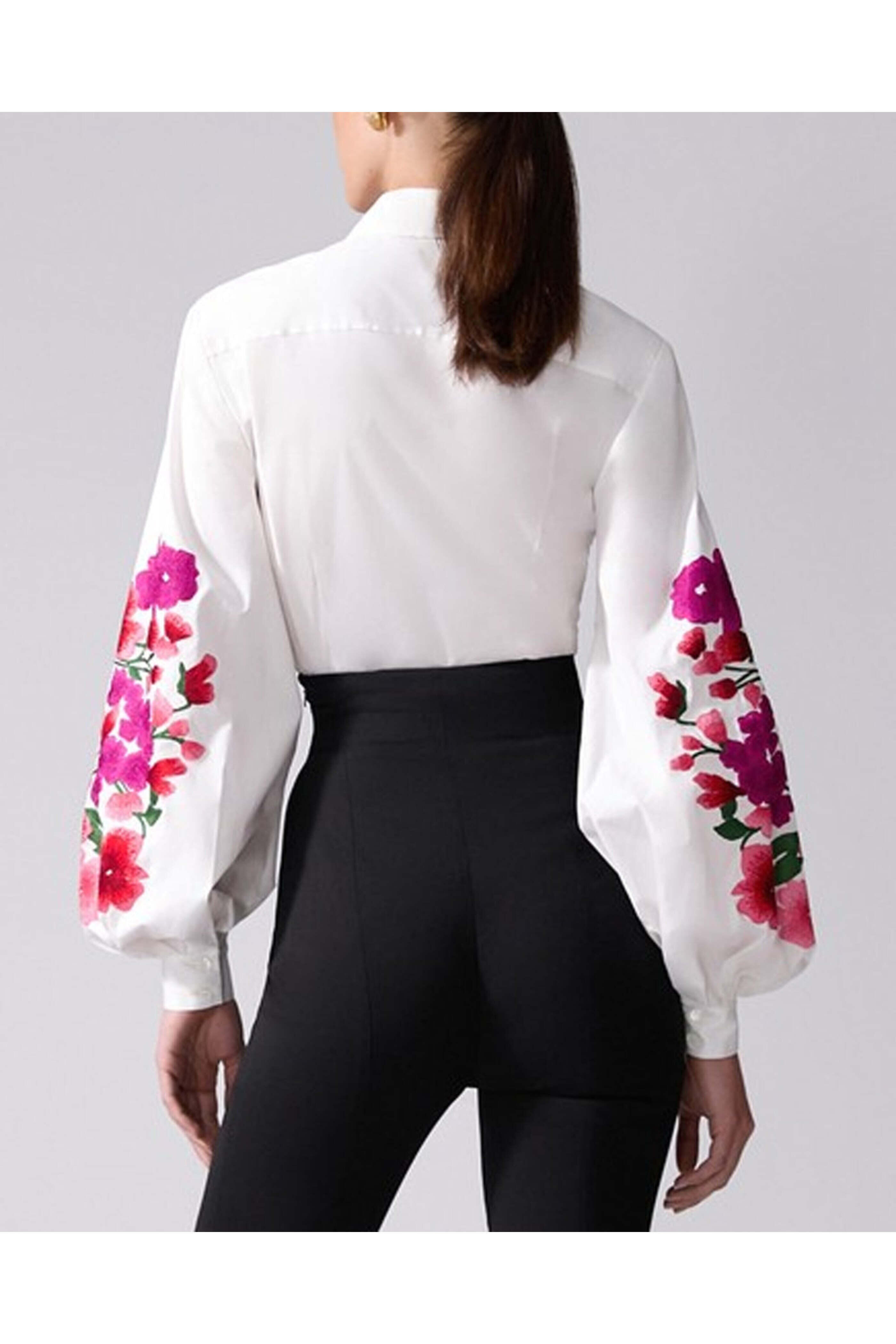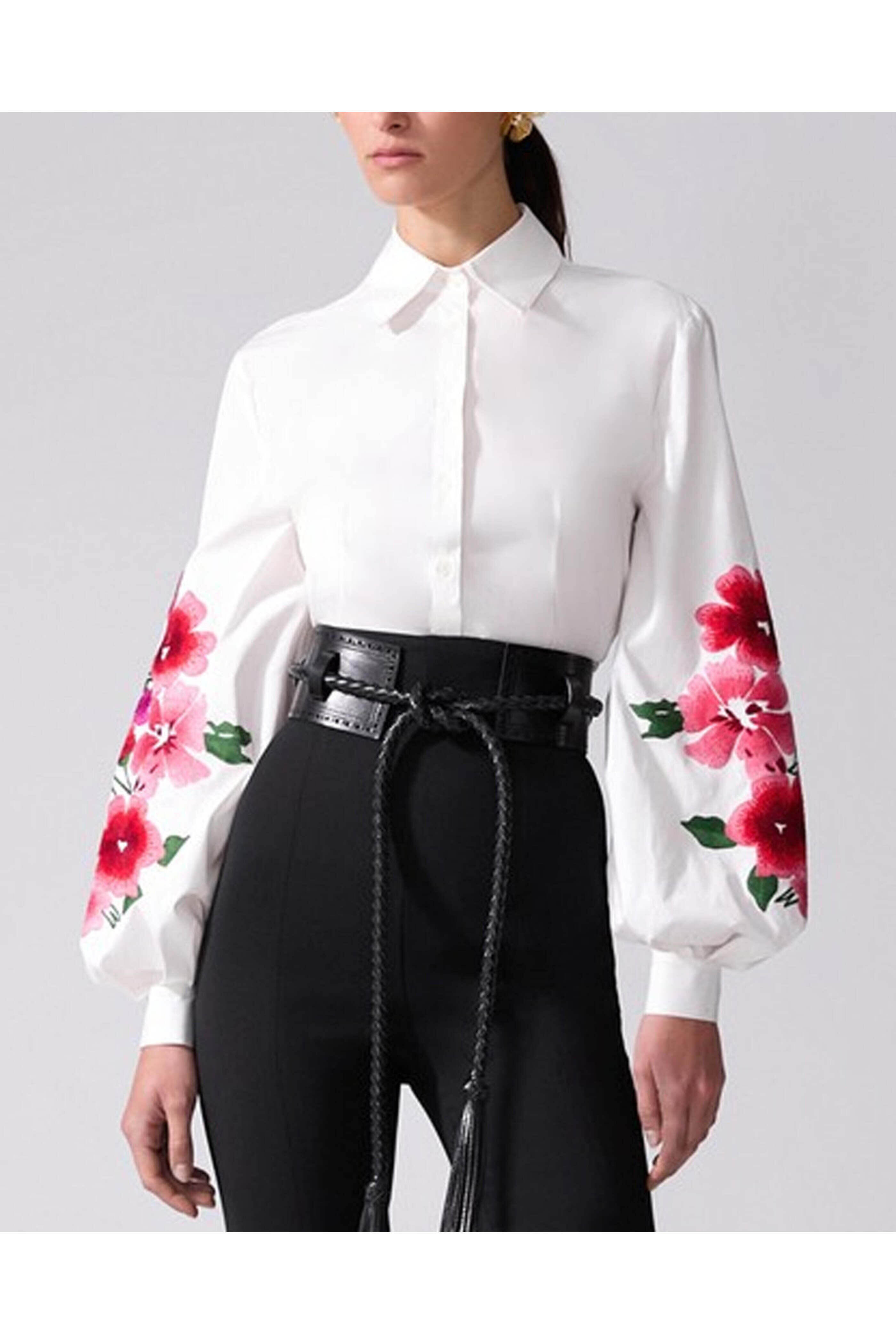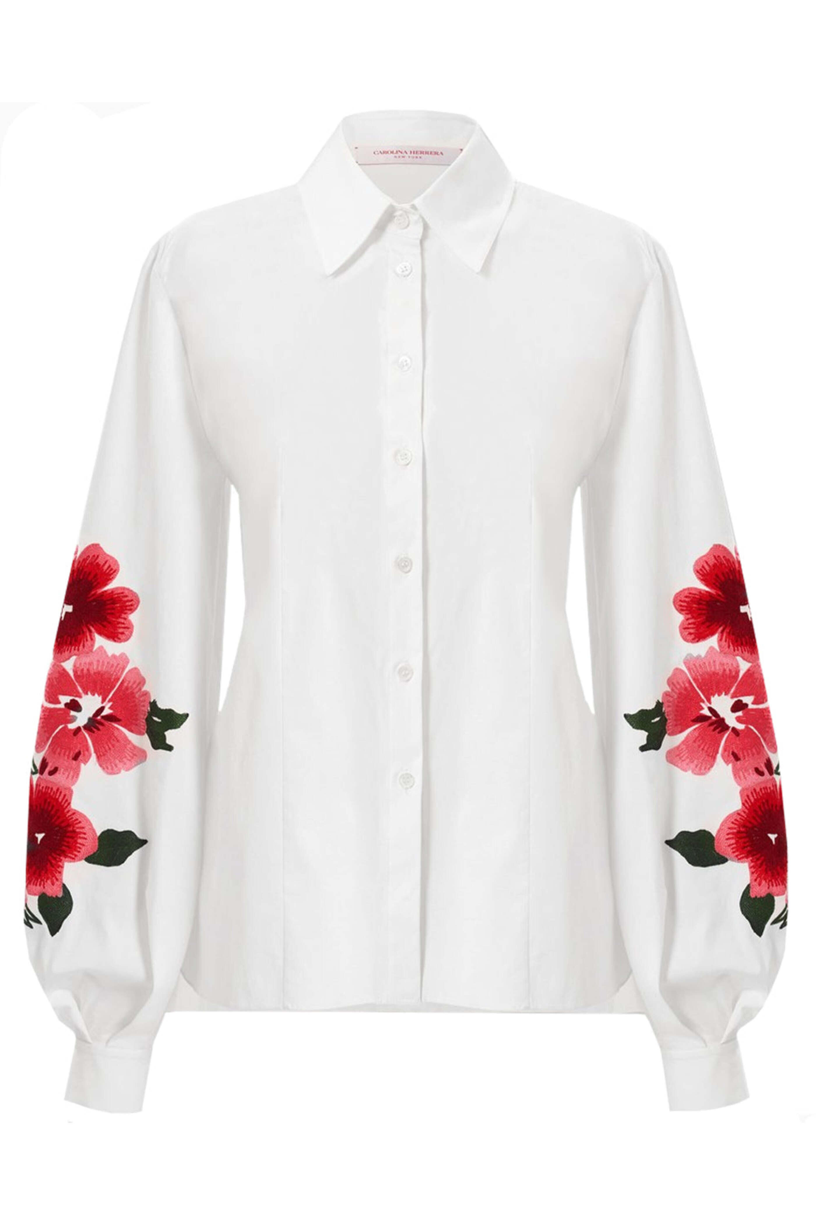 Carolina Herrera White Embellished Puff Sleeve Button Down Shirt. Collar. Long puff sleeves; button cuffs. Button down front closure. Relaxed fit. Embroidered detail at sleeves. 97% cotton, 3% elastane.
