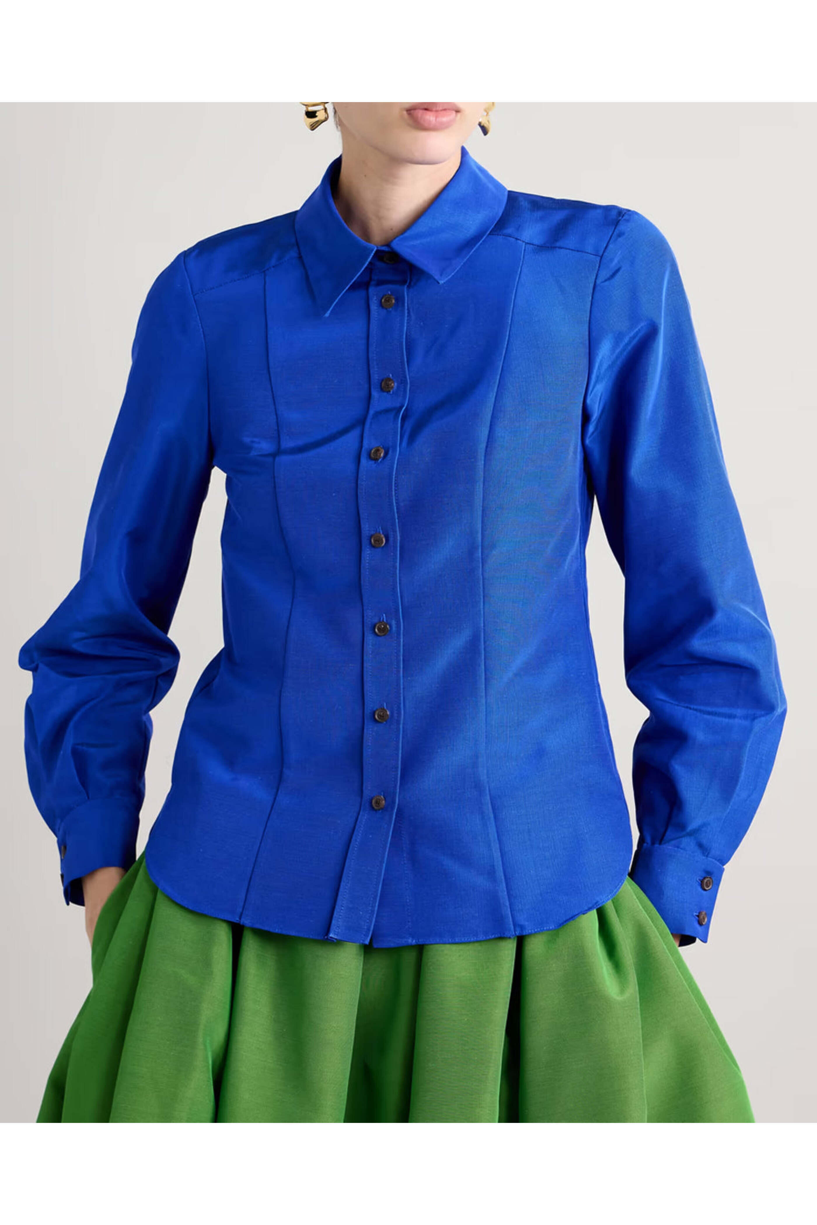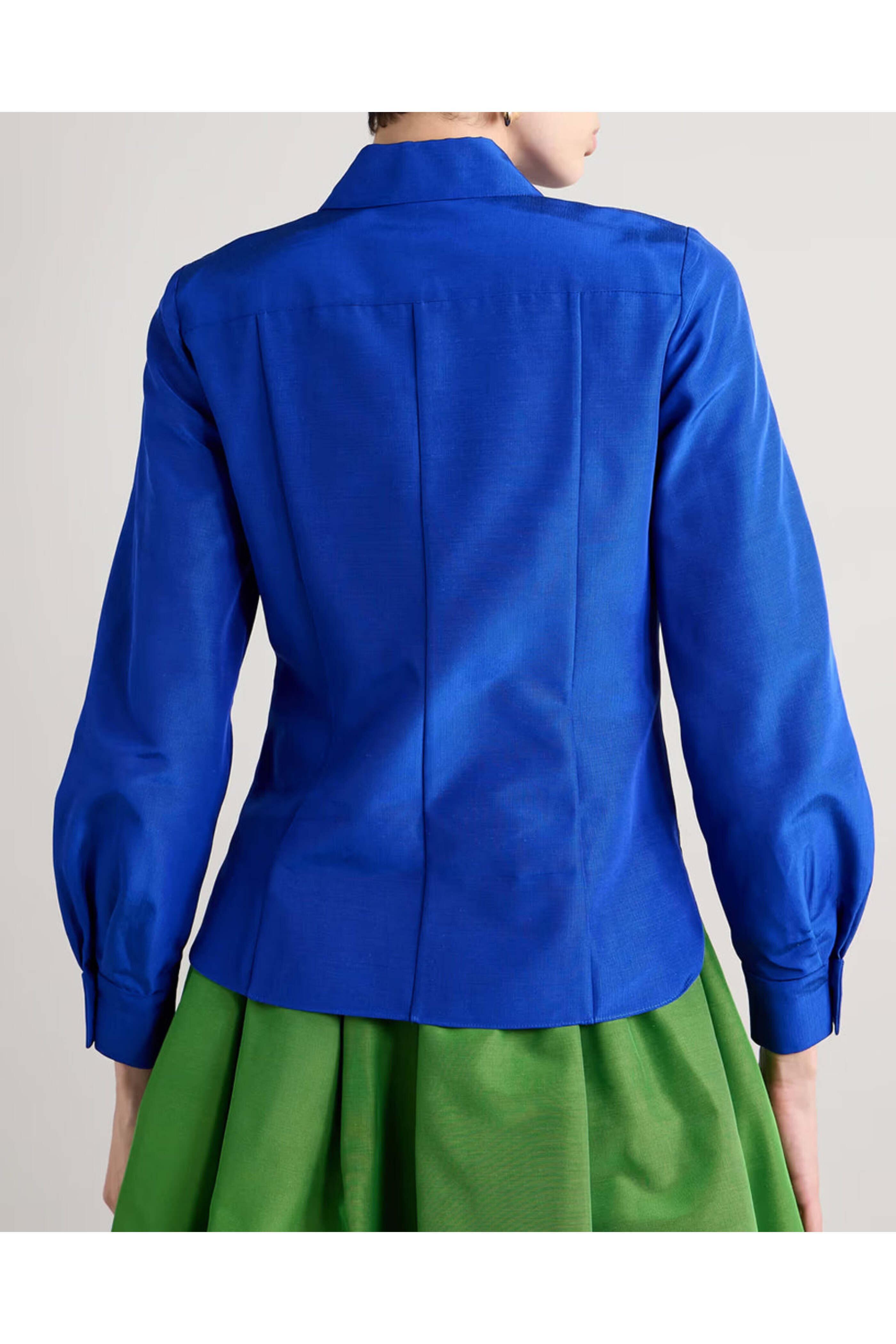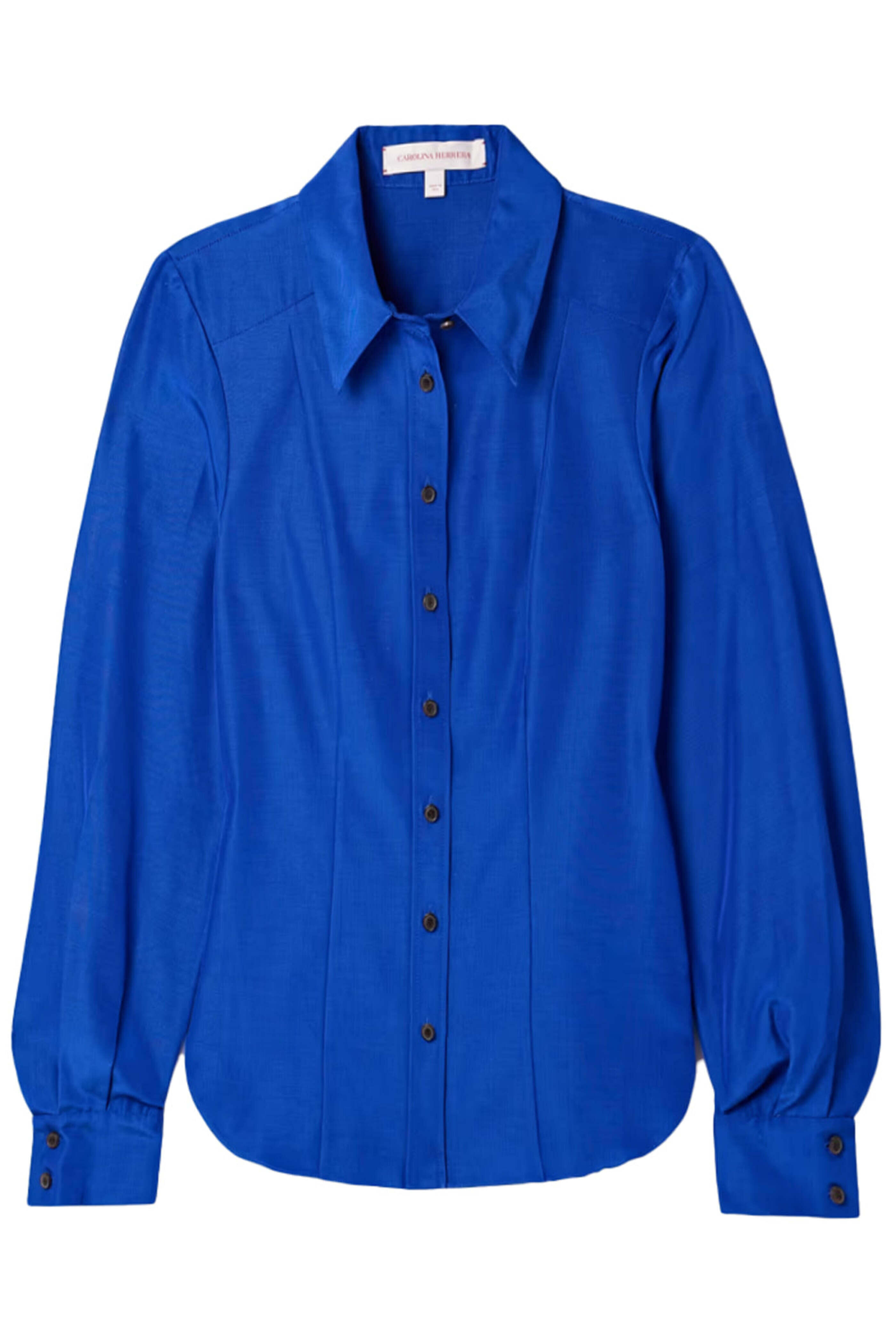 Carolina Herrera Ultra Marine Button Up Shirt. Collar. Long sleeves; button cuffs. Button down front closure. Slim silhouette. Rounded hem. 55% cotton, 45% viscose.