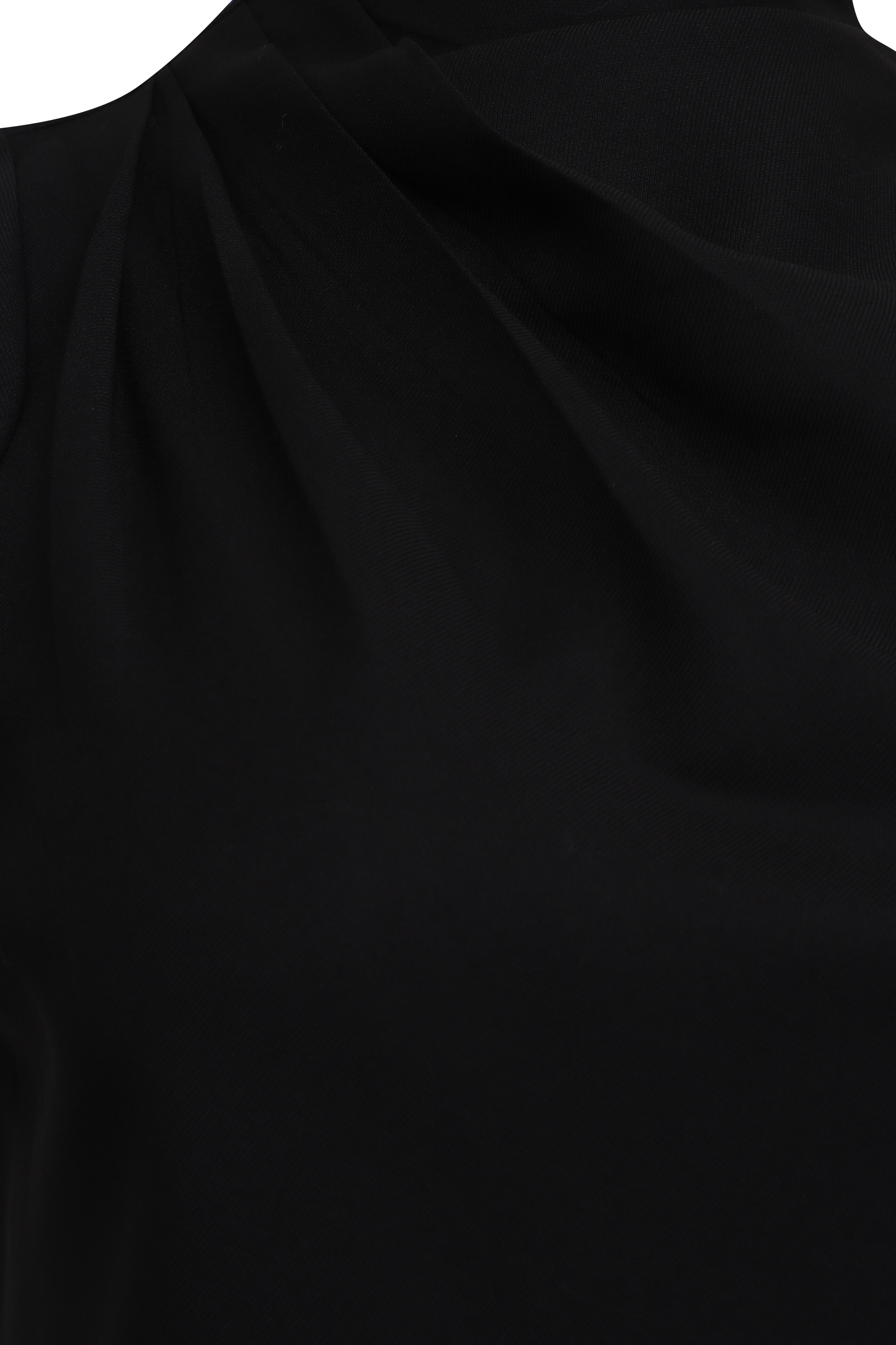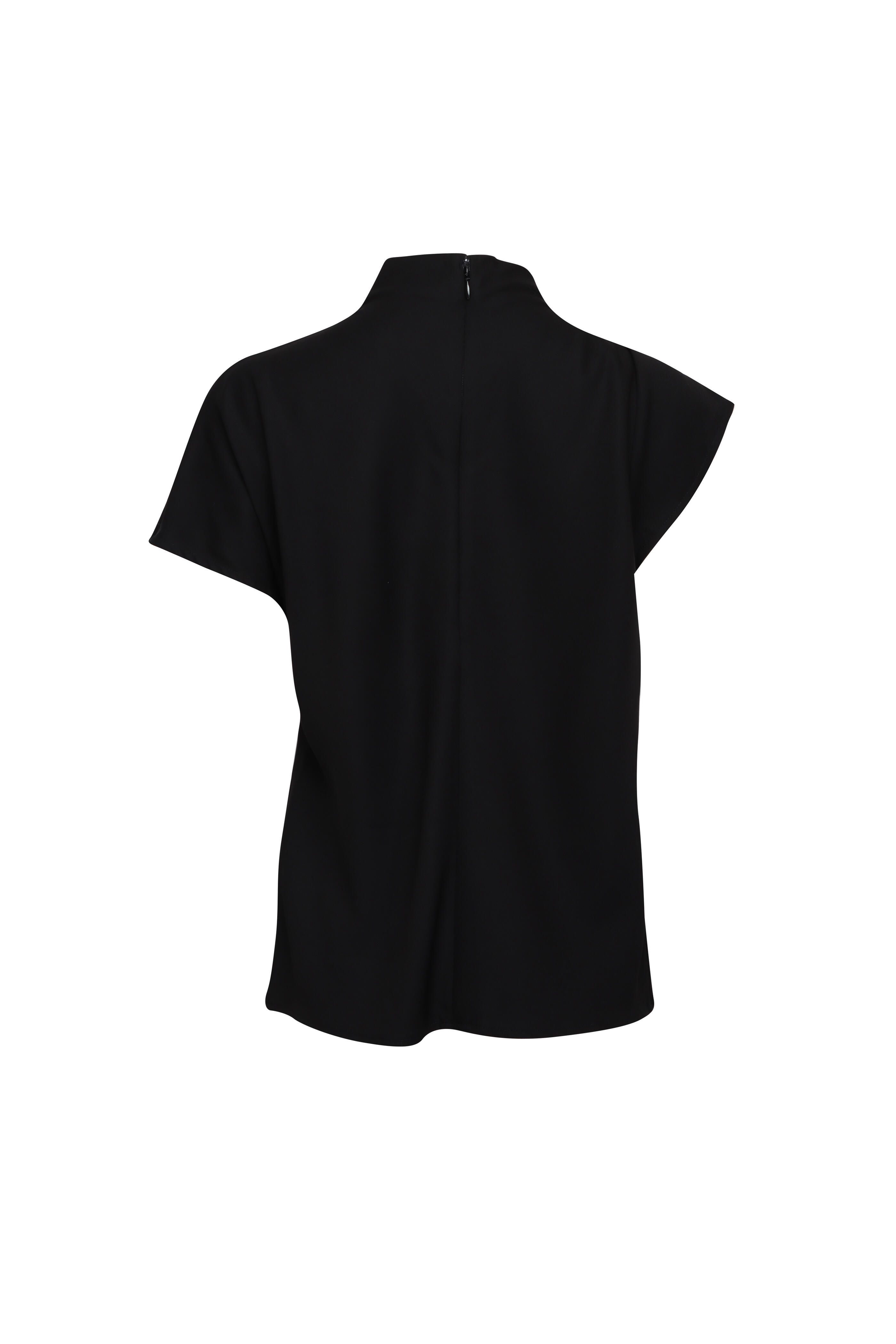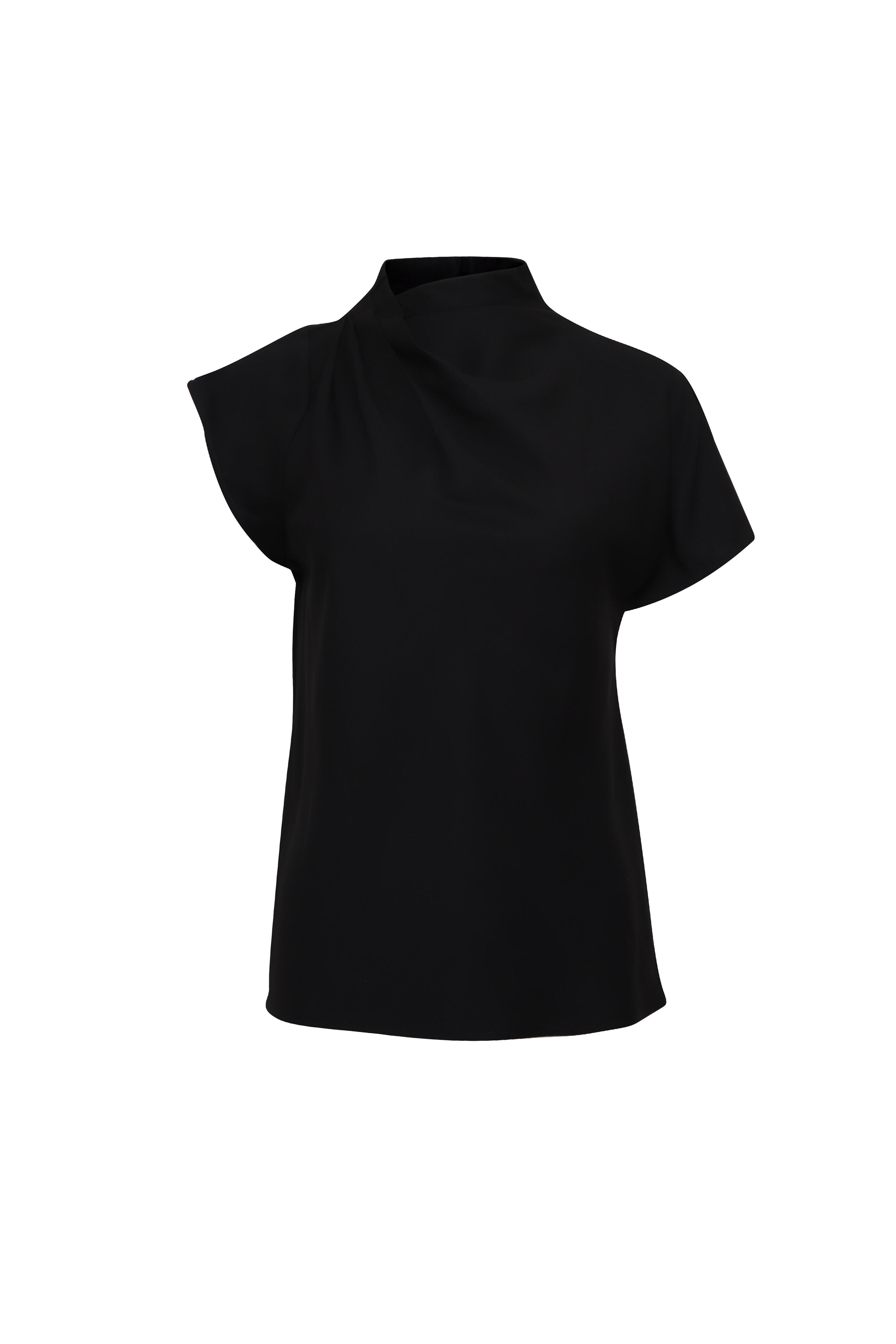 High neck. Ruched at neck. Asymmetrial short dolman sleeves. Concealed back zip closure. Relaxed fit. Straight hem. Imported. 70% acetate, 30% polyester. Dry clean.