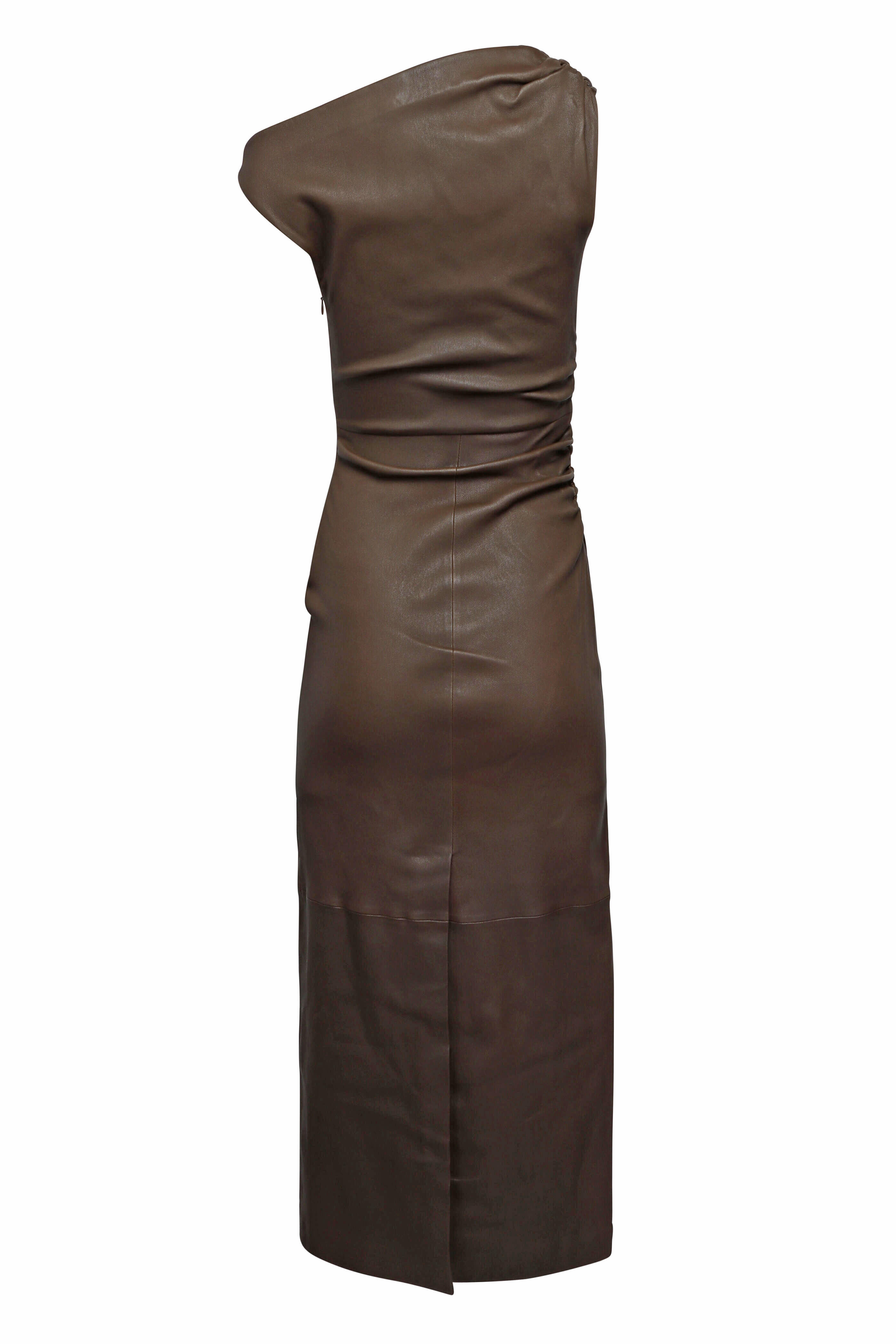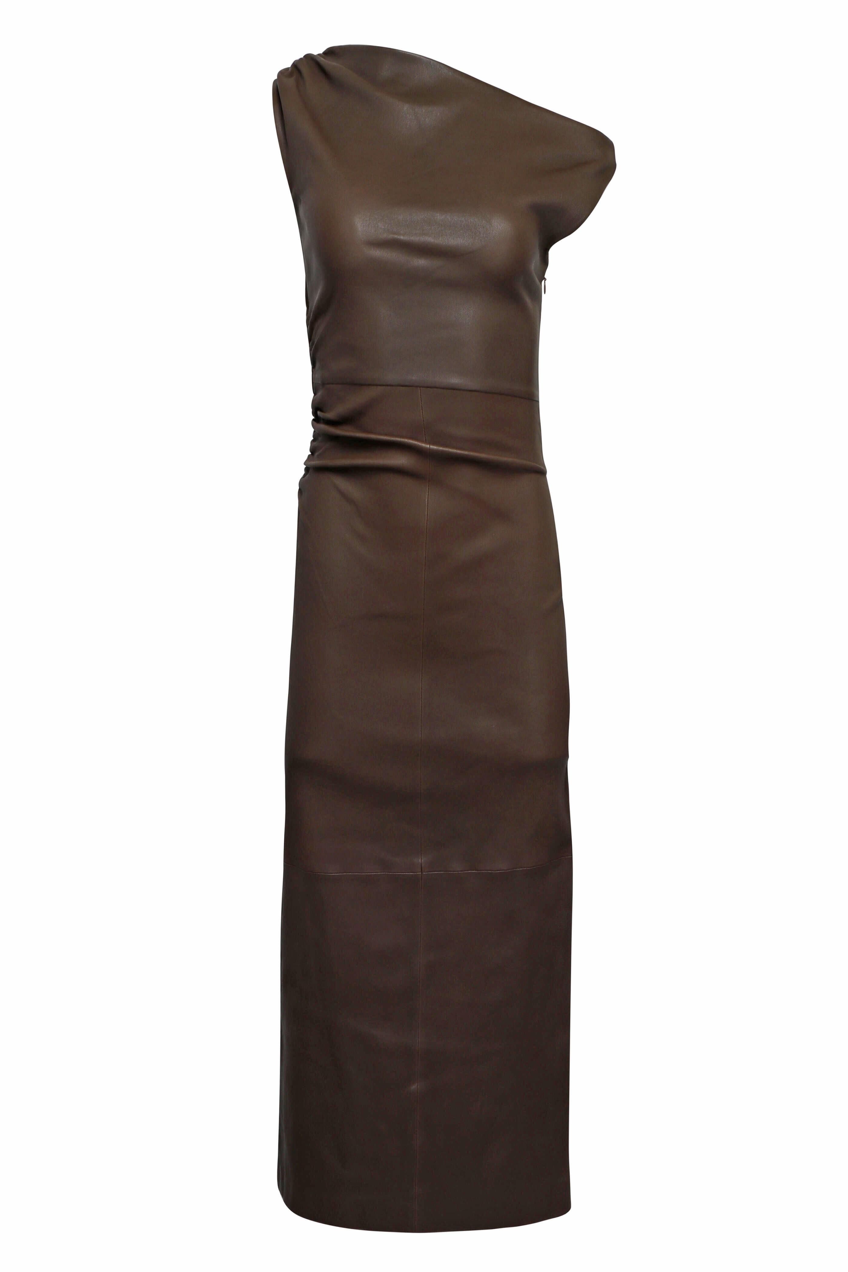 Off the shoulder neckline. Ruched shoulder. Short sleeves. Concealed zip closure. Slim silhouette. Straight hem. Center back hem vent. Imported. Bust 33” (Size S). Waist 30” (Size S). Length 41.8.75” (Size S). 100% leather outer, 97% cotton, 3% elastane bond. Dry clean with leather specialist.