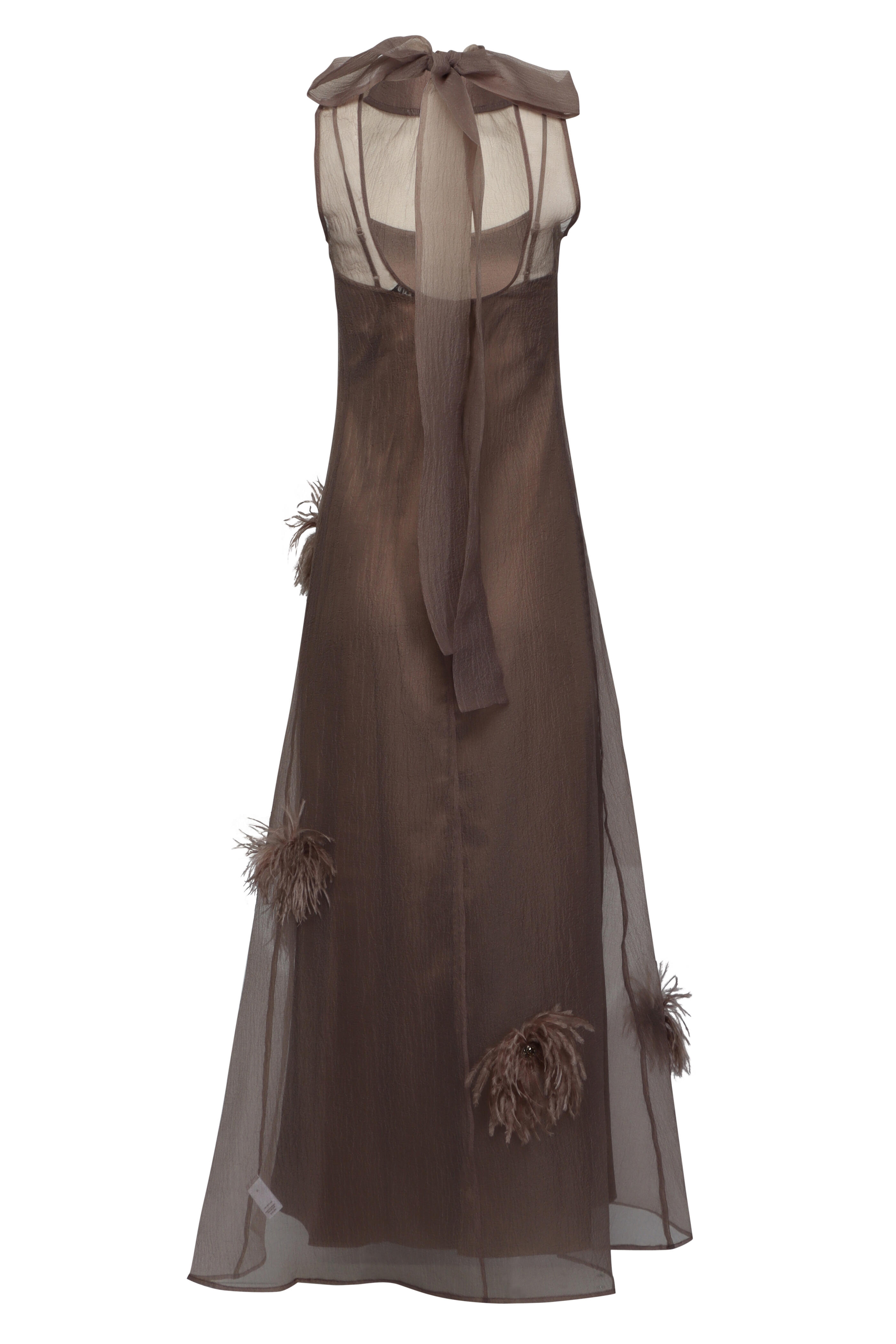 - High neck; back self-tie closure