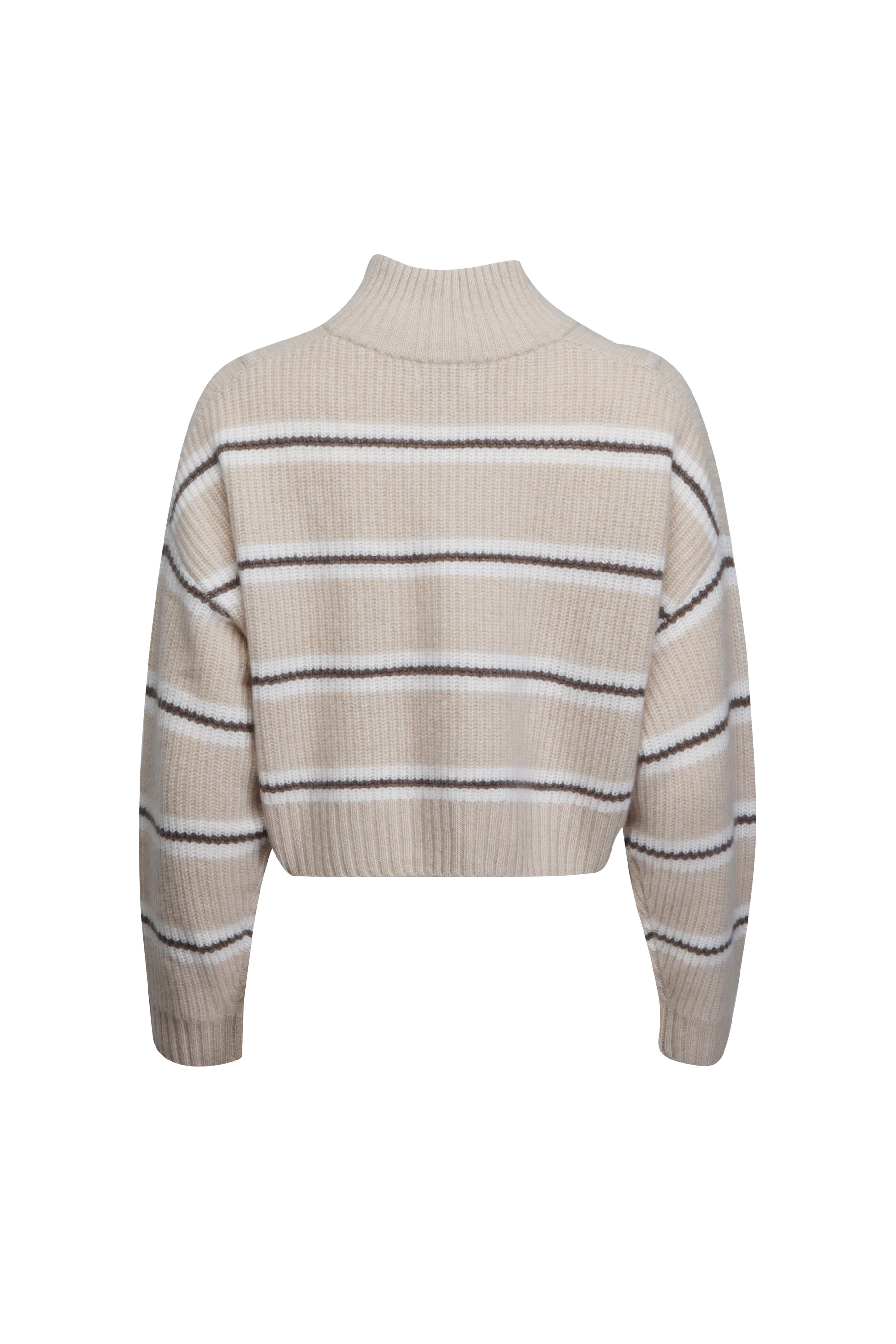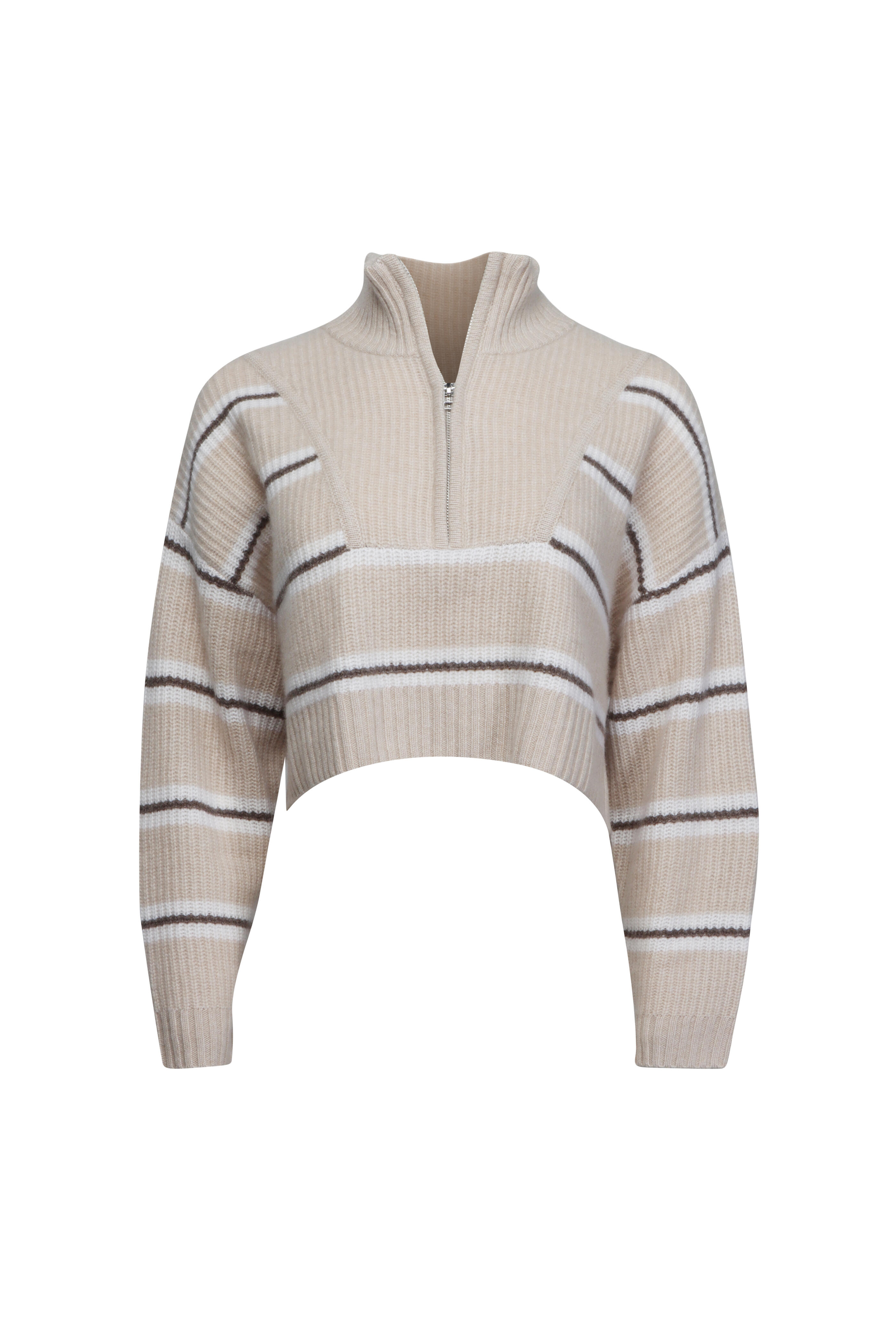 Stand collar. Quarter zip closure. Drop shoulders. Long sleeves. Boxy fit. Ribbed fabrication. Imported. Cropped length. 100% cashmere. Dry clean.