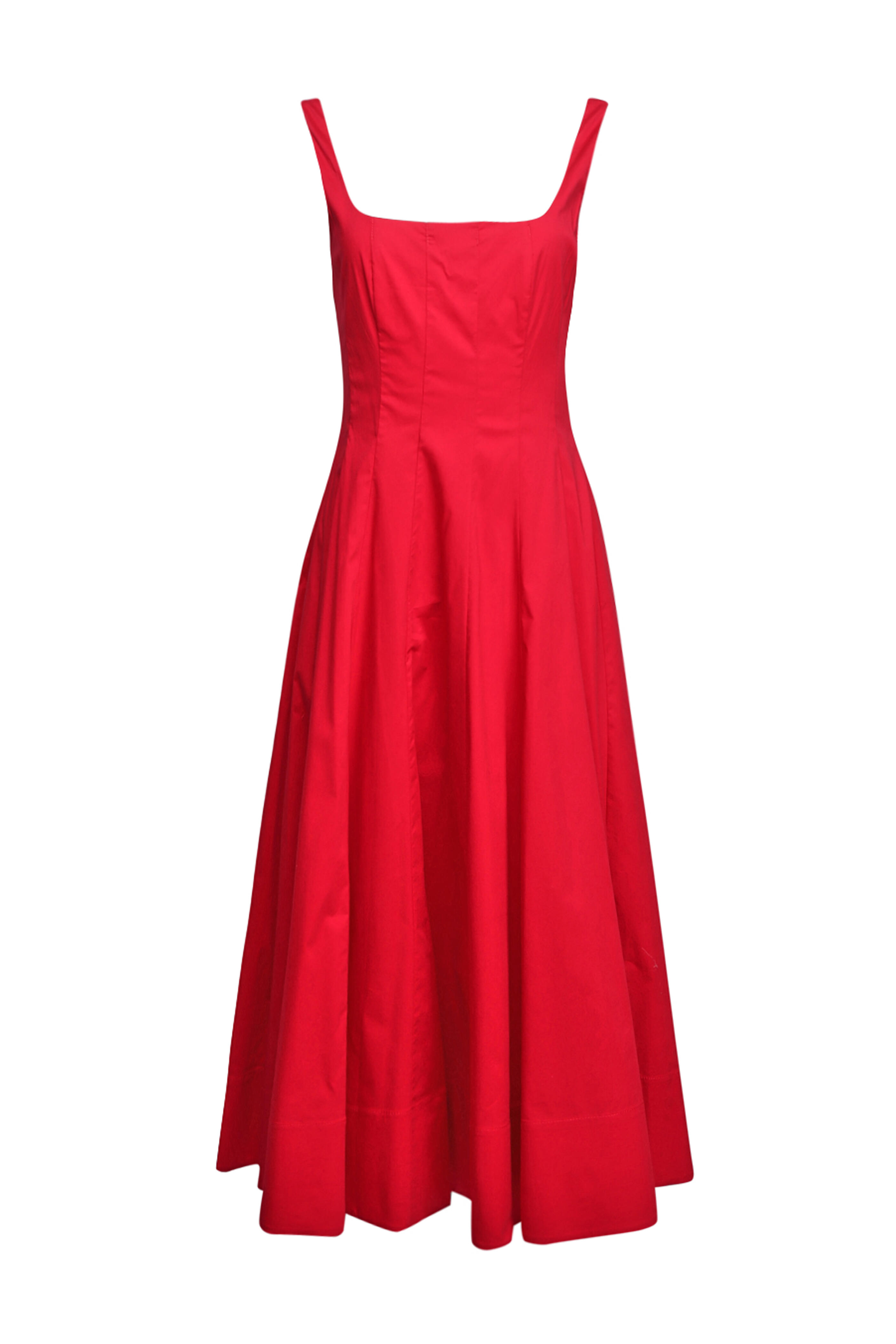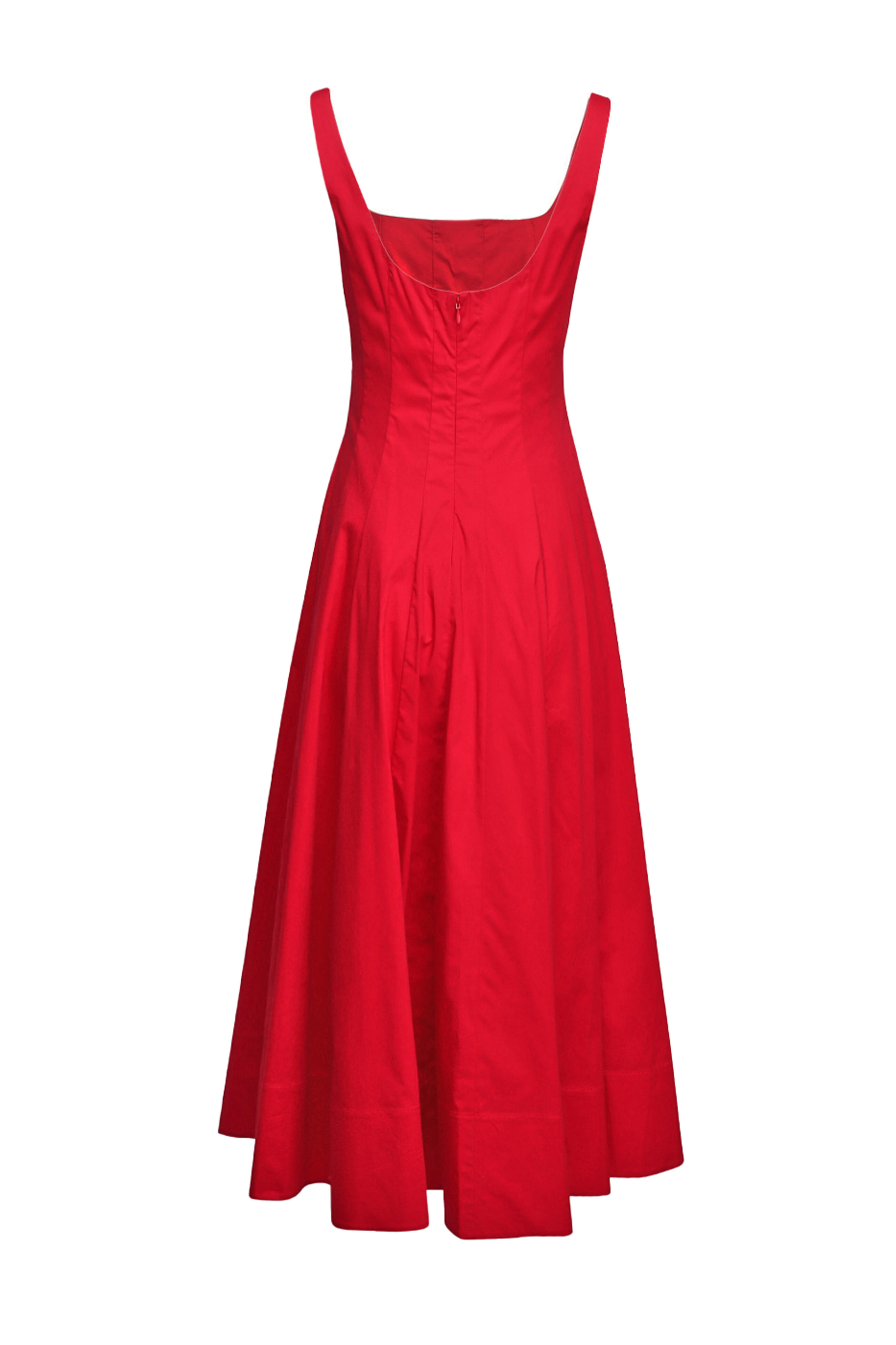 Square neck. Scoop back. Sleeveless. Concealed back zip closure. Paneled fabrication. Imported. Fit and flare silhouette. Midi length. 98% cotton, 2% spandex outer, 100% cotton lining. Dry clean.