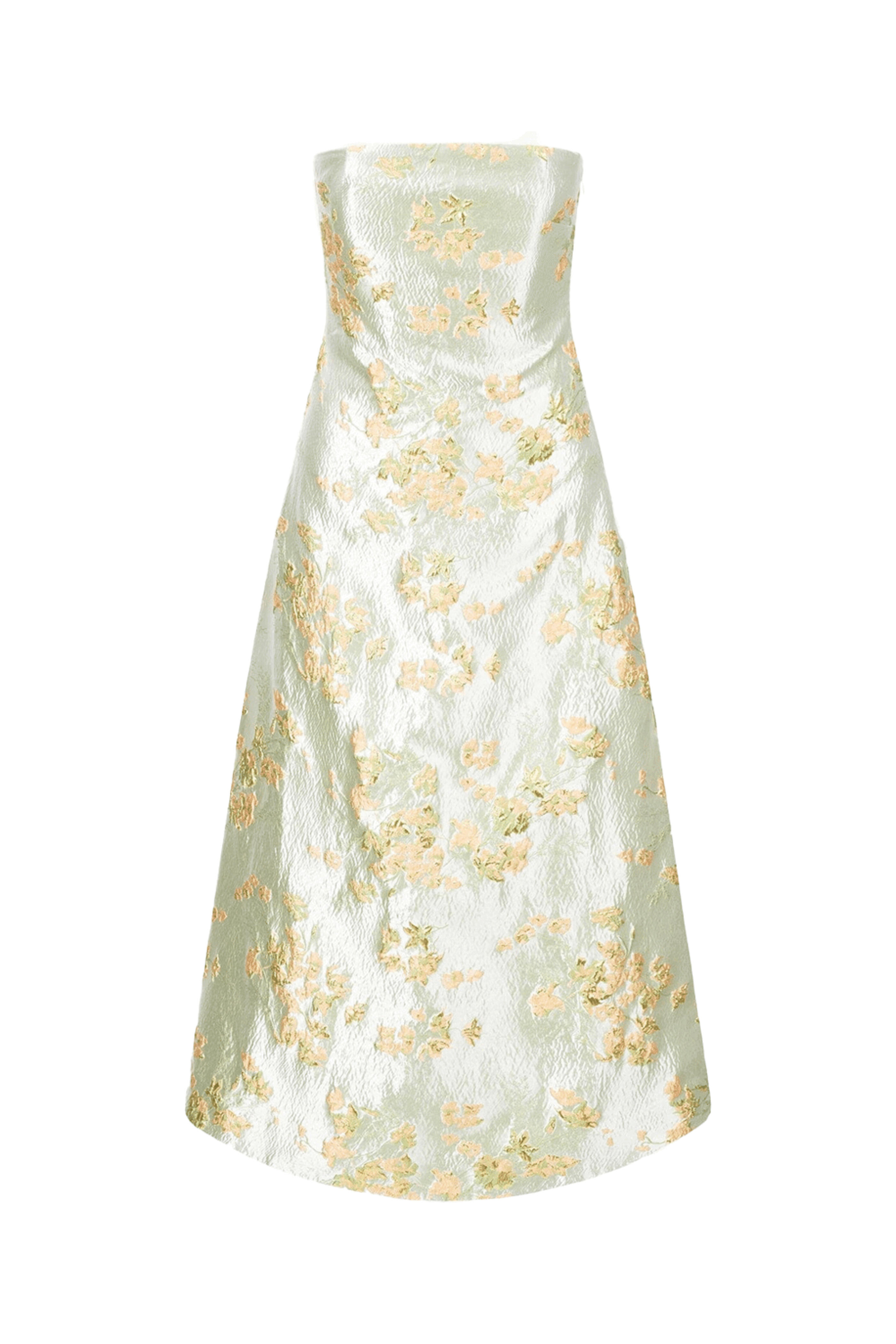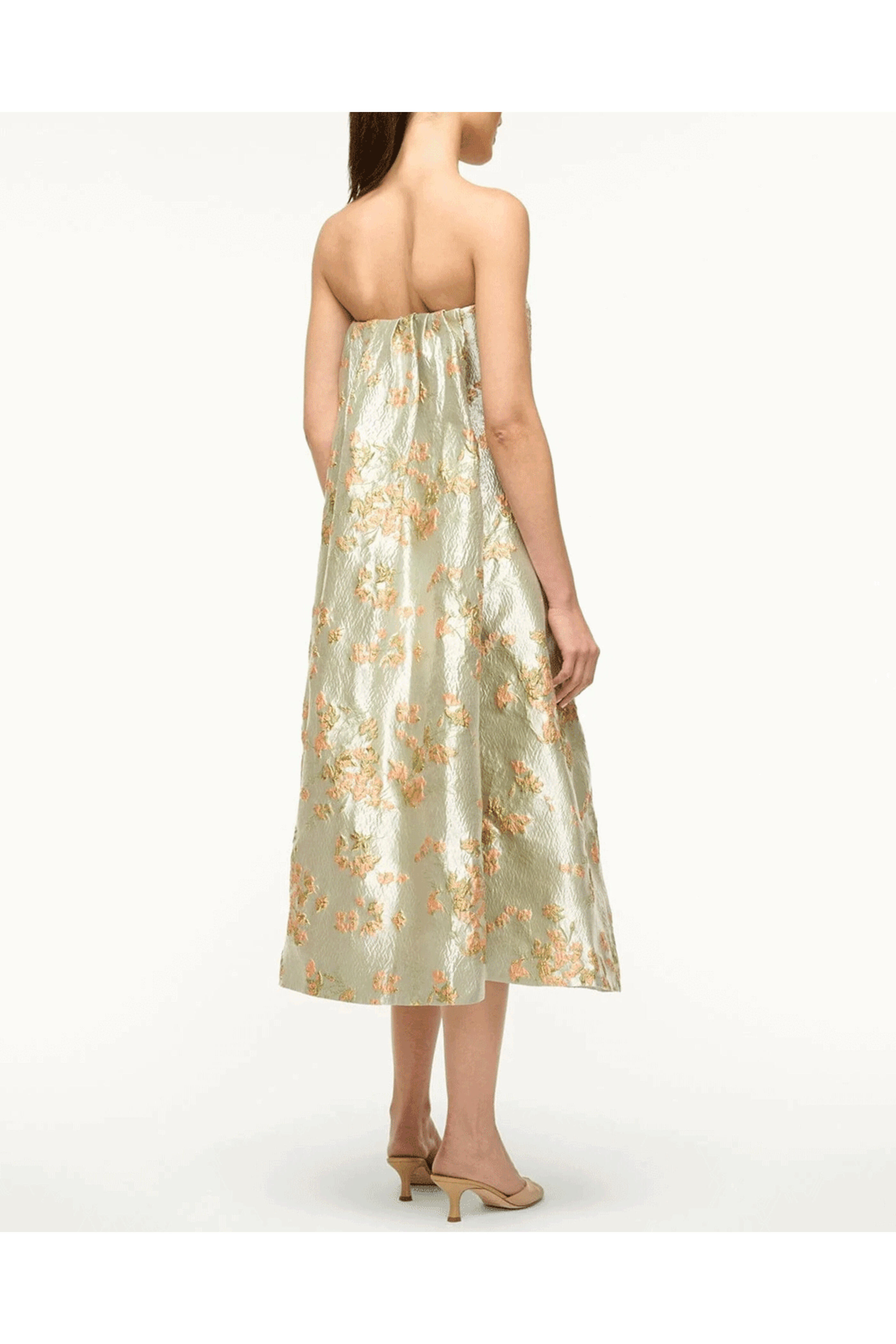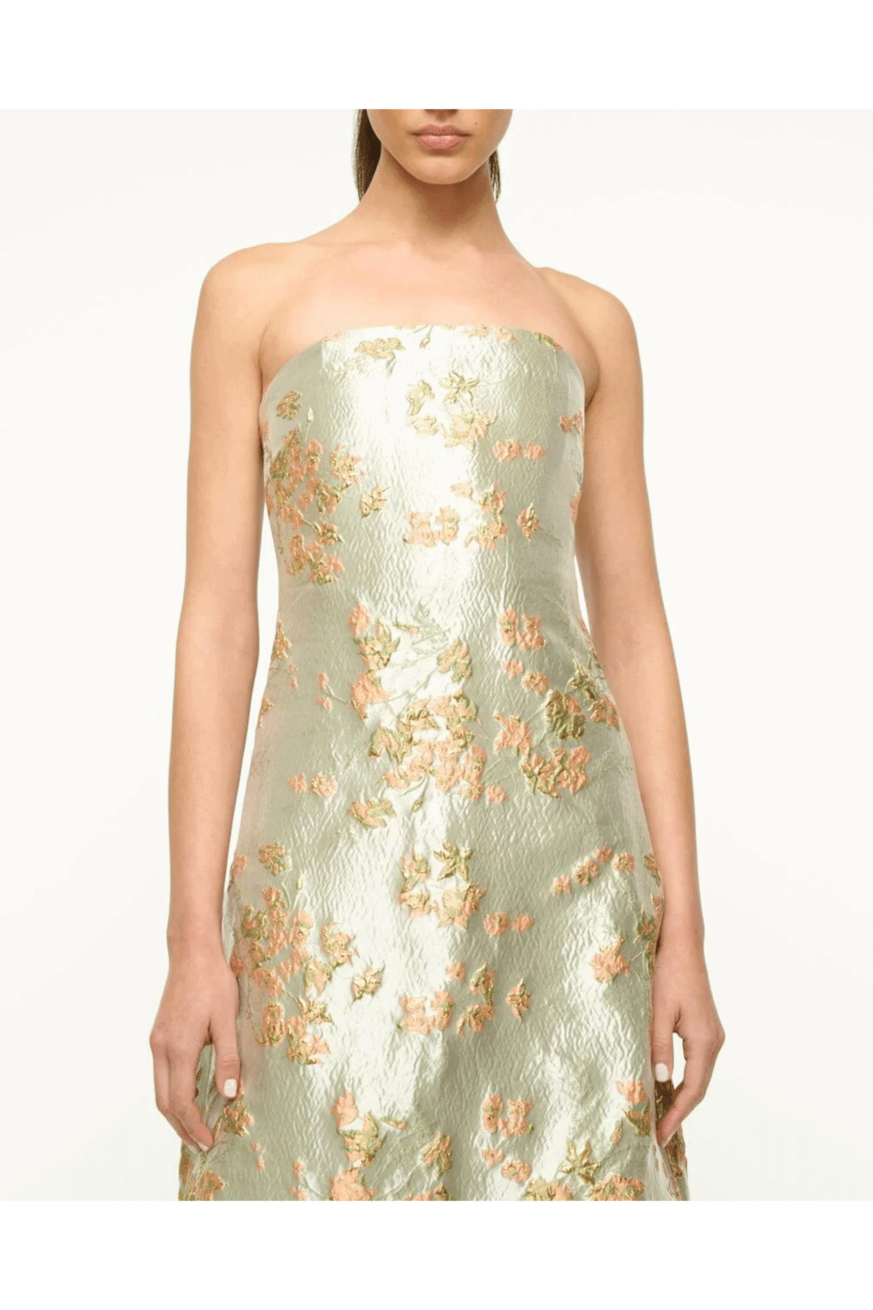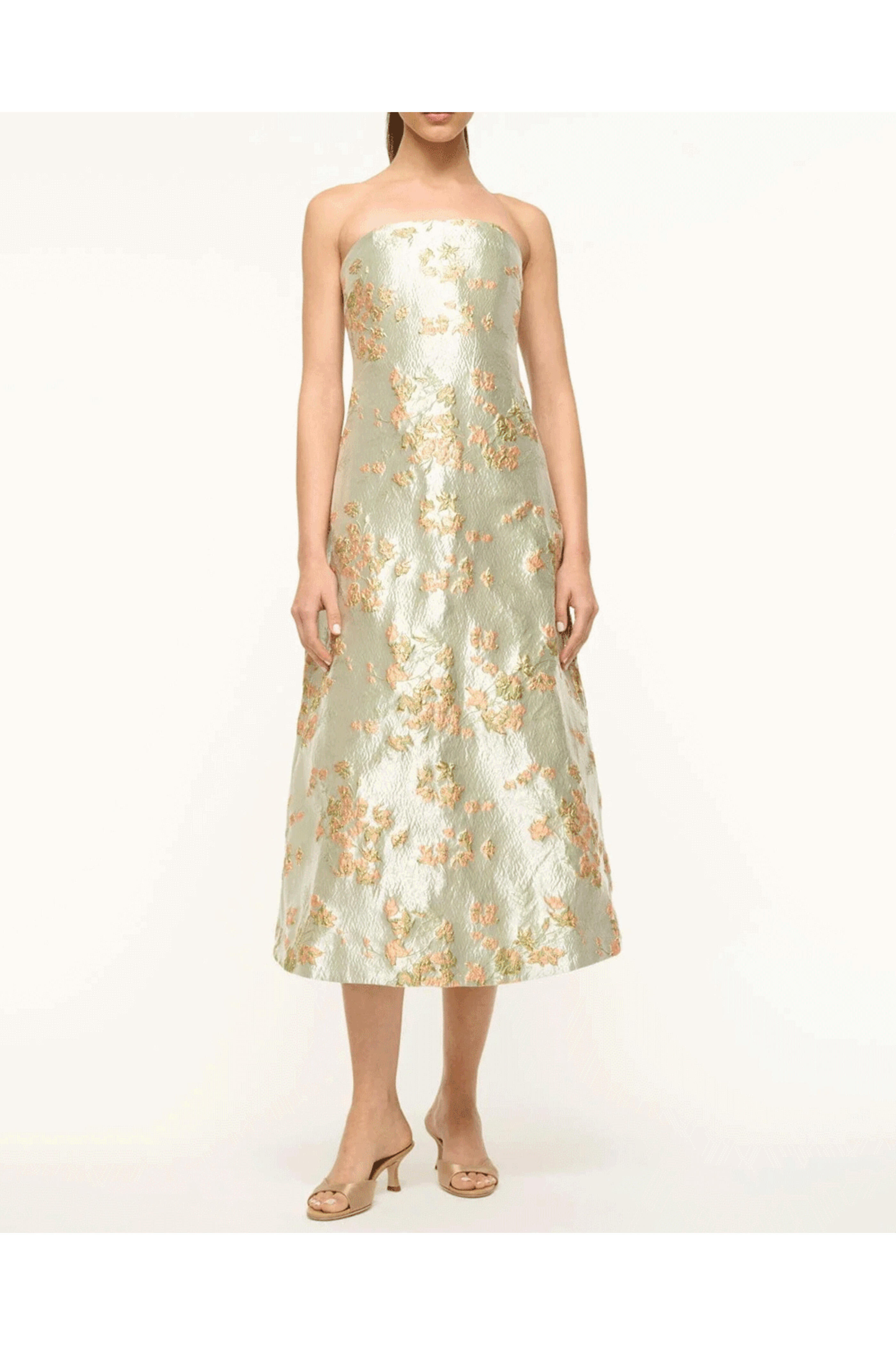 STAUD Metallic Bloom Kennedy Dress . Strapless neckline . Sleeveless . Interior corset . Pleated train at the back . Midi length . Imported . Self: 65% Polyester, 13% Nylon, 22% Metallic Polyester . Lining: 100% Polyester . Dry Clean Only .
