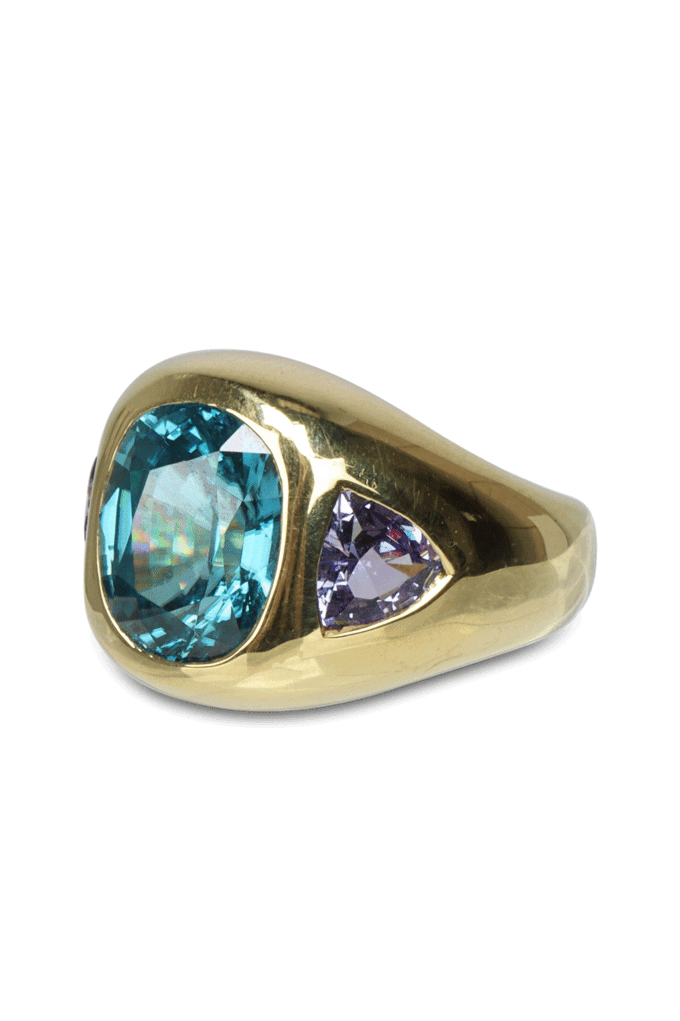 18k gold. Tanzanite 5.00 total carat weight. Blue Zircon 2.76 total carat weight. Oval cut. Tanzanite between two blue zircons. Signet style. Made in the USA. Ring size 5.5.