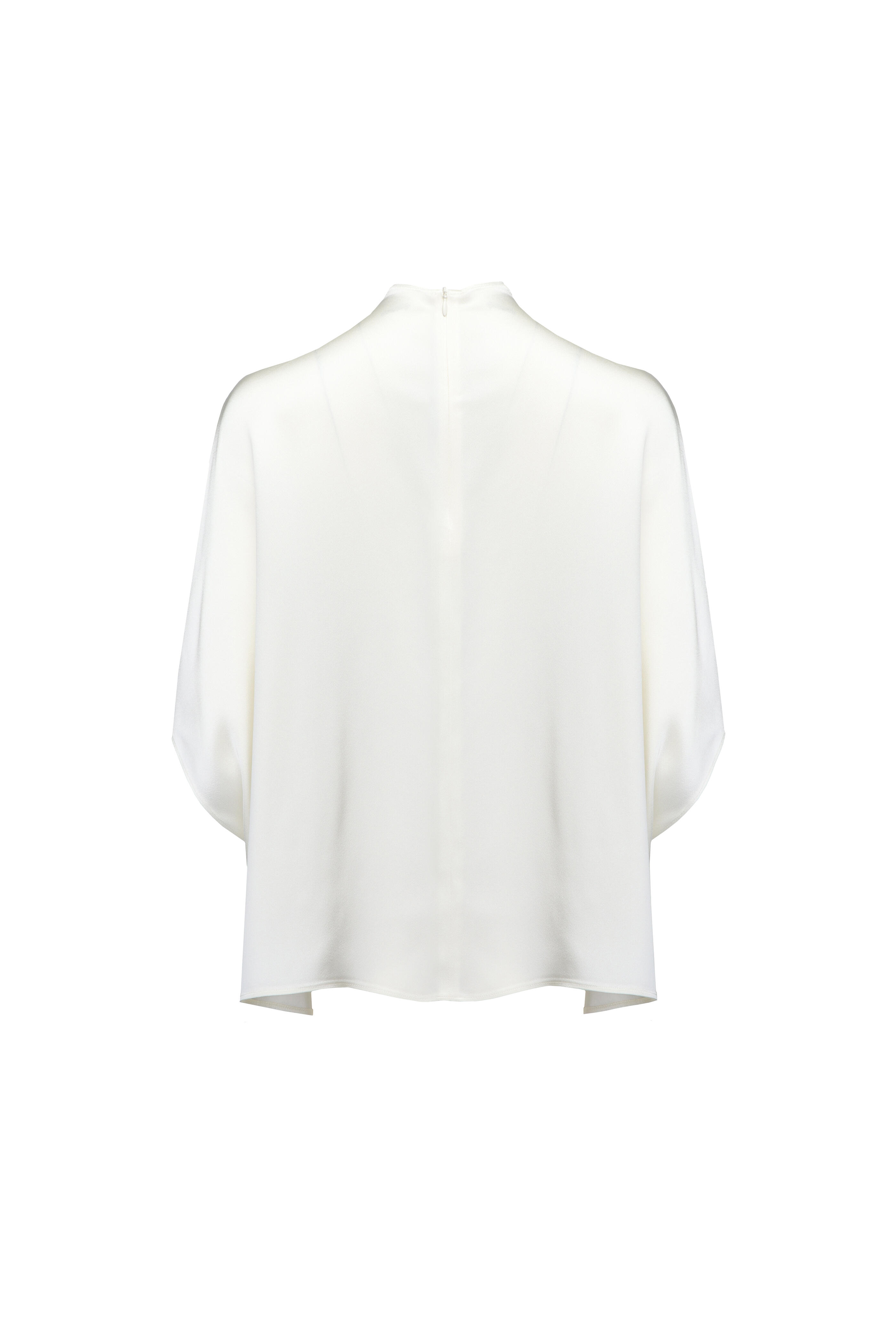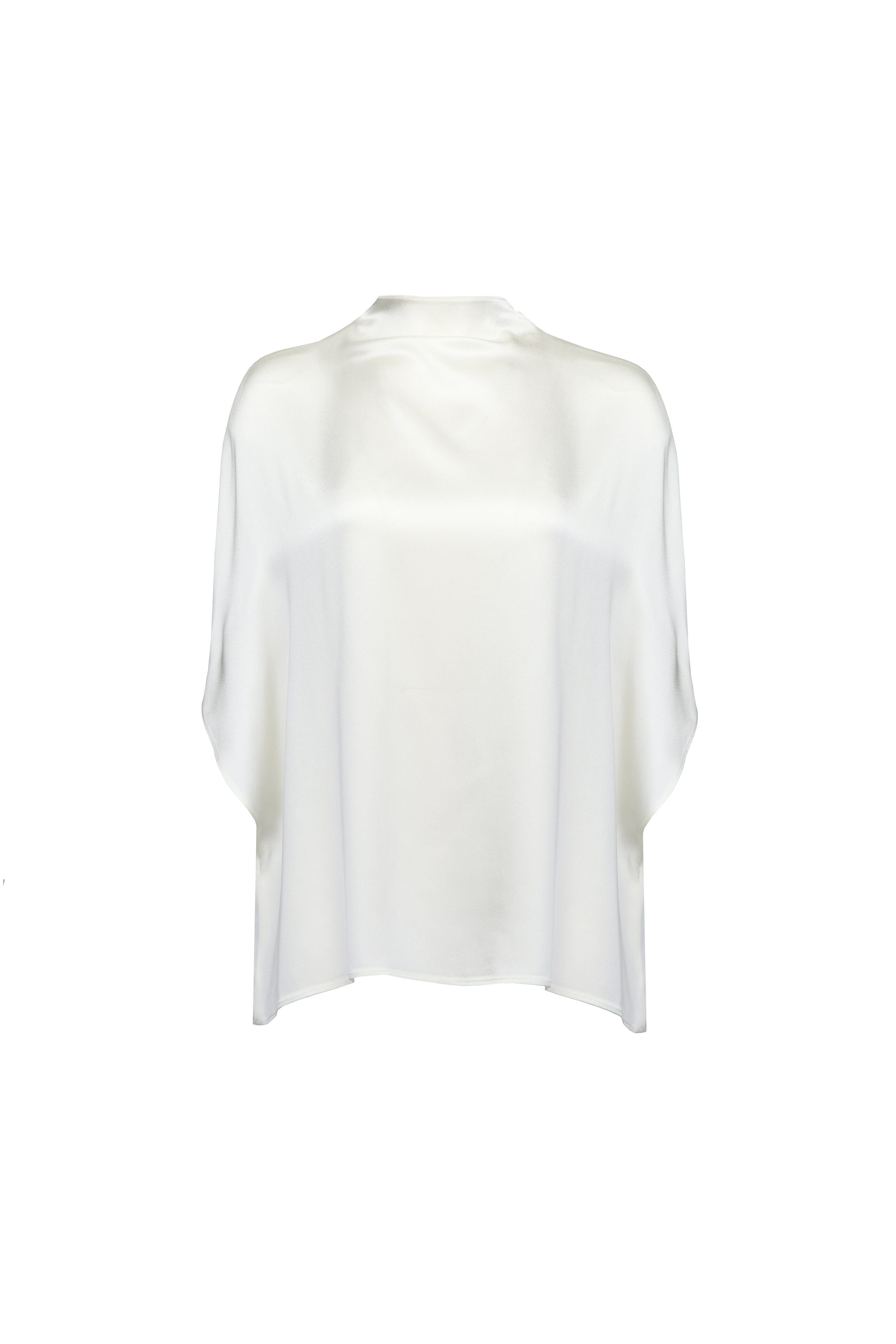 High neck. Short dolman sleeves. Relaxed fit. Straight hem. Satin fabrication. Imported. Bust 34” (Size S/ US 4). Waist 27” (Size S/ US 4). Hip 37” (Size S/ US 4). 61% acetate, 39% viscose. Dry clean.