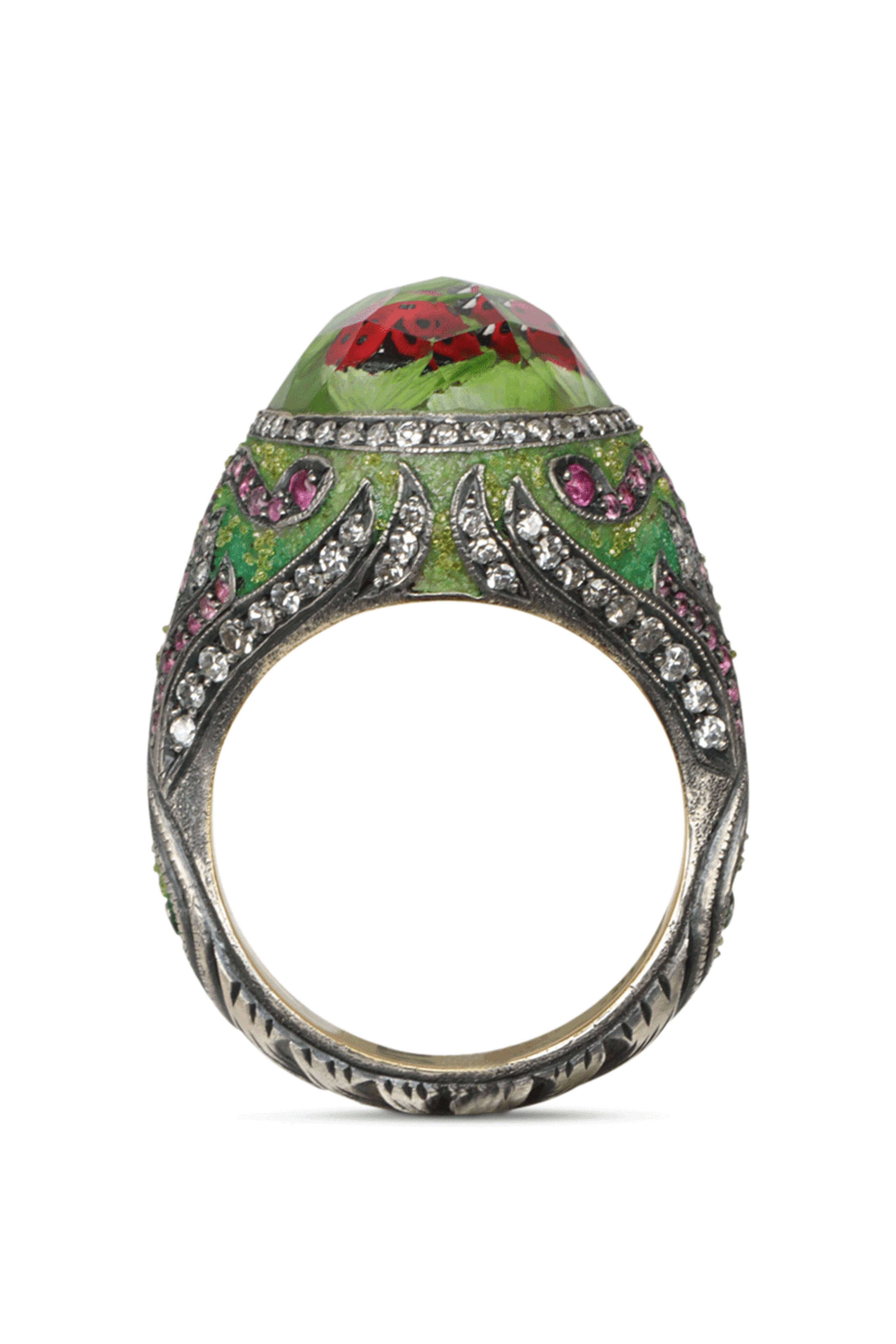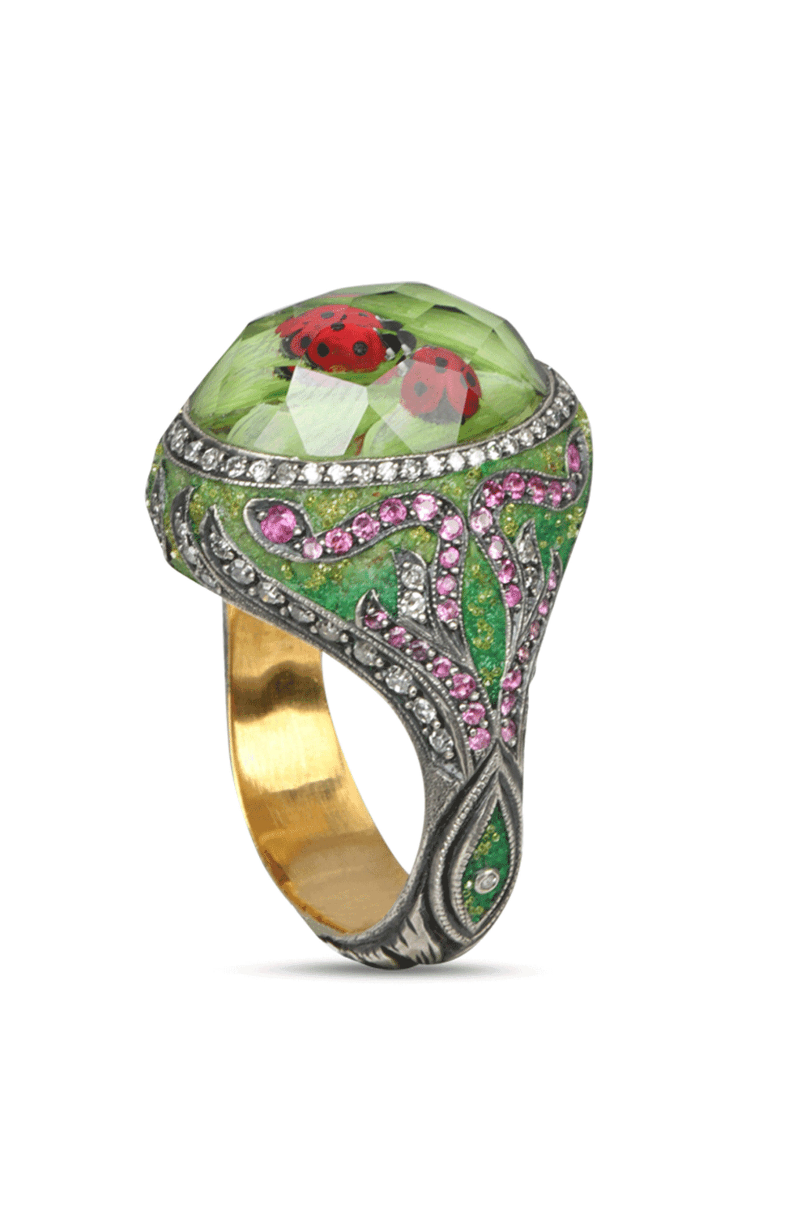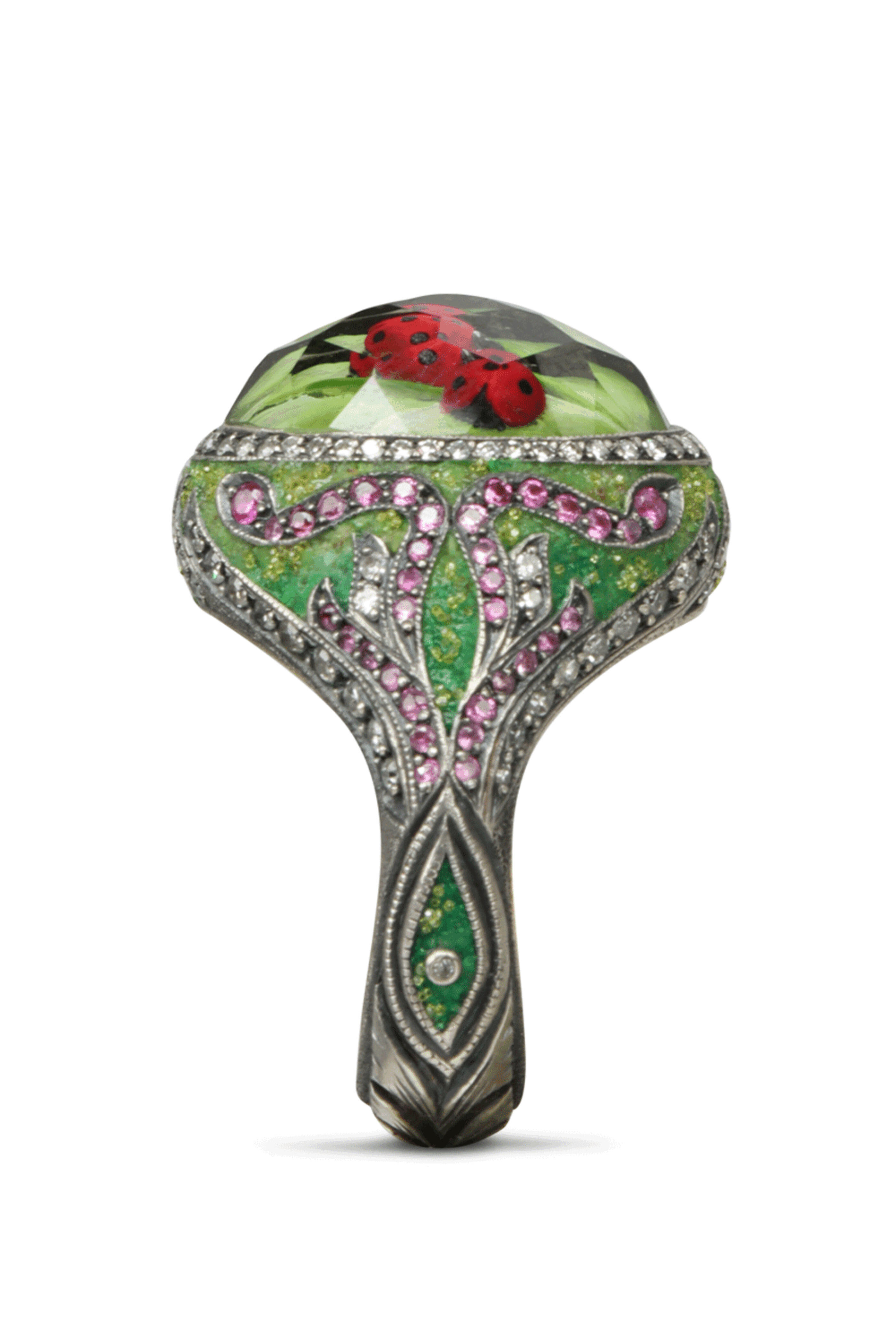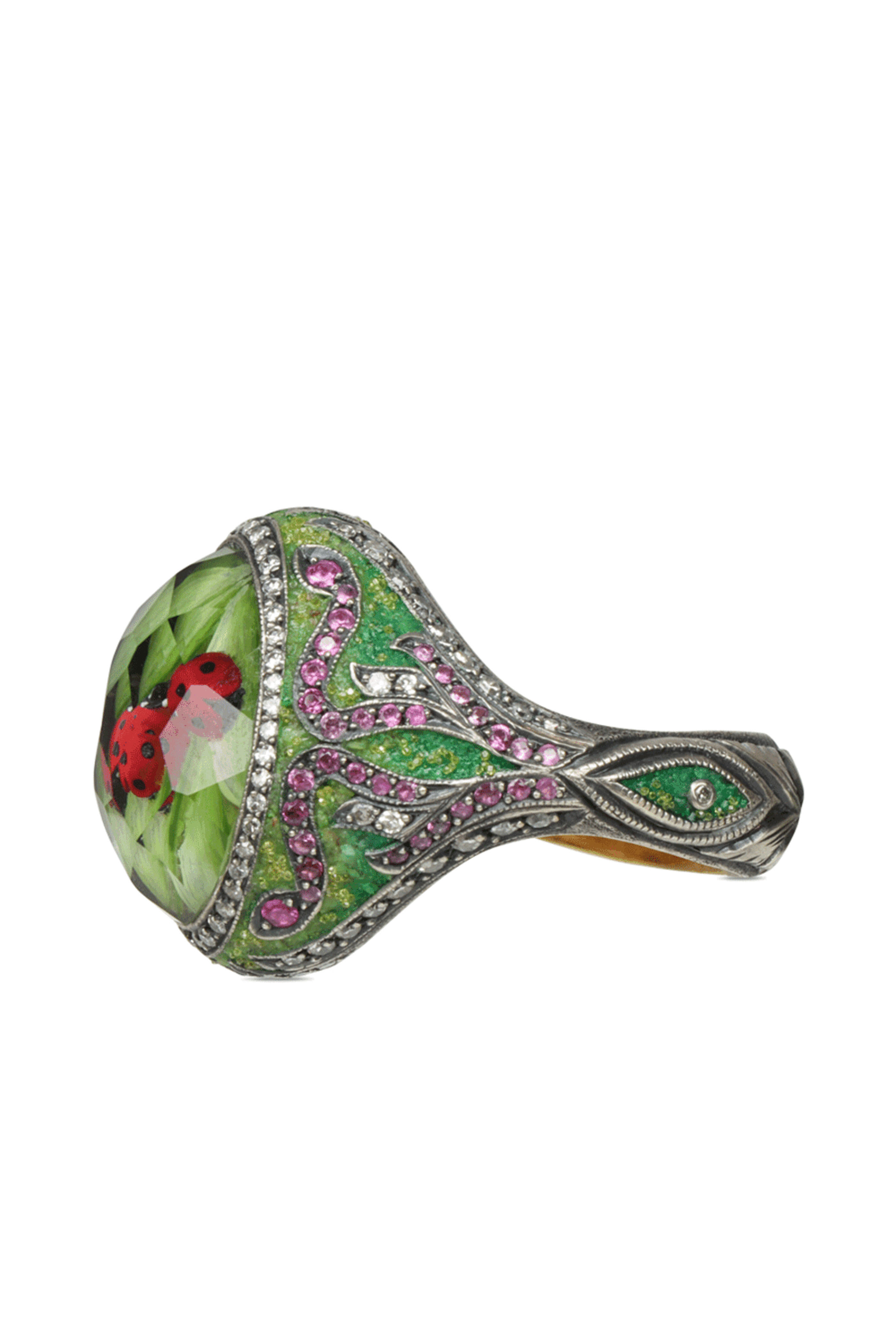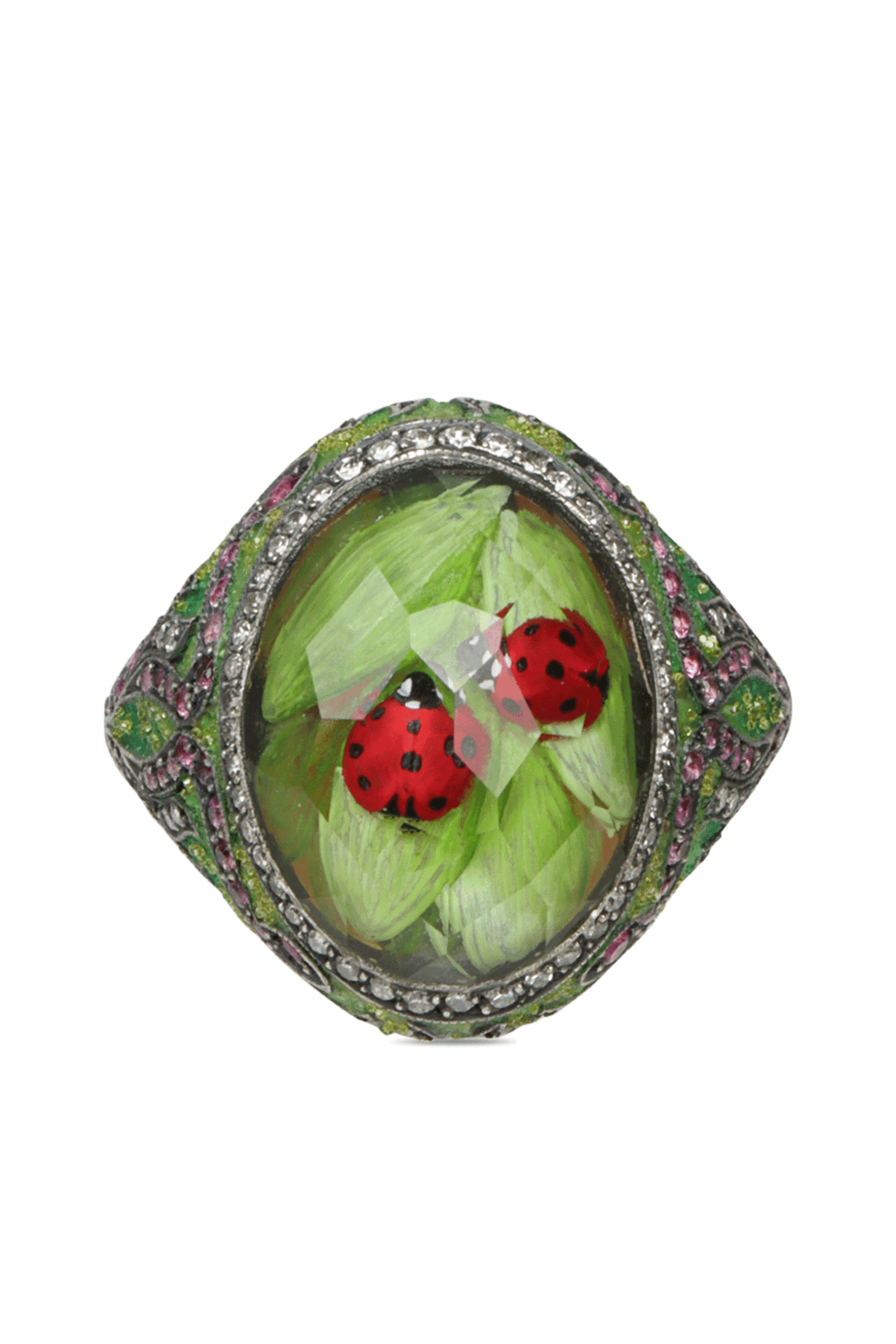 - Painted to precision, the ladybugs are encased in the domed and faceted quartz