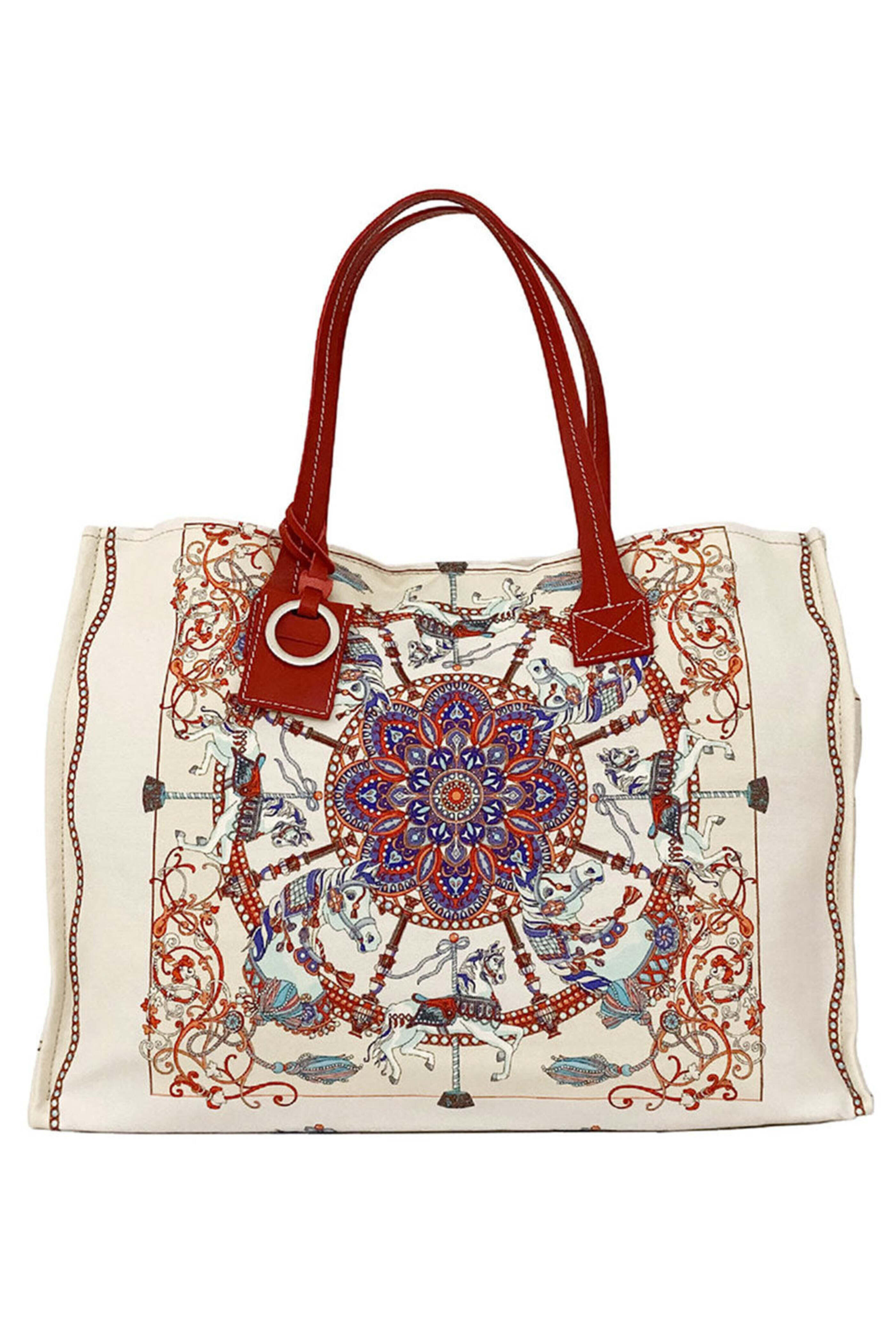 - Rani Arabella White Toy Horses Small Tote Bag Flat leather handles Interior zippered pocket Side button panels Magnetic snap closure Drop: 8.25 Dimensions: 17 x 13 x 5 Made in Italy