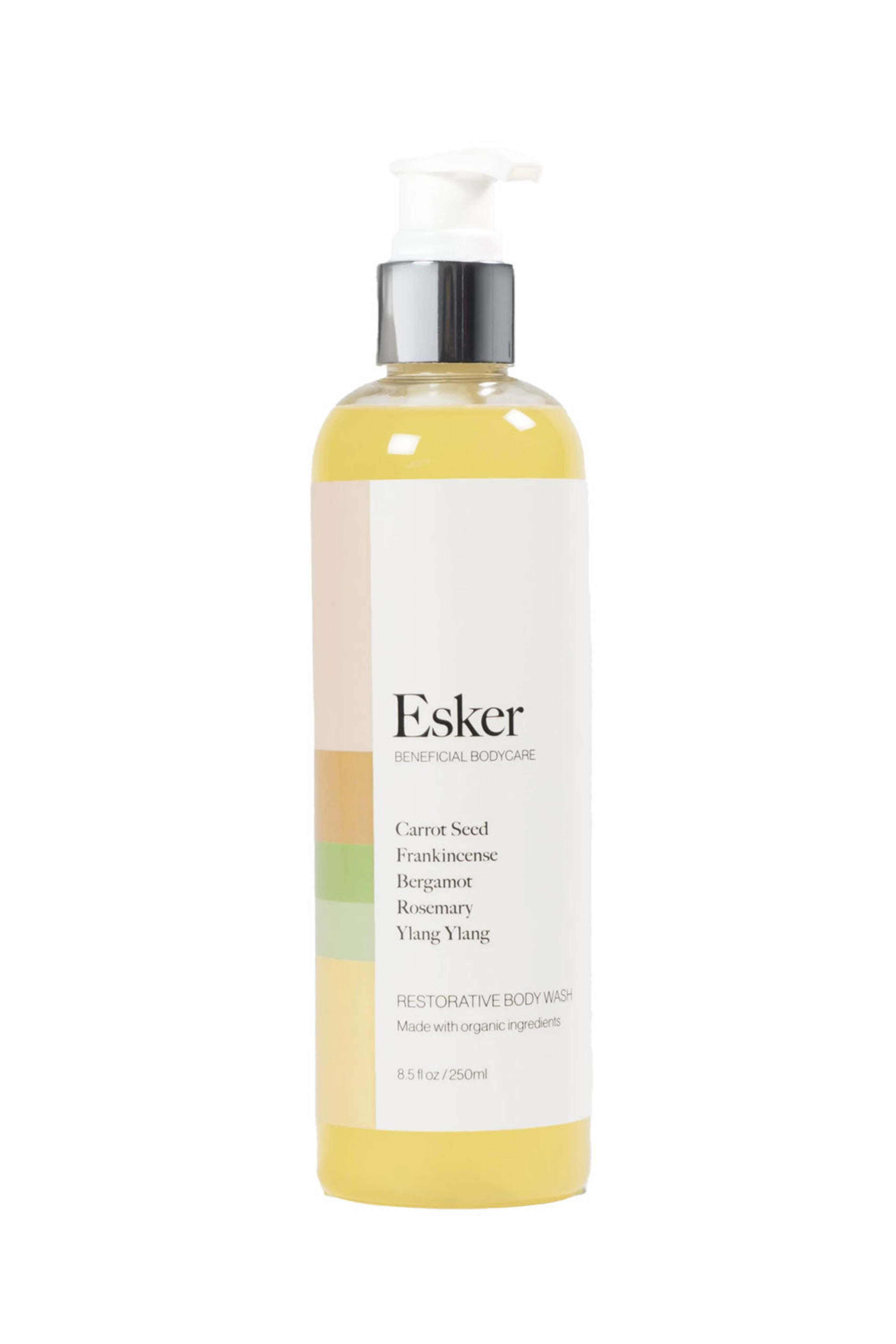 8.5 fl oz / 250ml. Cruelty-free, Organic, Vegan, Paraben-free, Sulfate-free, Phthalates-free. Leaping Bunny Certified. Esker Beauty Restorative Body Wash. Best for dry, textured skin. Reef-safe; 100% Recyclable Packaging.