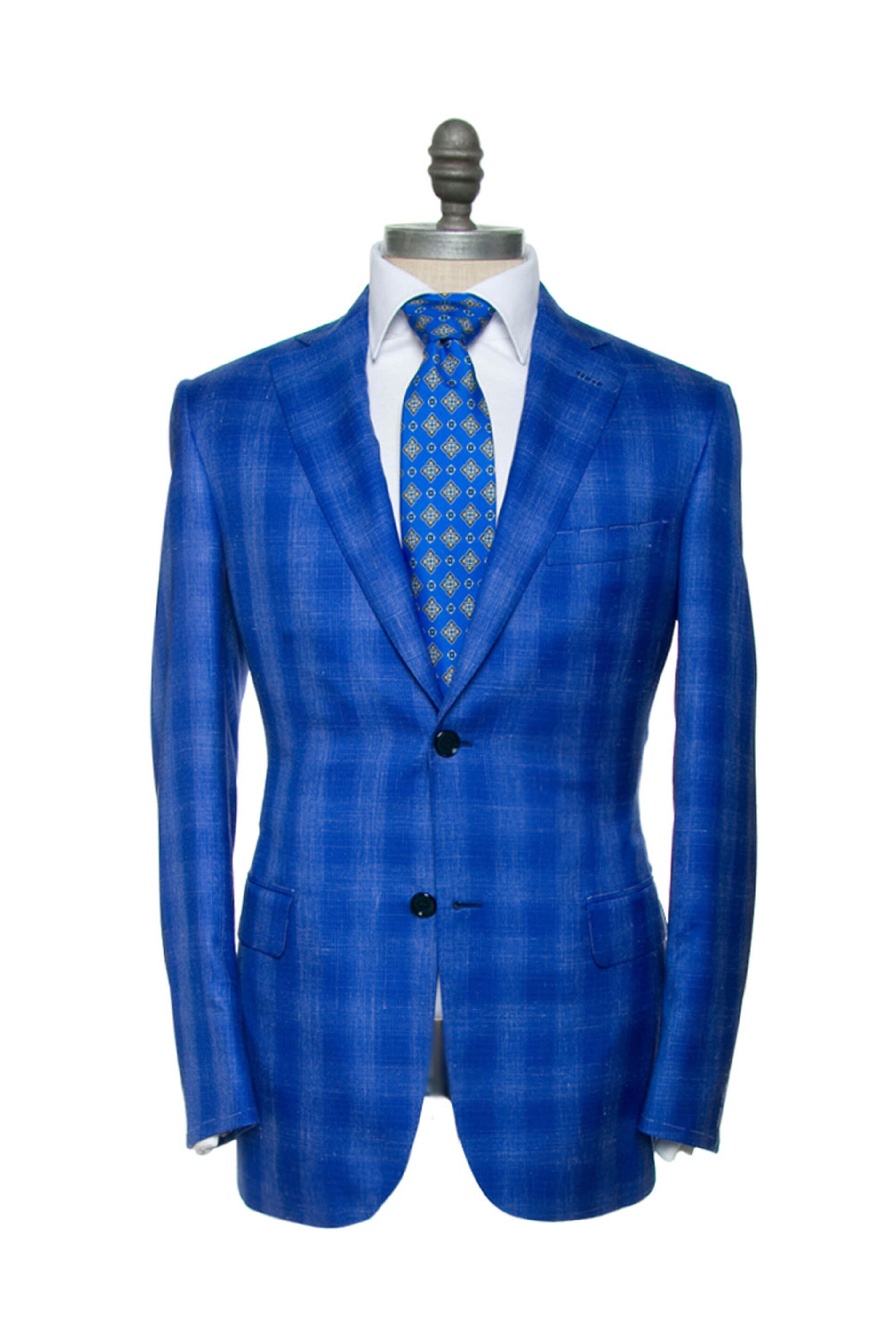 Brioni High Blue Melange Sportcoat. Two button jacket. Notched lapel. Pick stitch detailing. Front left chest pocket. Two front flap pockets. Four interior pockets. Double back vents. Fully lined. Made in Italy. 80% cashmere, 32% silk, and 8% linen outer.