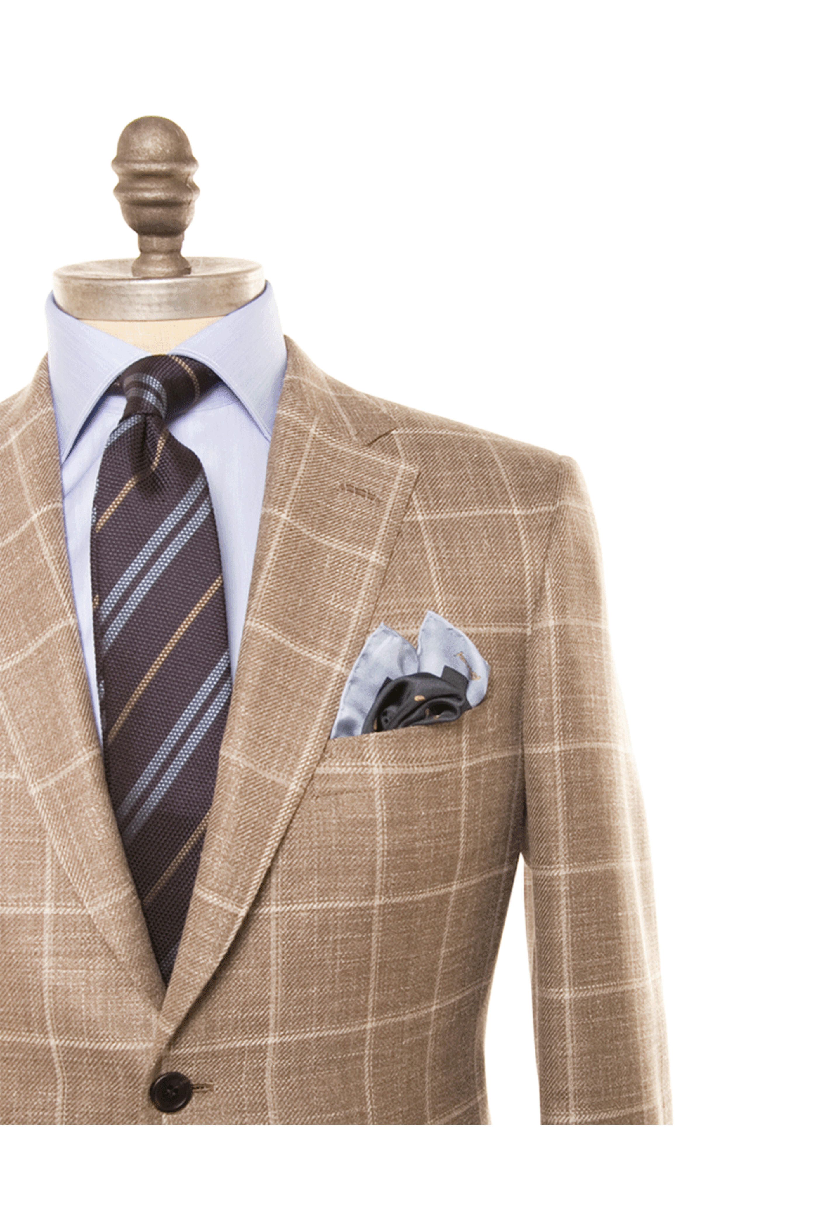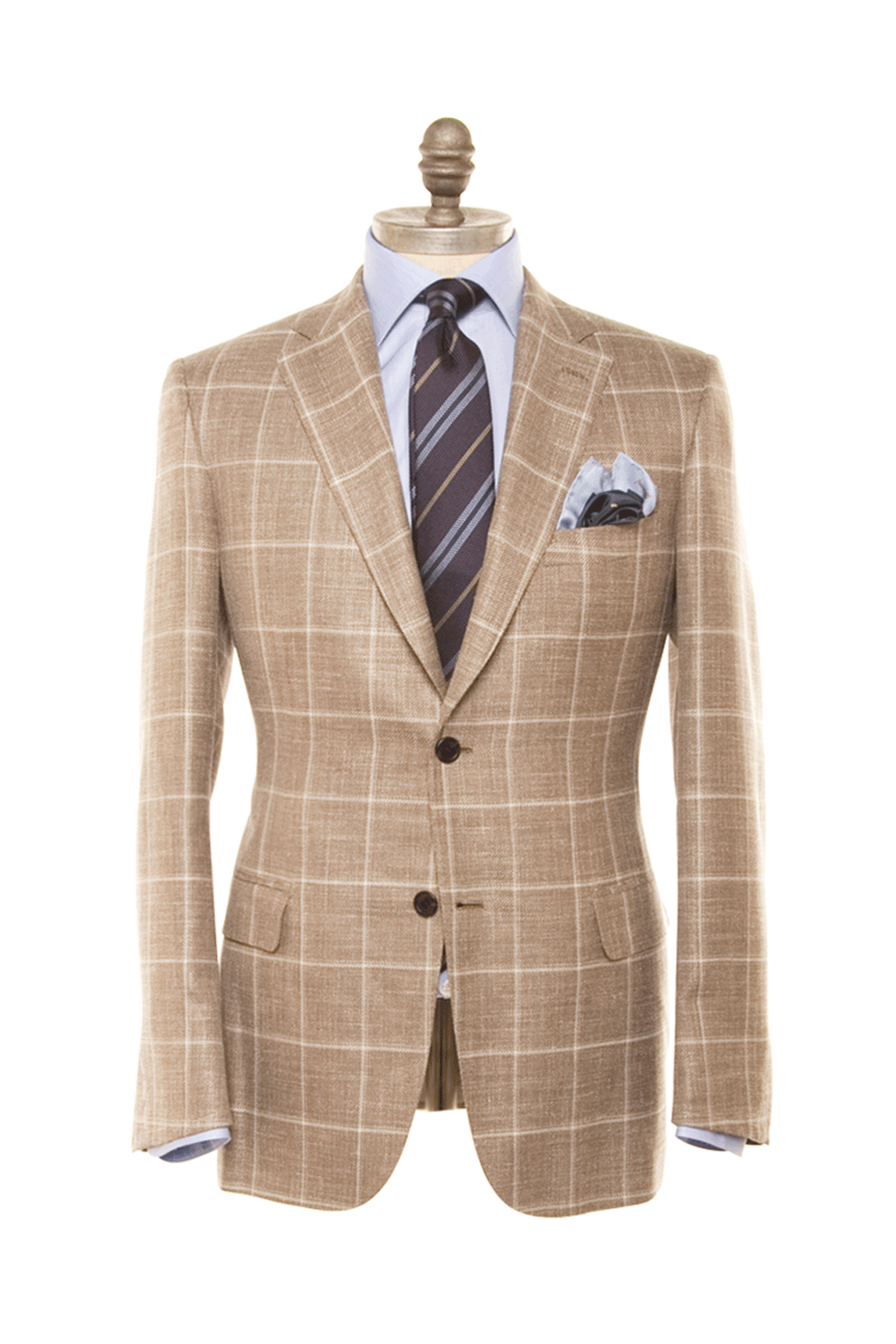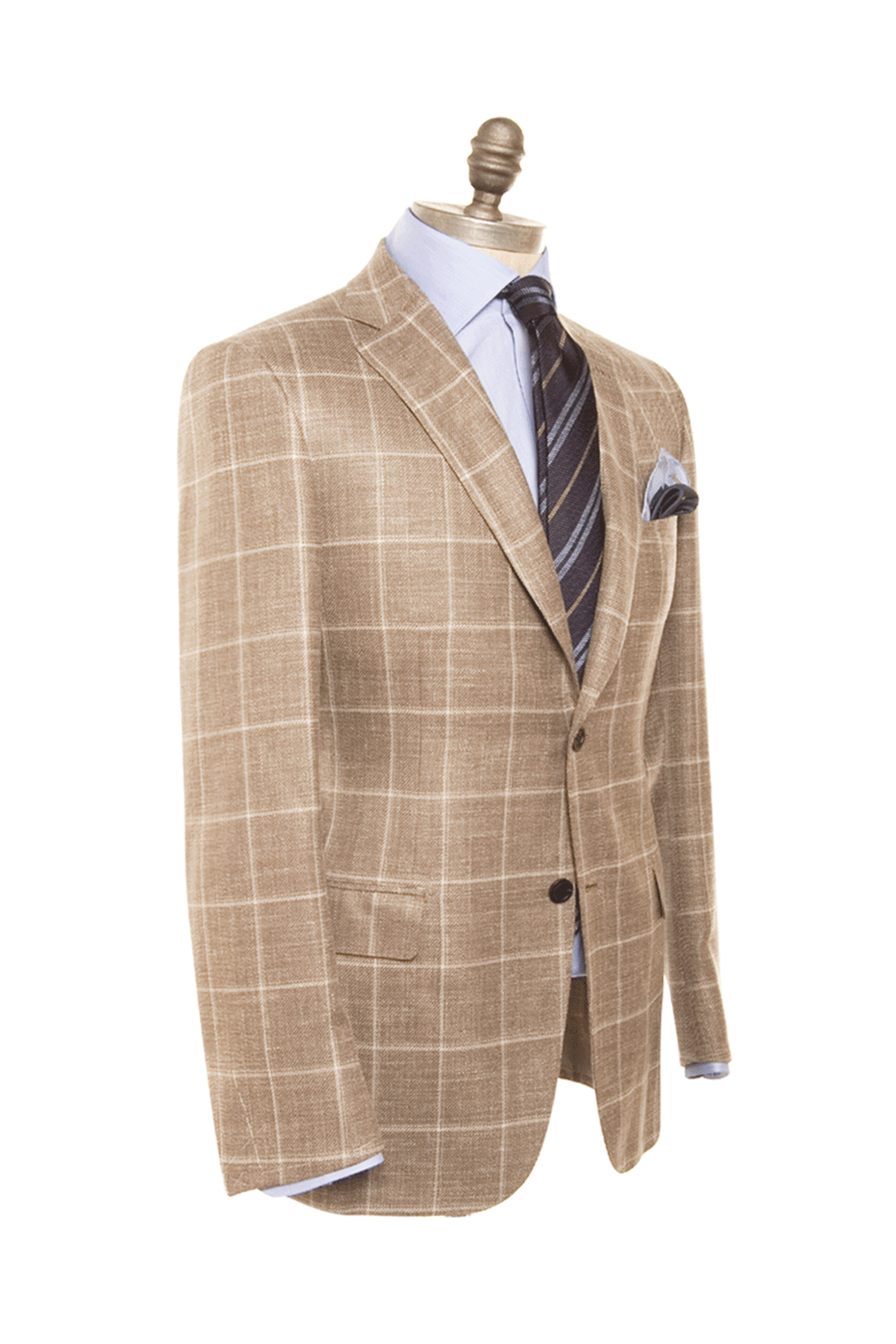 Brioni Beige Windowpane Sportcoat. Two button jacket. Notch lapel. Front left chest pocket. Pick stitch detailing. Flap waist pockets. Double back vents. Drop: 6. Cotton lining. 68% virgin wool, 18% silk and 14% linen.