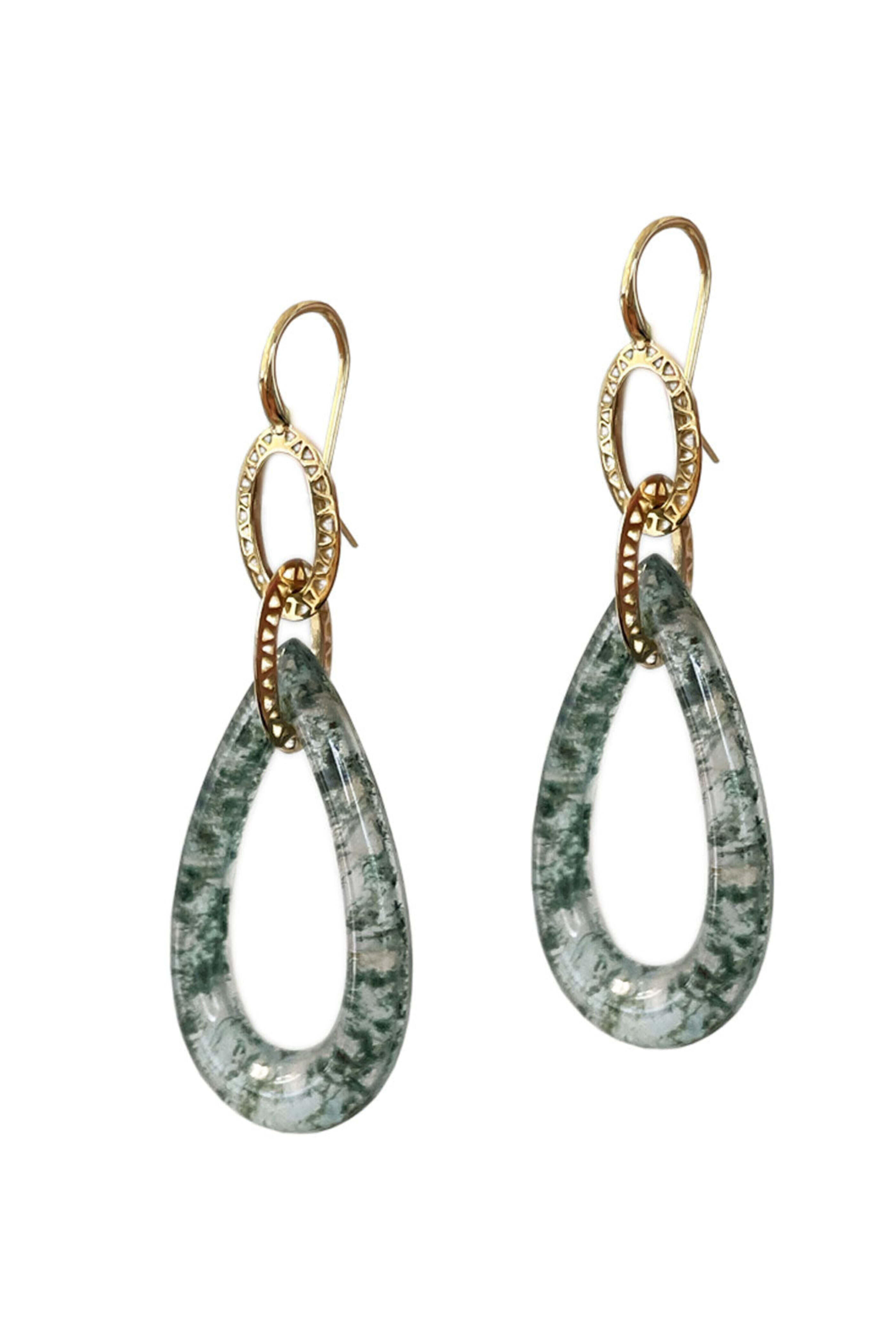 Ray Griffiths Pear Shape Crownwork Link Earrings. 18k yellow gold. Moss agate. Crownwork links. Pear shape moss agate. Wire back.