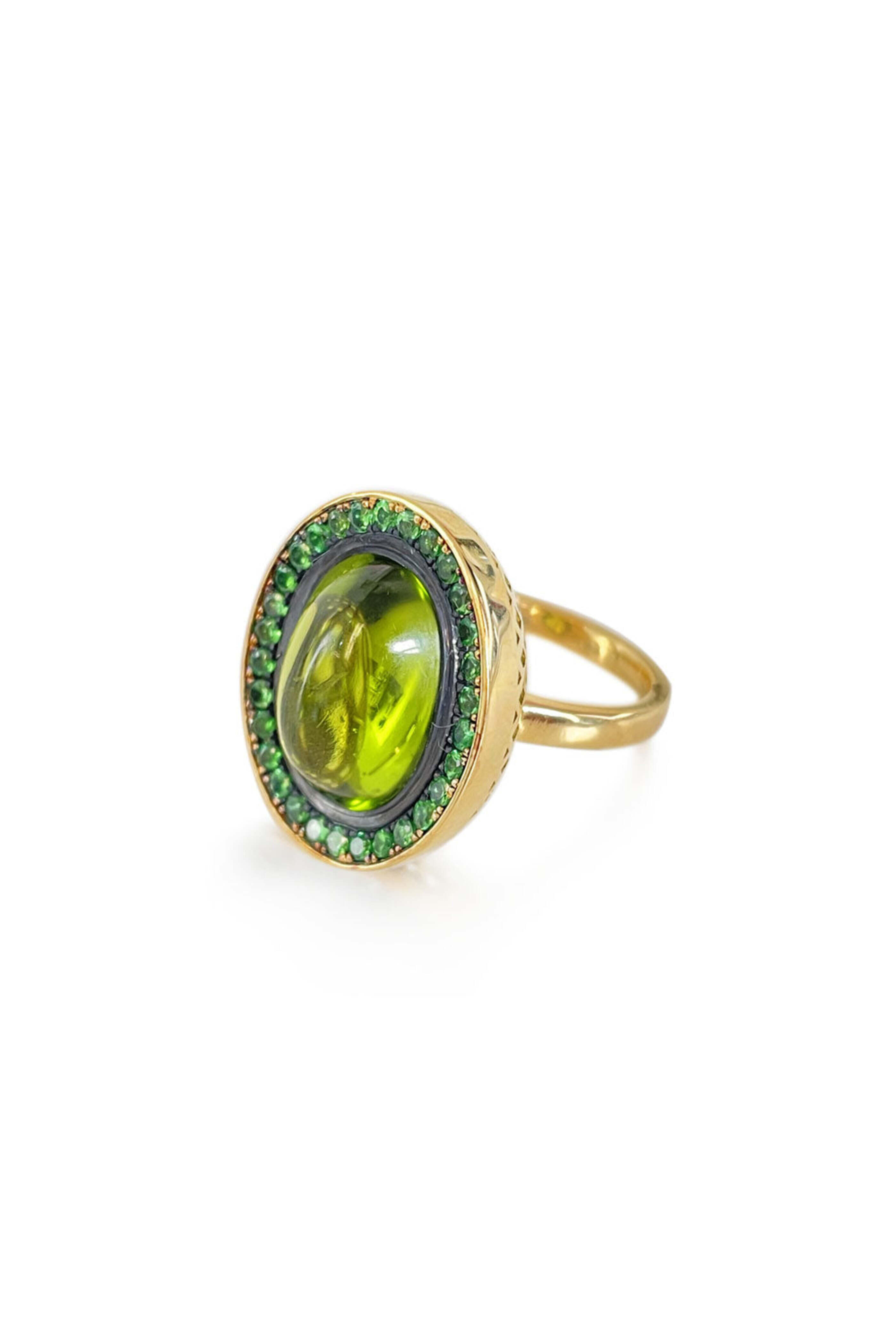 Ray Griffiths North South Peridot and Tsavorite Ring. 18k yellow gold. Oxidized sterling silver. Peridot 11.95 total carat weight. Tsavorites 1.63 total carat weight. Oval north south crownwork ring. Peridot center stone surrounded by tsavorites. 0.86 L 0.73 W.