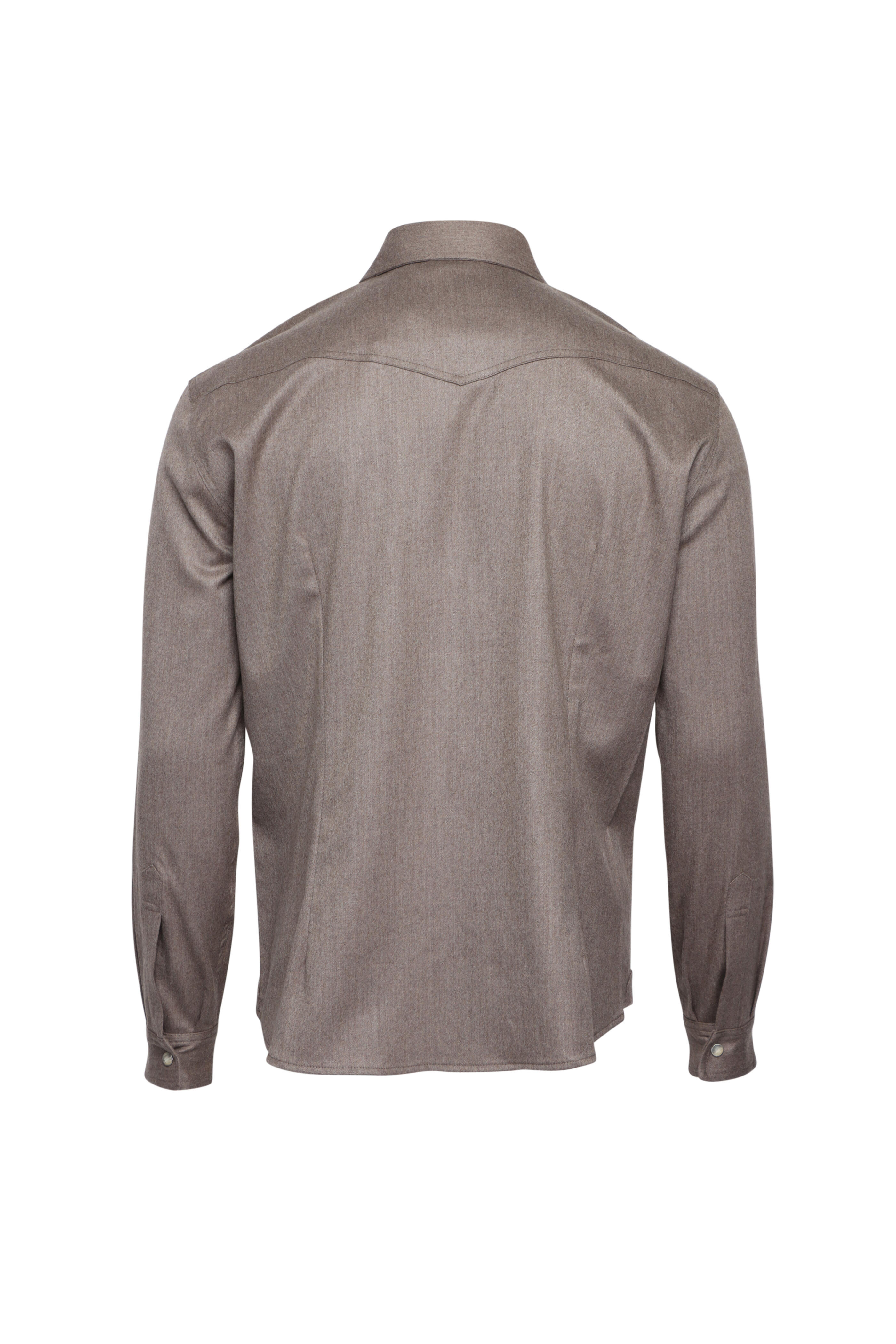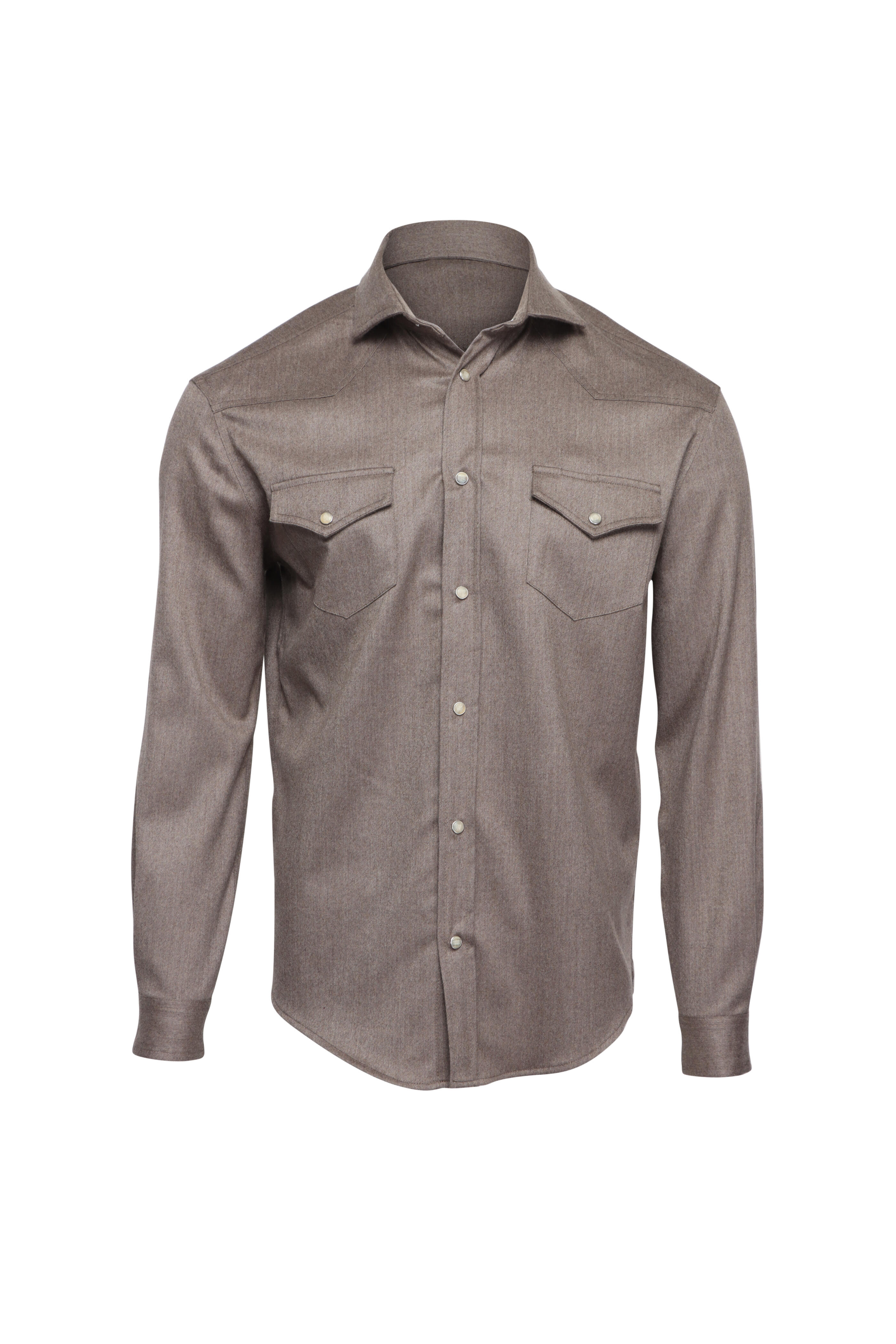 Spread collar. Front snap button placket. Chest flap pockets with snap closure. Single snap button cuffs. Made in Italy. 100% wool. Dry clean.