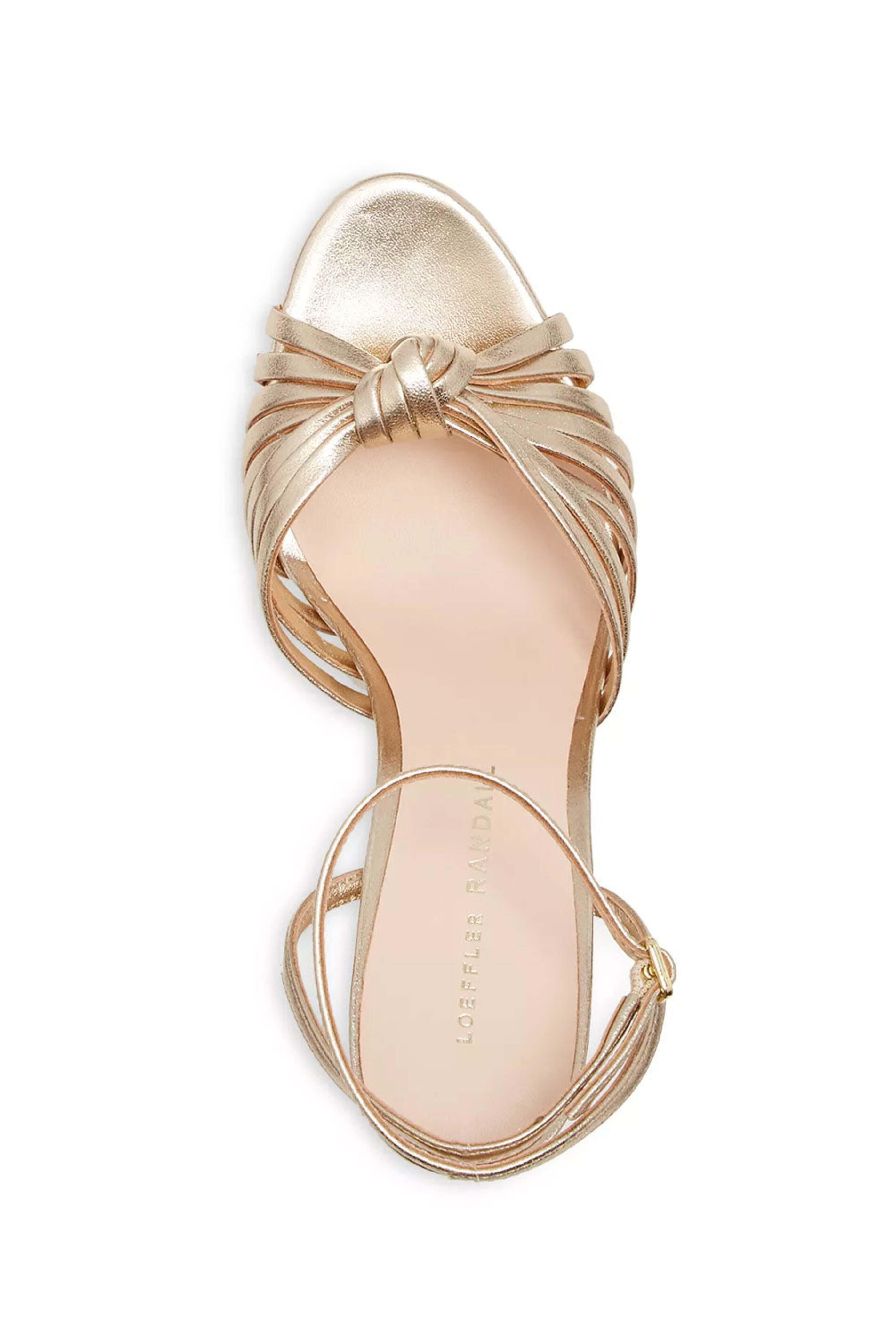 Almond open toe. Buckled ankle strap. Knotted toe strap. Leather upper, lining, and sole. 4.5" covered block heel. 1.5" platform. Color: Champagne.