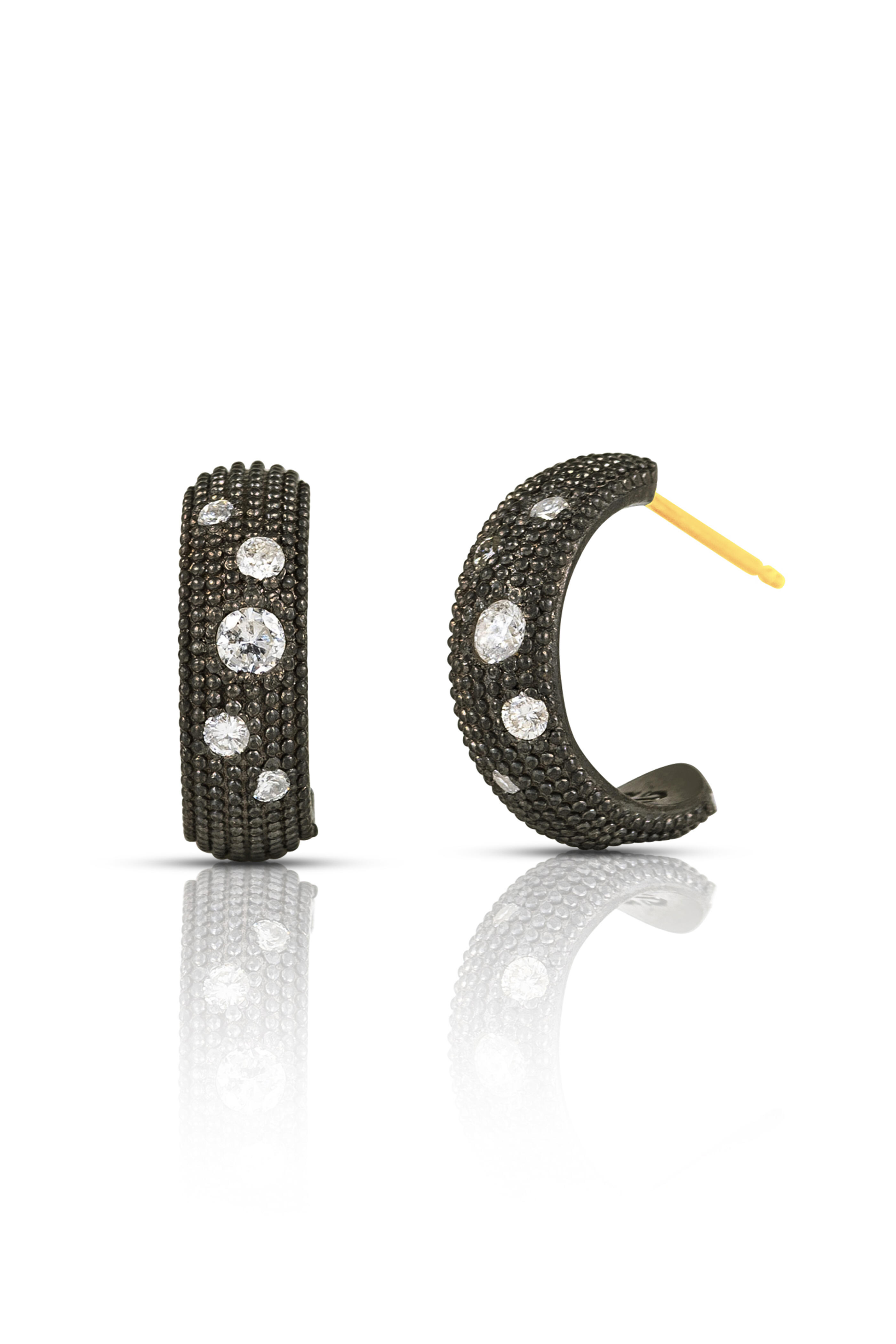 Black rhodium finish. Diamond 0.40 total carat weight. Textured design. Hoop style. Push back post. Handcrafted in L.A.. 4mm x 15mm.