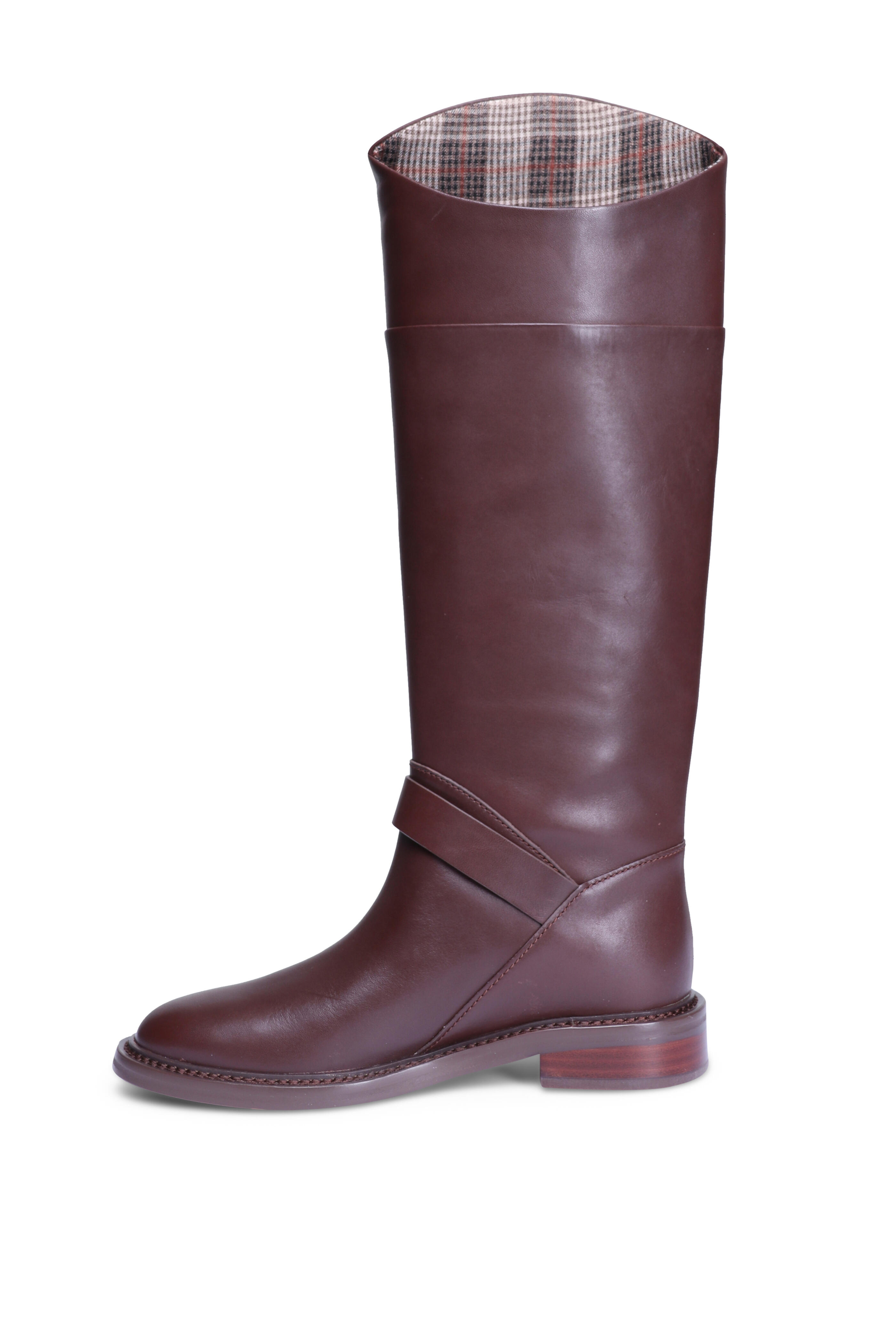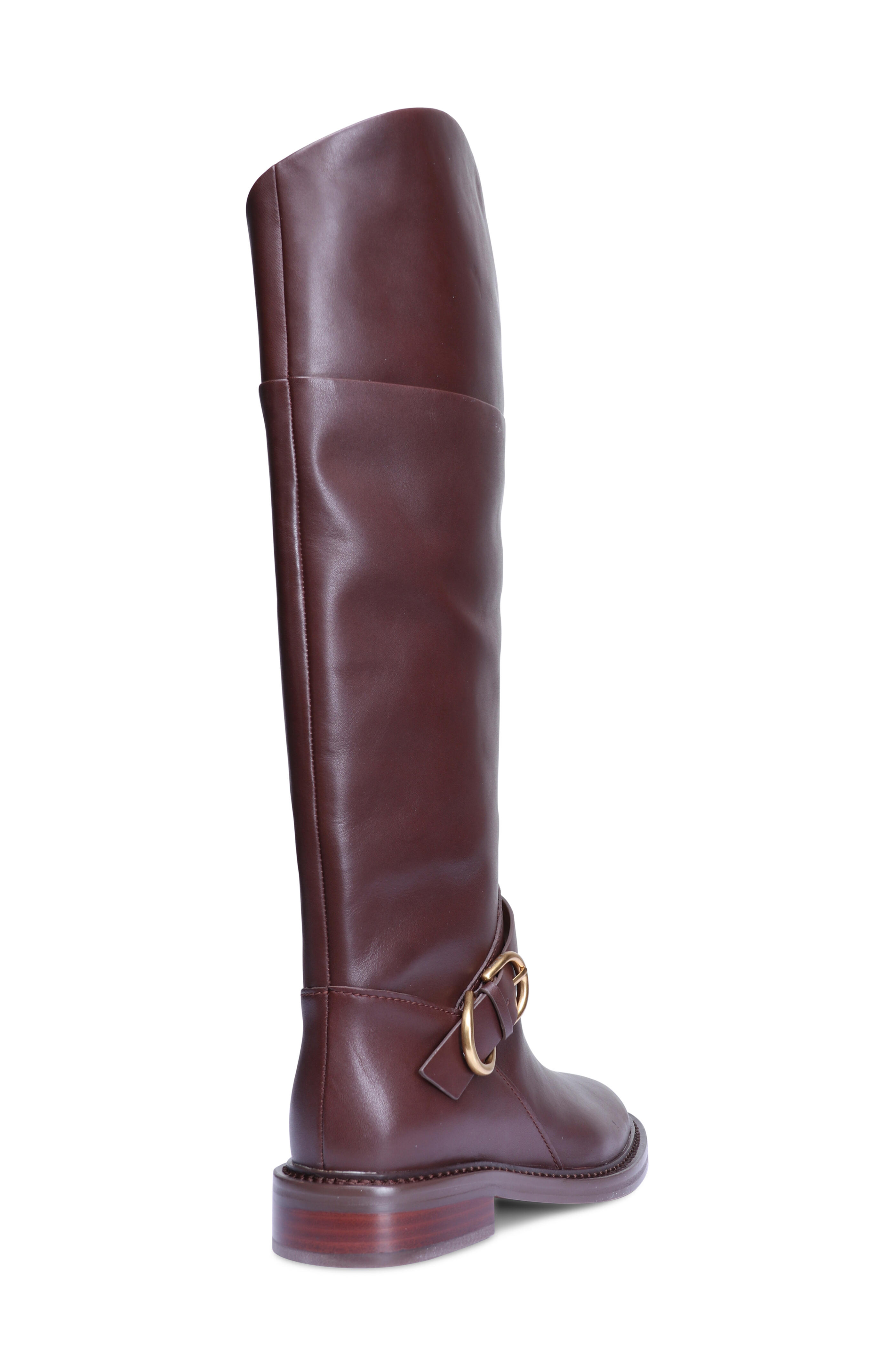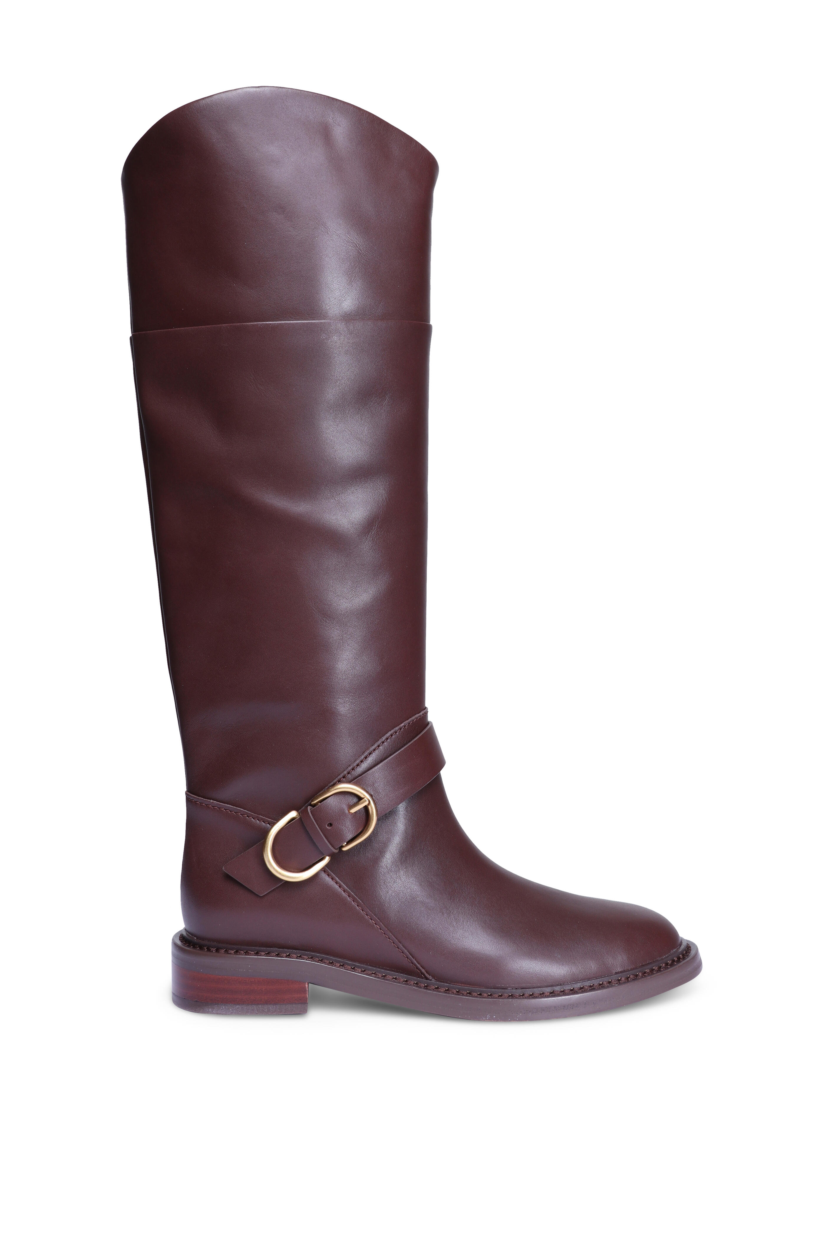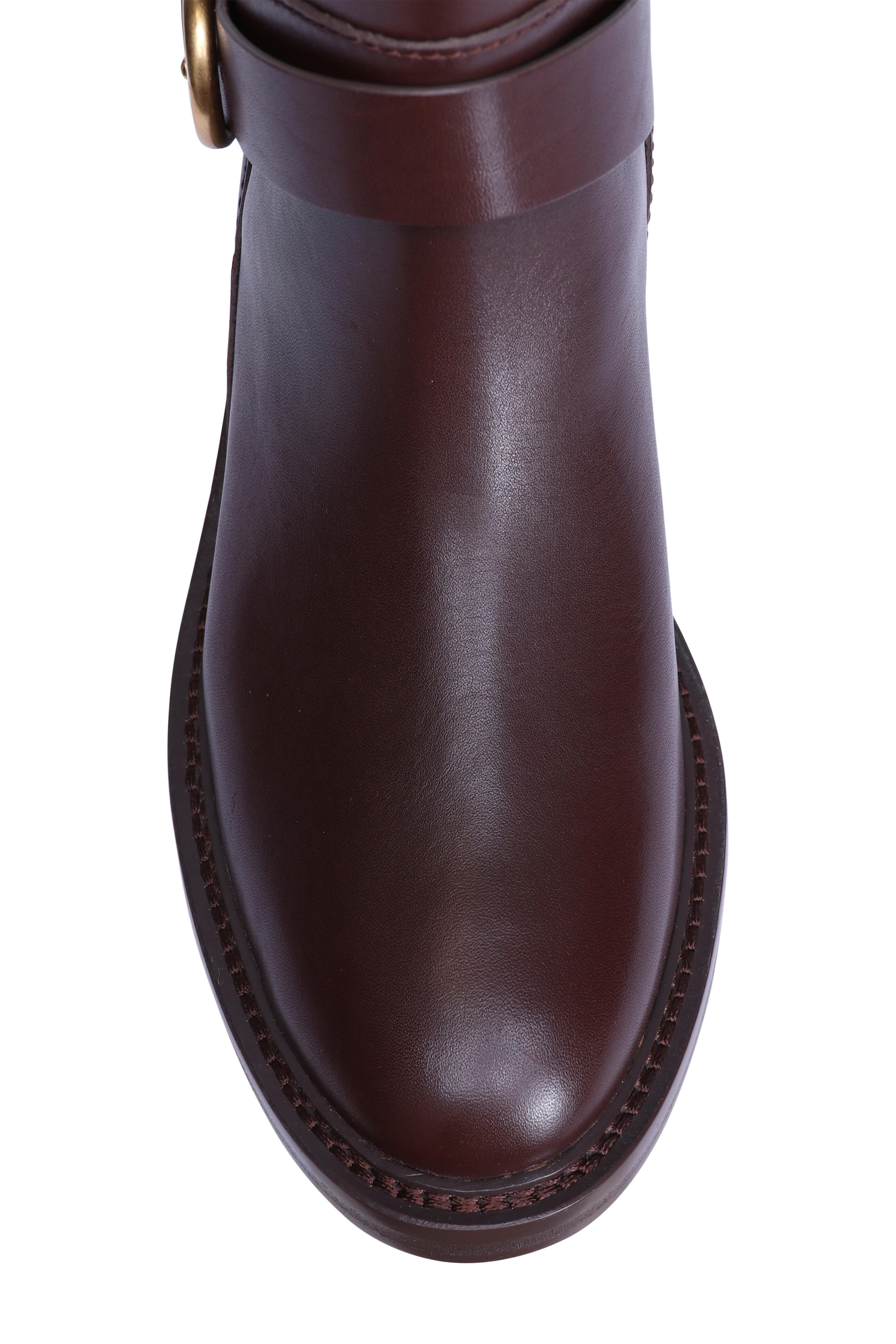 Calfskin leather upper. Textile fabric and leather lining. Synthetic sole. Round toe. Adjustable buckle design. Pull-on style. Imported. Heel measurement: 1.25”.