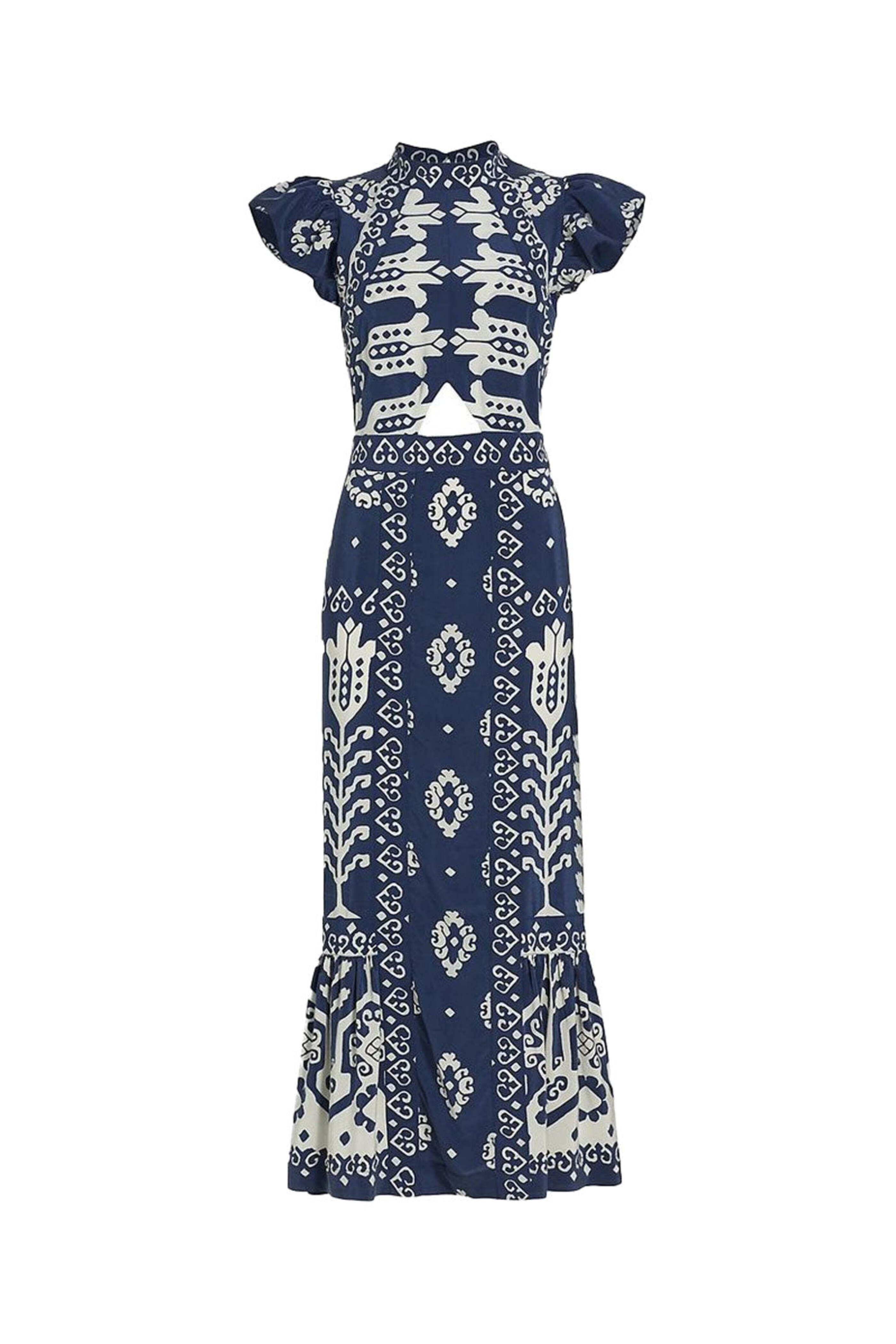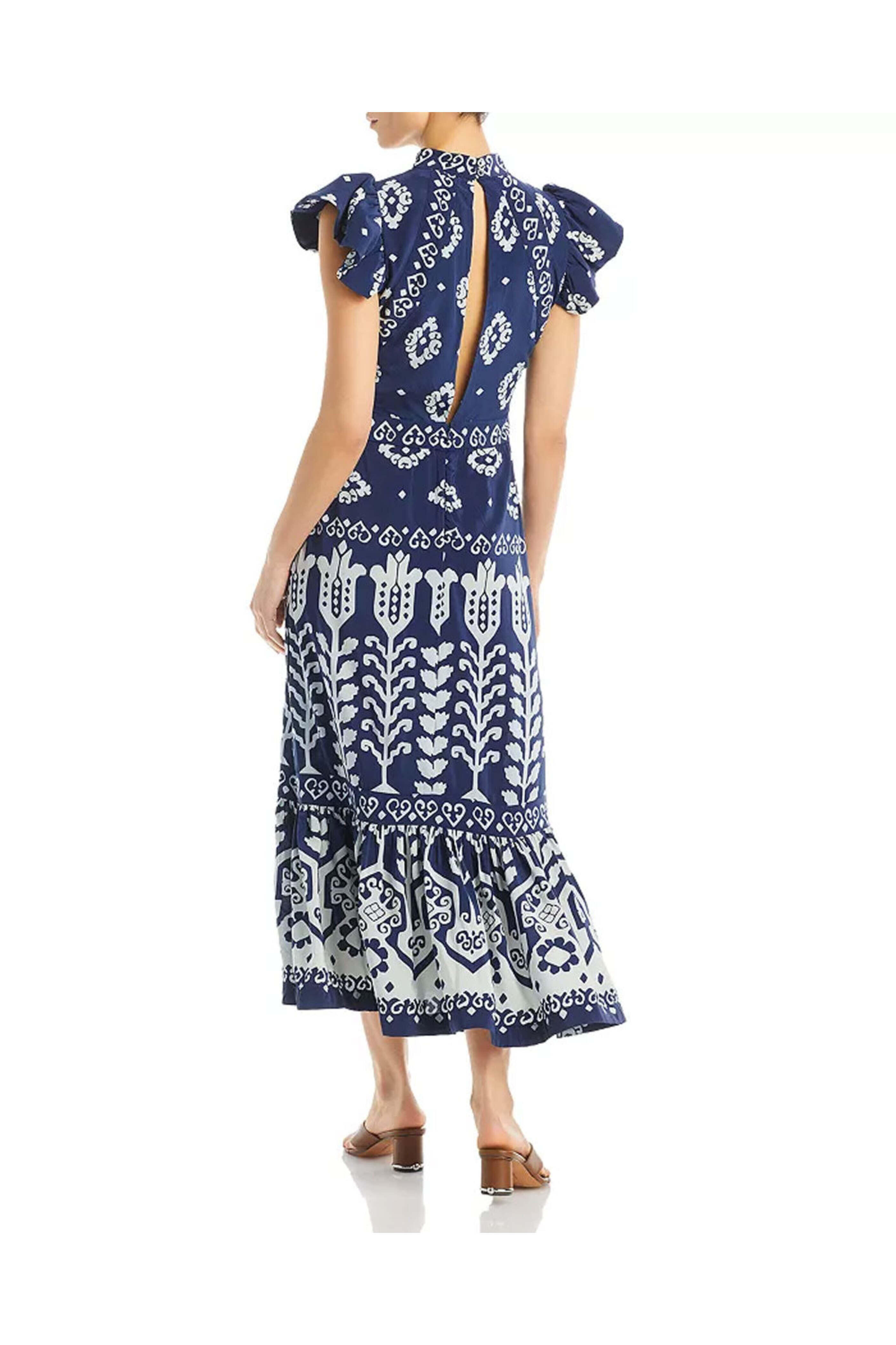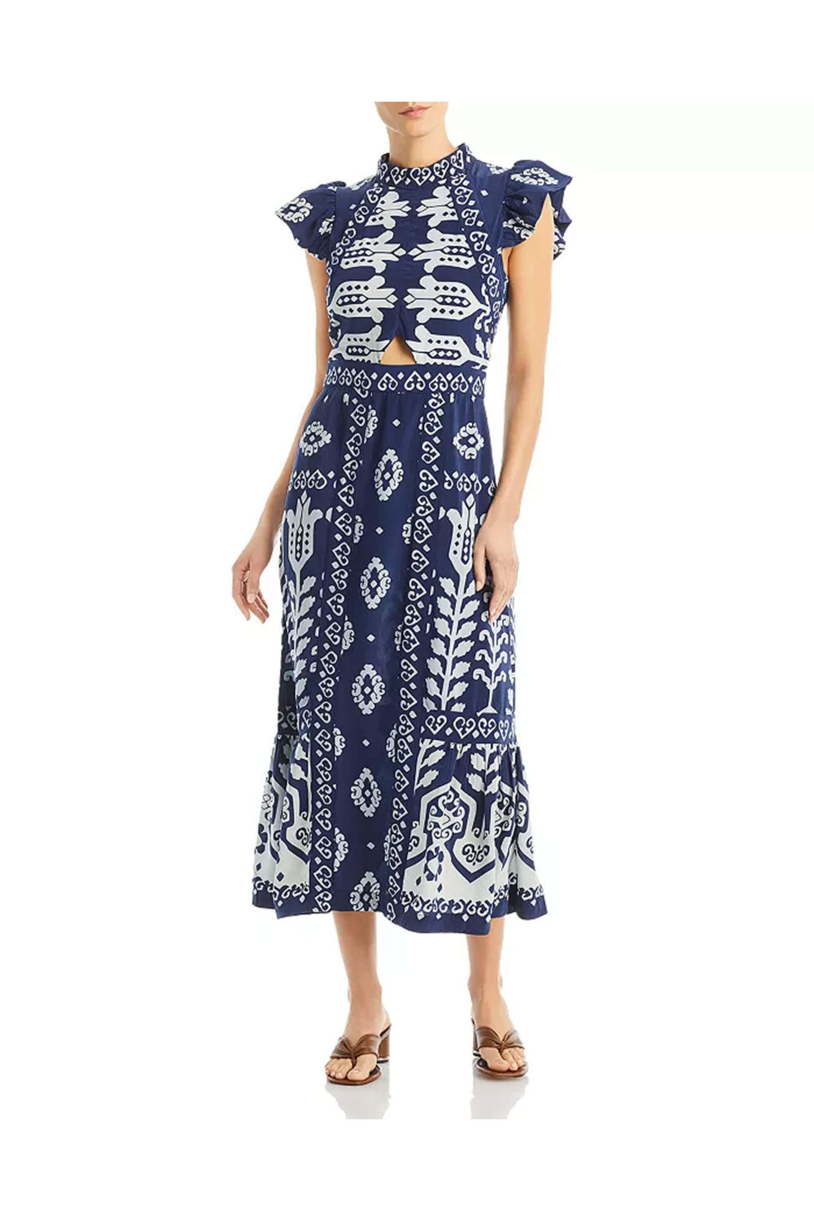 Sea Navy Sonia Print Dress. High neck. Button at keyhole back; zipper closure at center back. Short flutter sleeves. Cutout at front. Midi . Lined . 100% silk. Lining: 100% viscose.