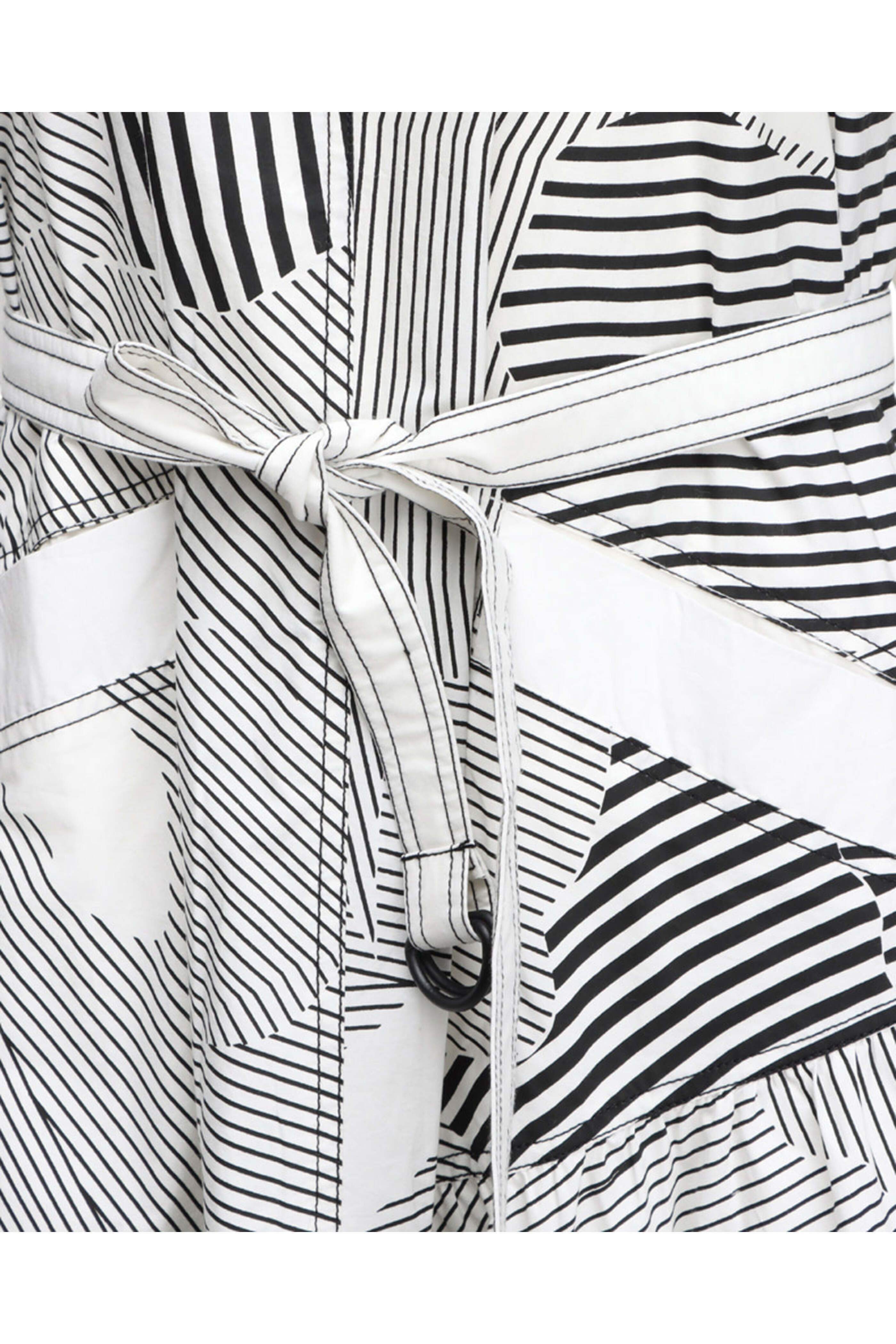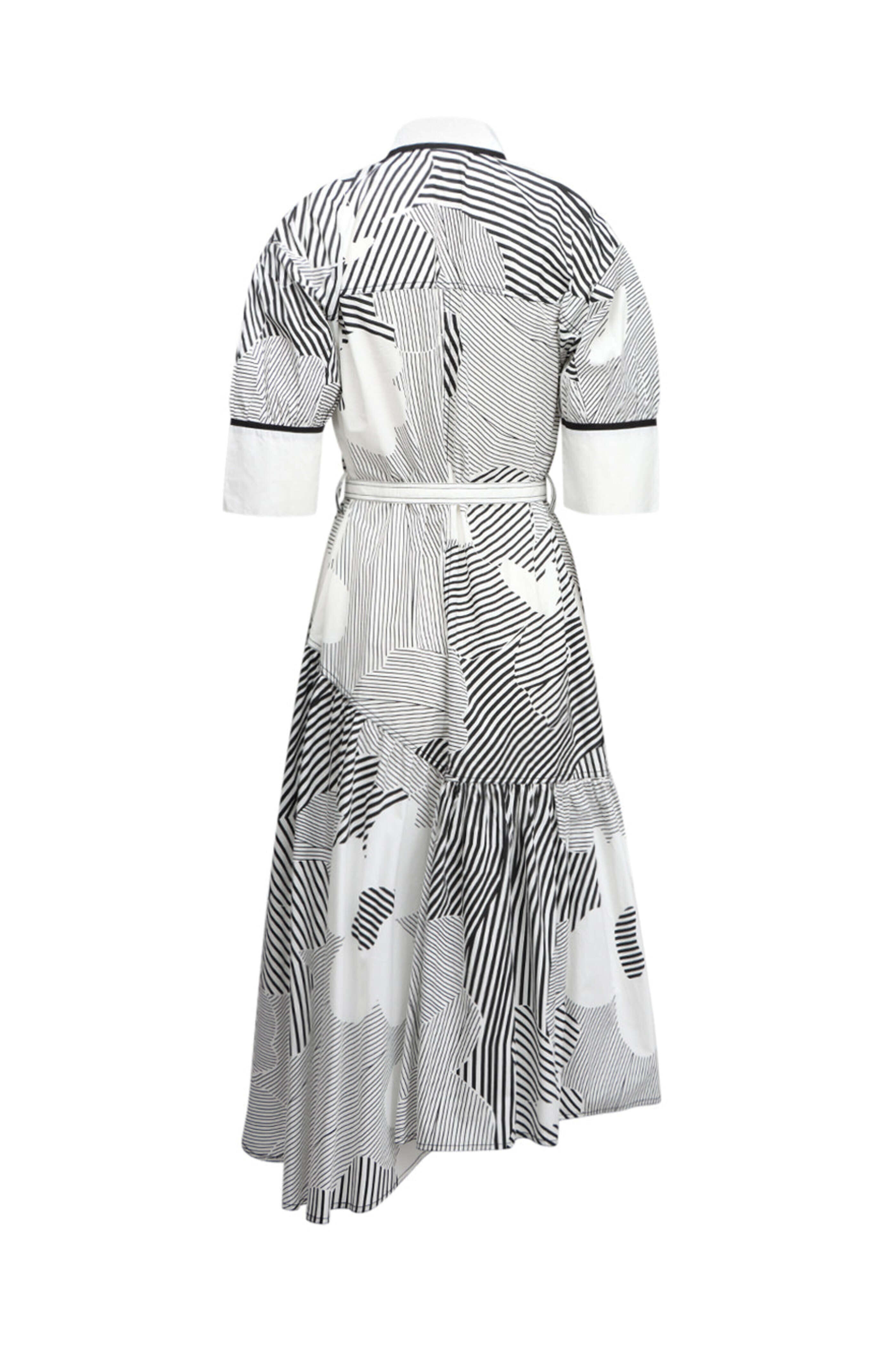 Lovebirds Ivory Sakura Stripe Sardinia Dress. Collar. Elbow length sleeves; button cuffs. Quarter button placket. Chest welt pockets. Hip welt pockets. Removable d-ring belt; self-fabrication. Aline silhouette. Asymmetrical hem. Midi length. 100% cotton.