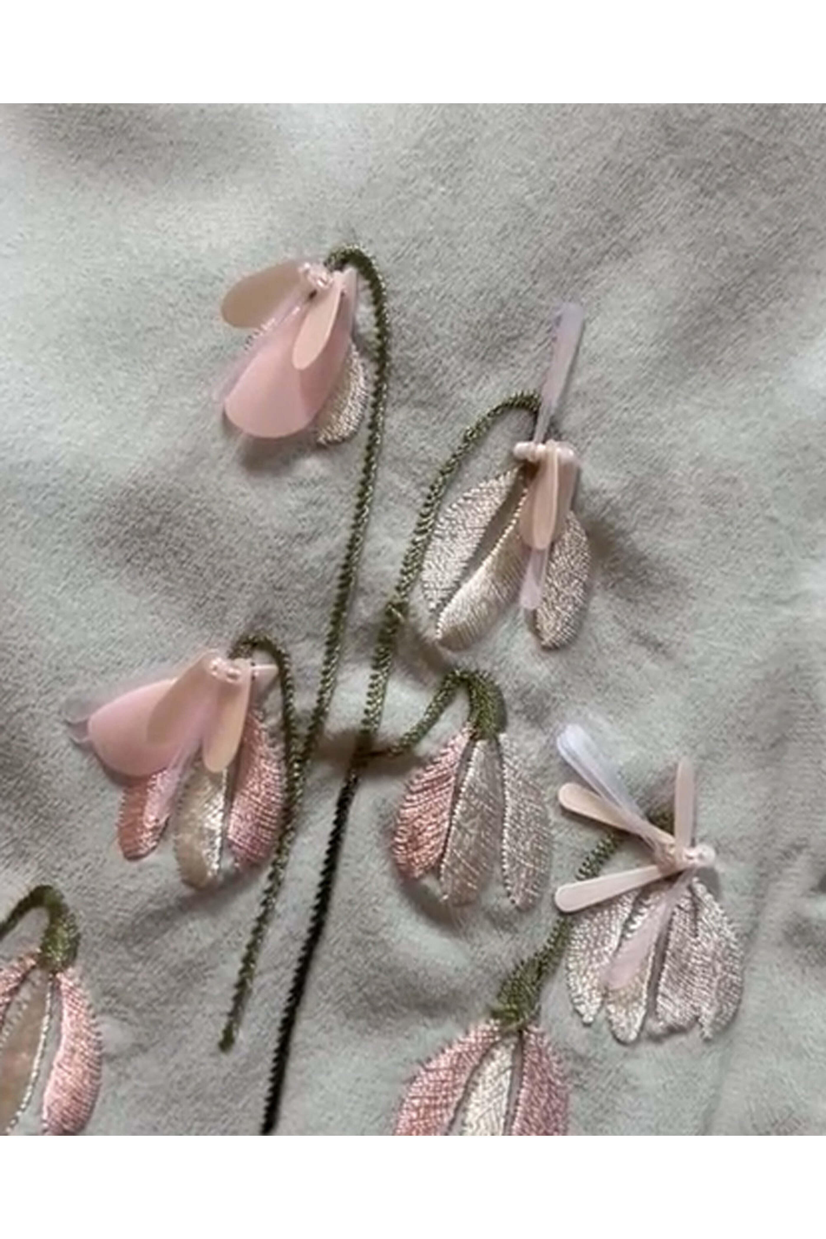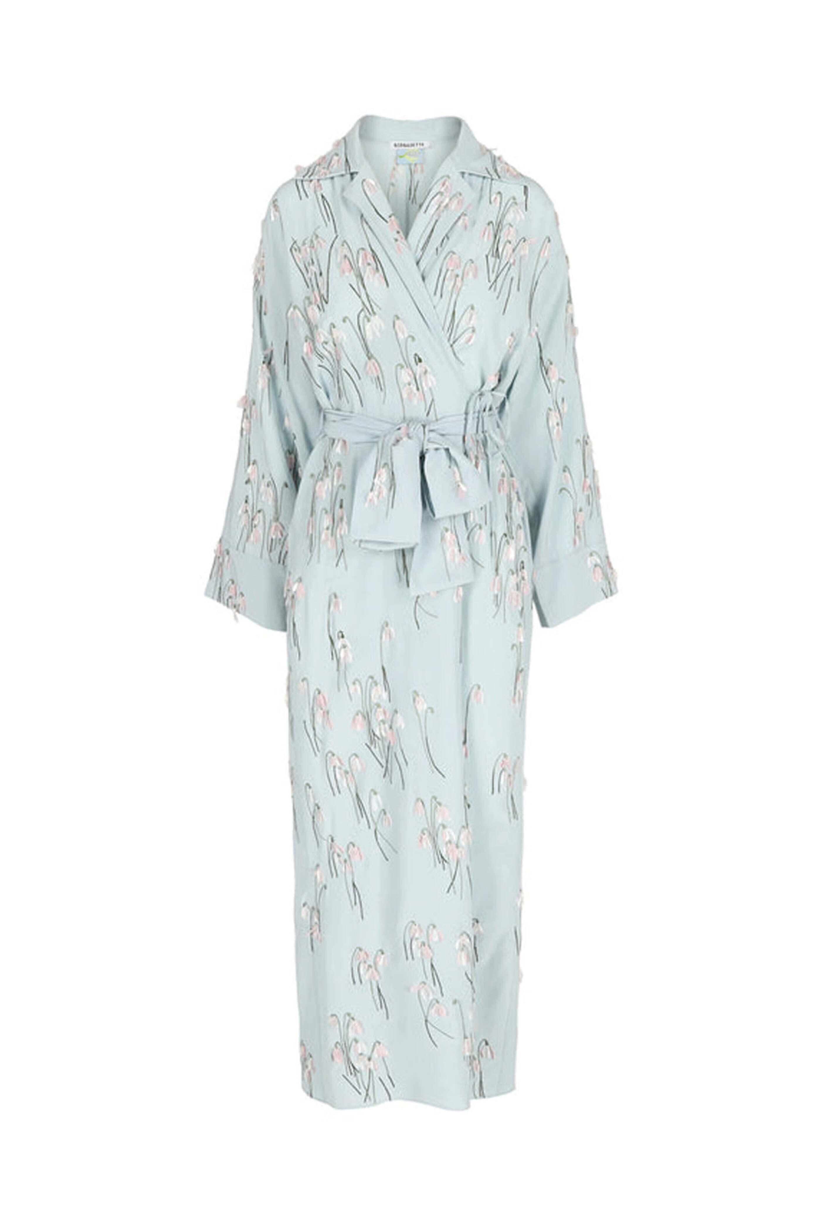 Bernadette Winter Blue Embellished Gisou Wrap Dress. Notch lapel. Drop shoulders. Long wide sleeves. Wrap silhouette. Removable self-tie belt; self-fabrication. Maxi length. Embellished detail throughout. 100% silk.