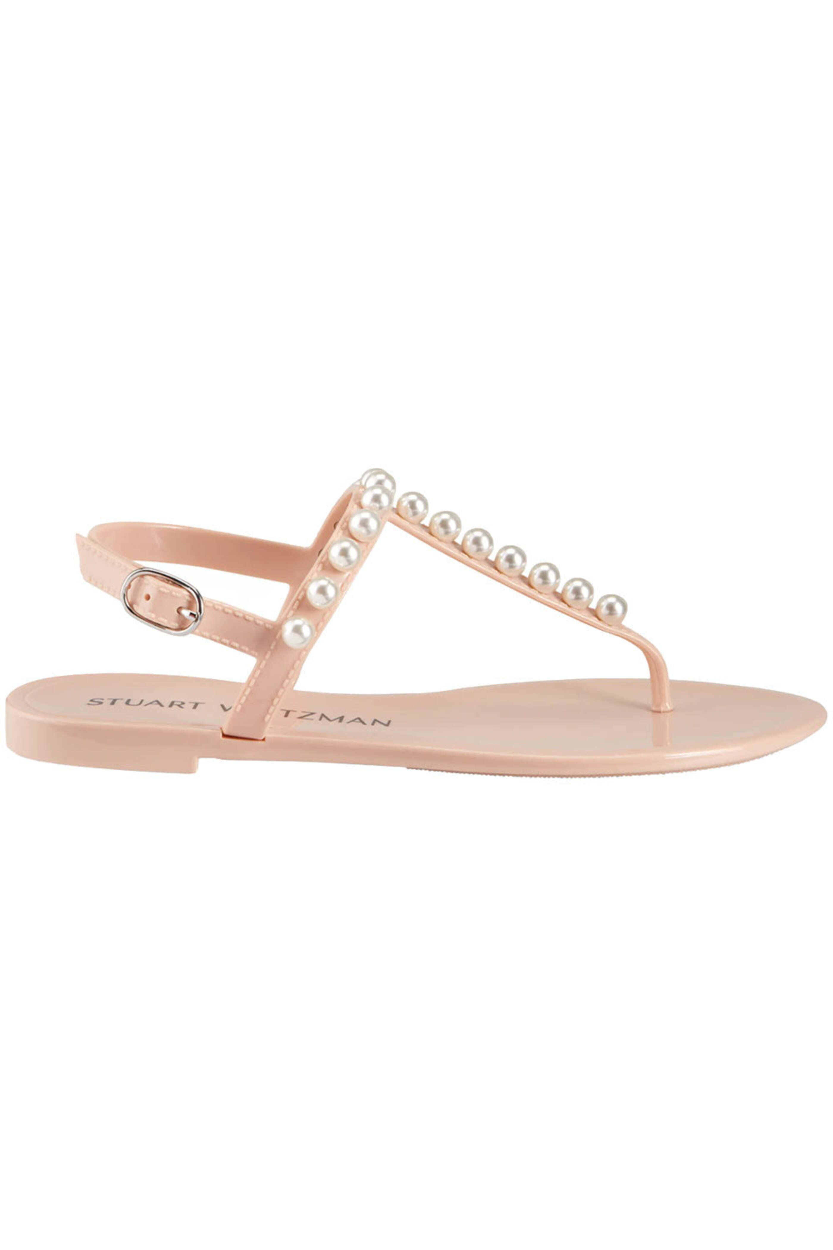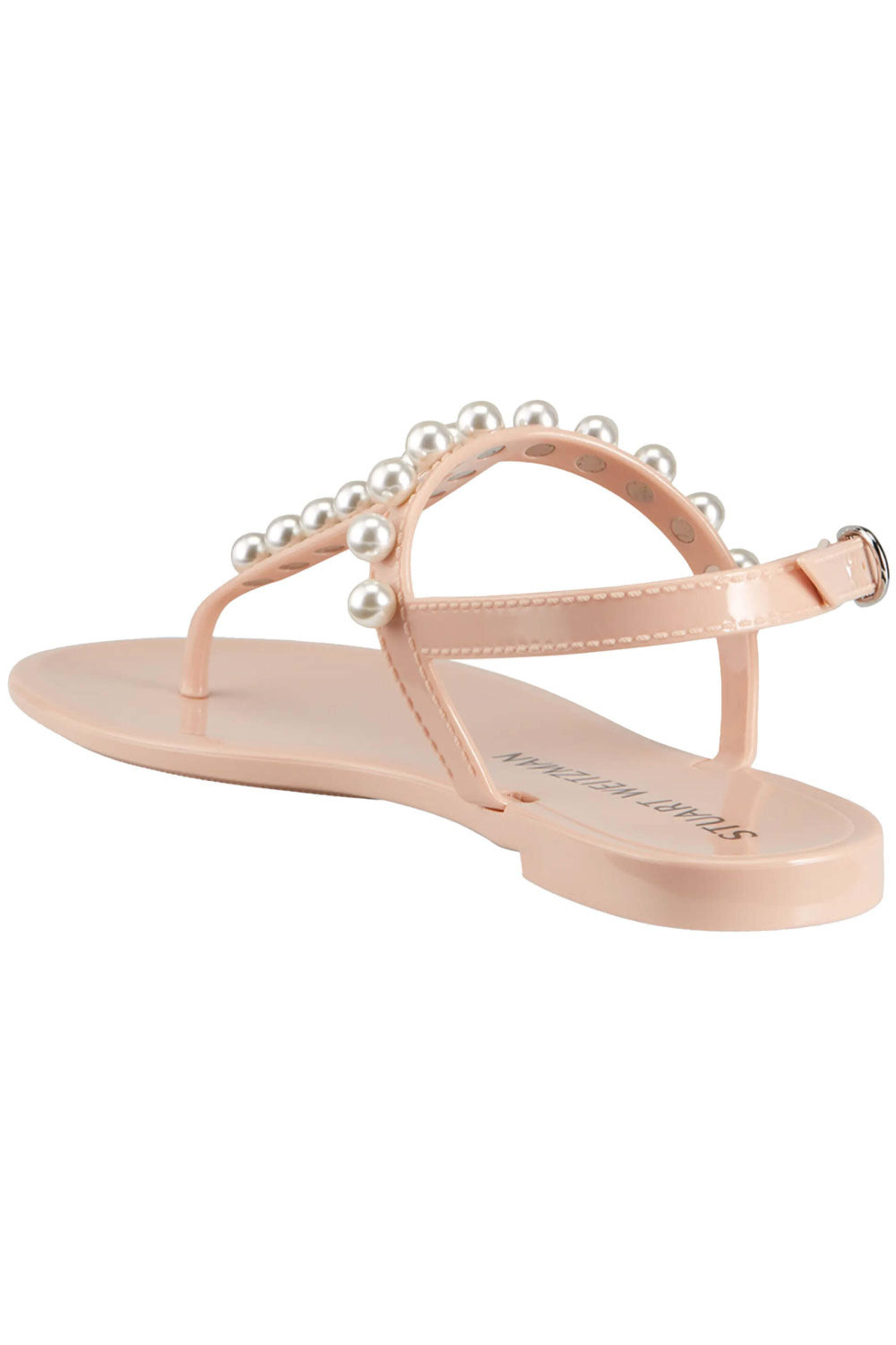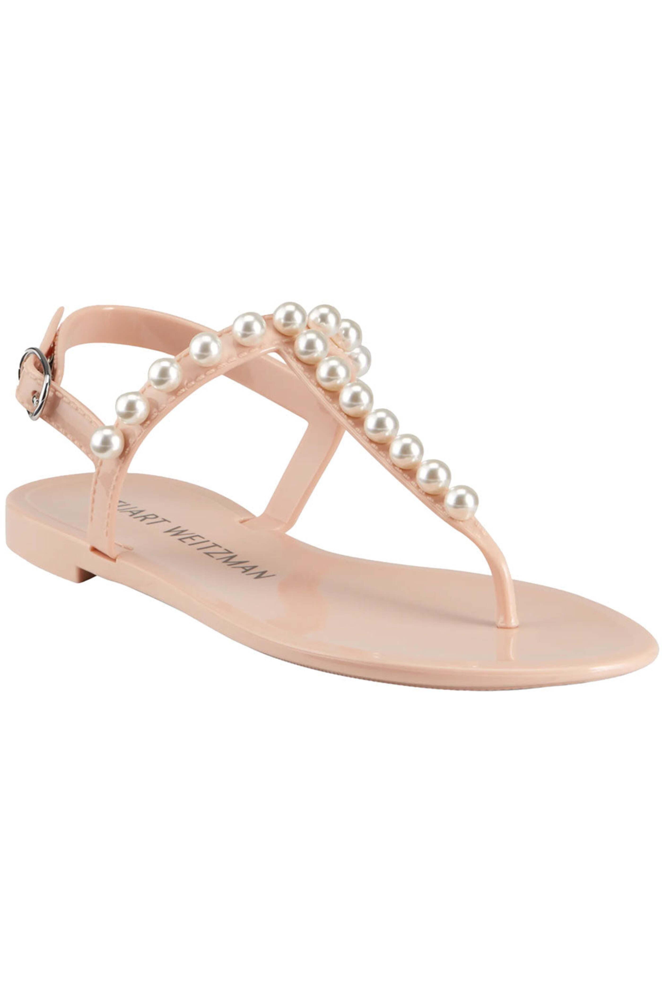 Stuart Weitzman Goldie Jelly Sandals in Poudre. Round open toe. T strap vamp. Adjustable ankle strap with buckle closure. 0.2 flat heel. Pearl trim detail. PVC upper, lining and sole. Made in Spain.