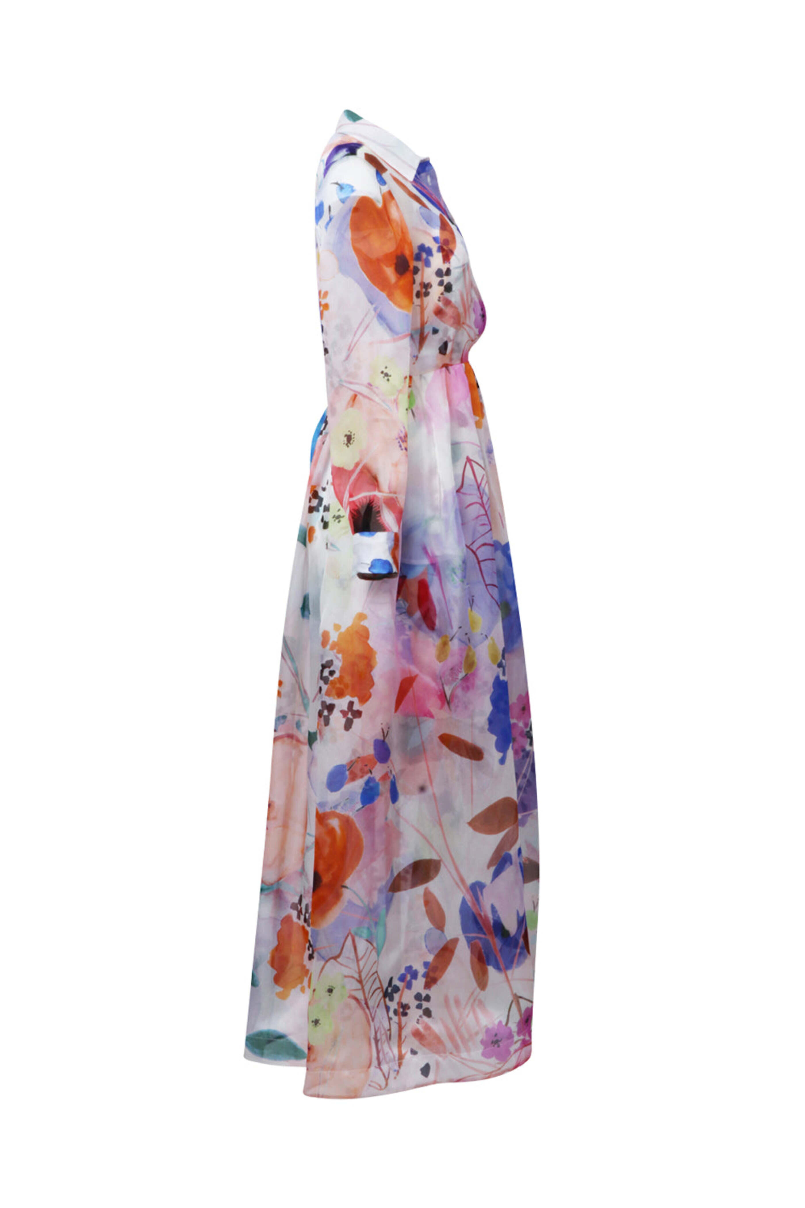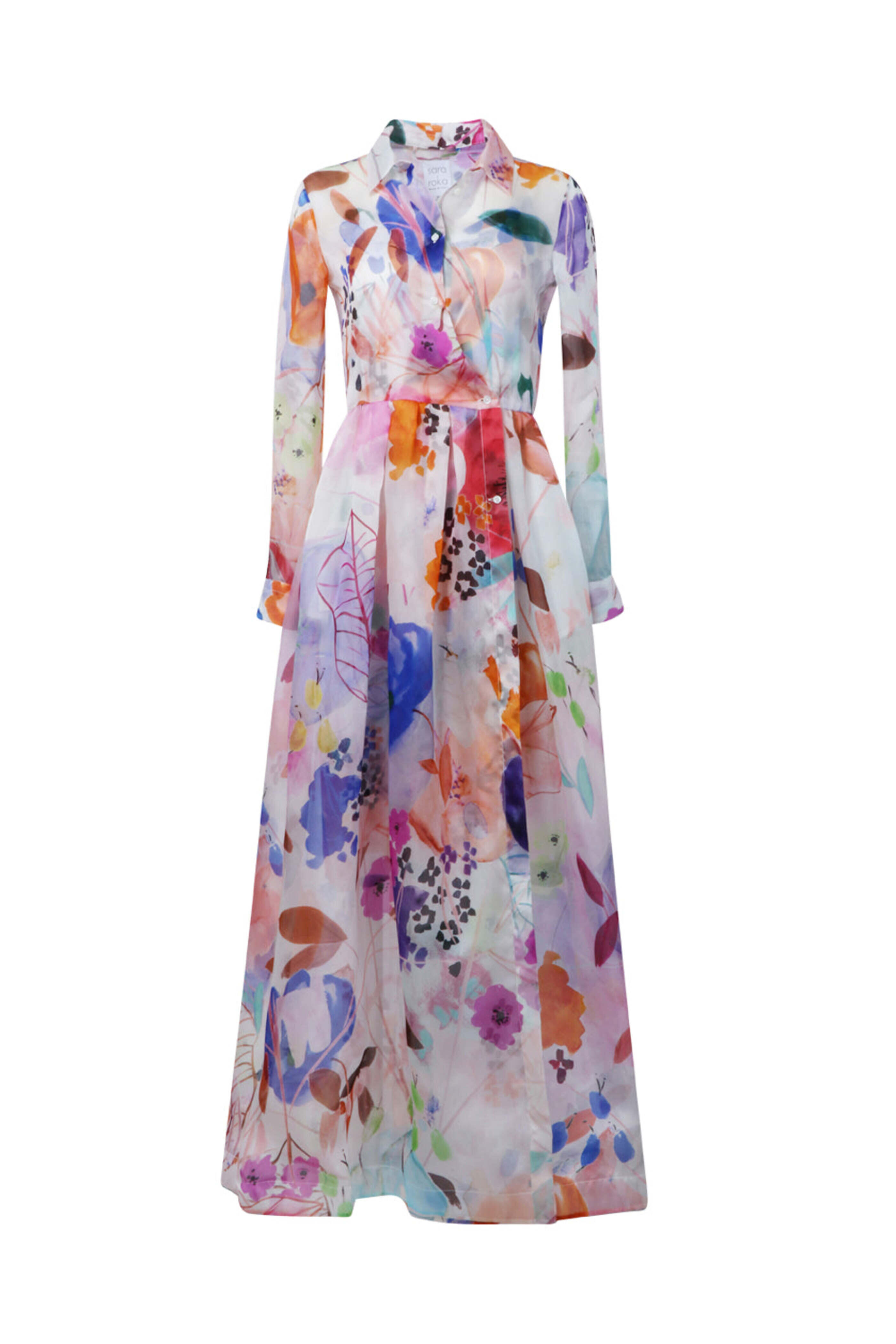 Sara Roka Fall Garden Long Sleeve Elenat Maxi Dress. Collar. ¾ length sleeves; button cuffs. Asymmetrical quarter button closure. Waist seam detail. Side slip pockets. Aline silhouette. Midi length. Made in Italy.