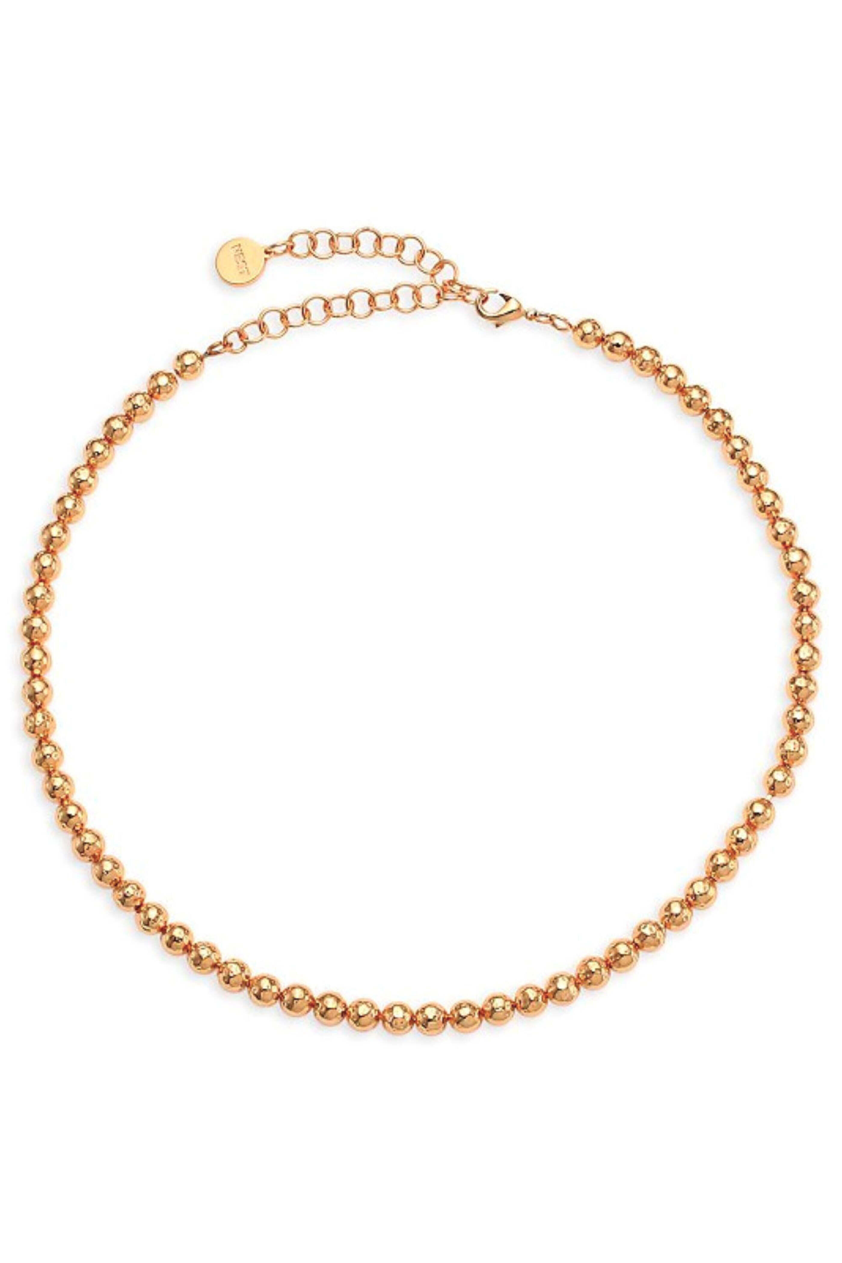 - Nest Jewelry Hammered Gold Bead Short Necklace 22k gold plated brass Hammered finish Beaded throughout Adjustable length: 15"-18" Lobster claw clasp