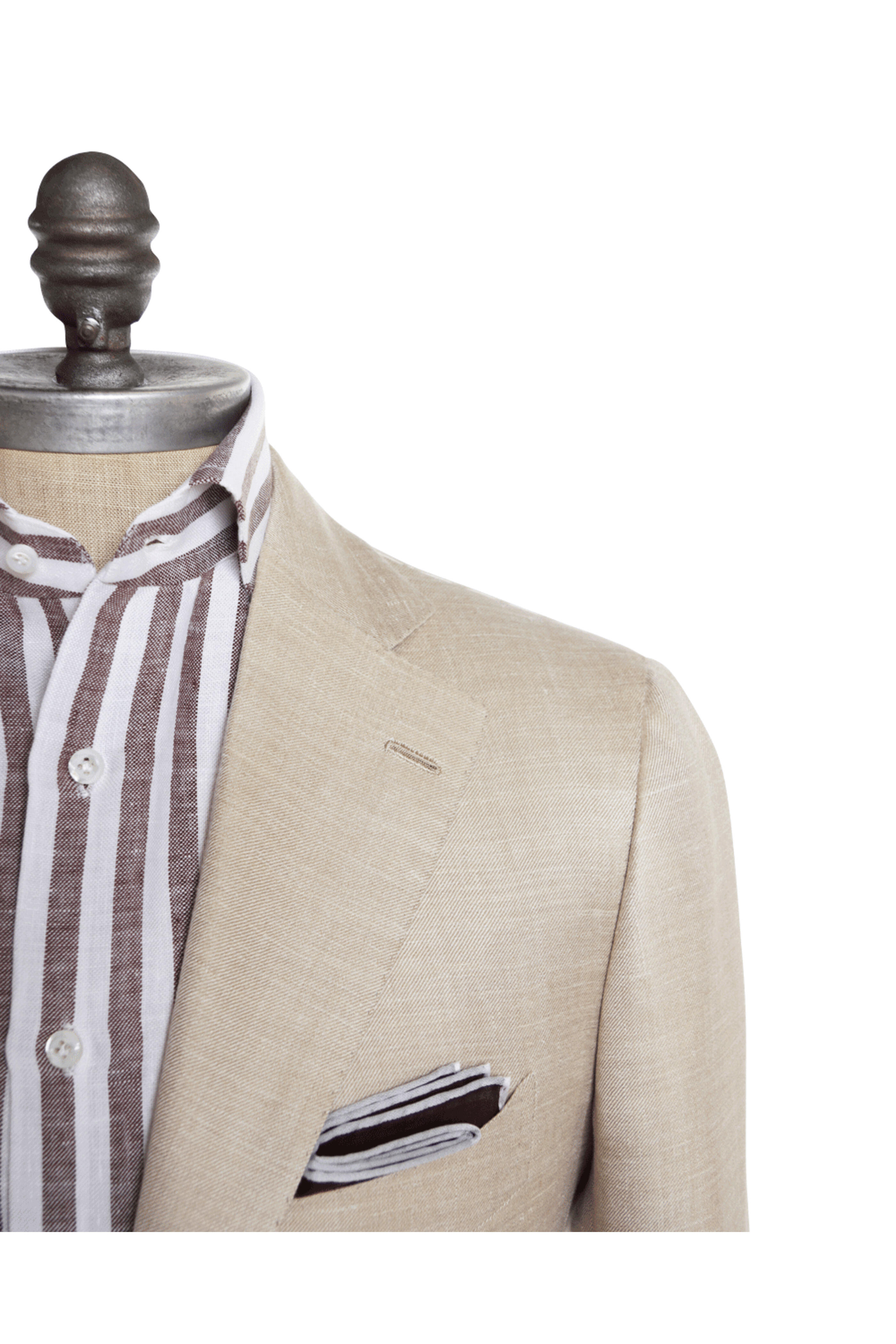Cesare Attolini Beige Solid Sportcoat. Notch lapels. Three button jacket. Front left chest welt pocket. Waist flap pockets. Double back vents. Unfinished buttonholes. Pick stitch detailing. Drop: 7. Half-lined. Cupro lining. Made in Italy. 46% cashmere 26% silk 28% linen.