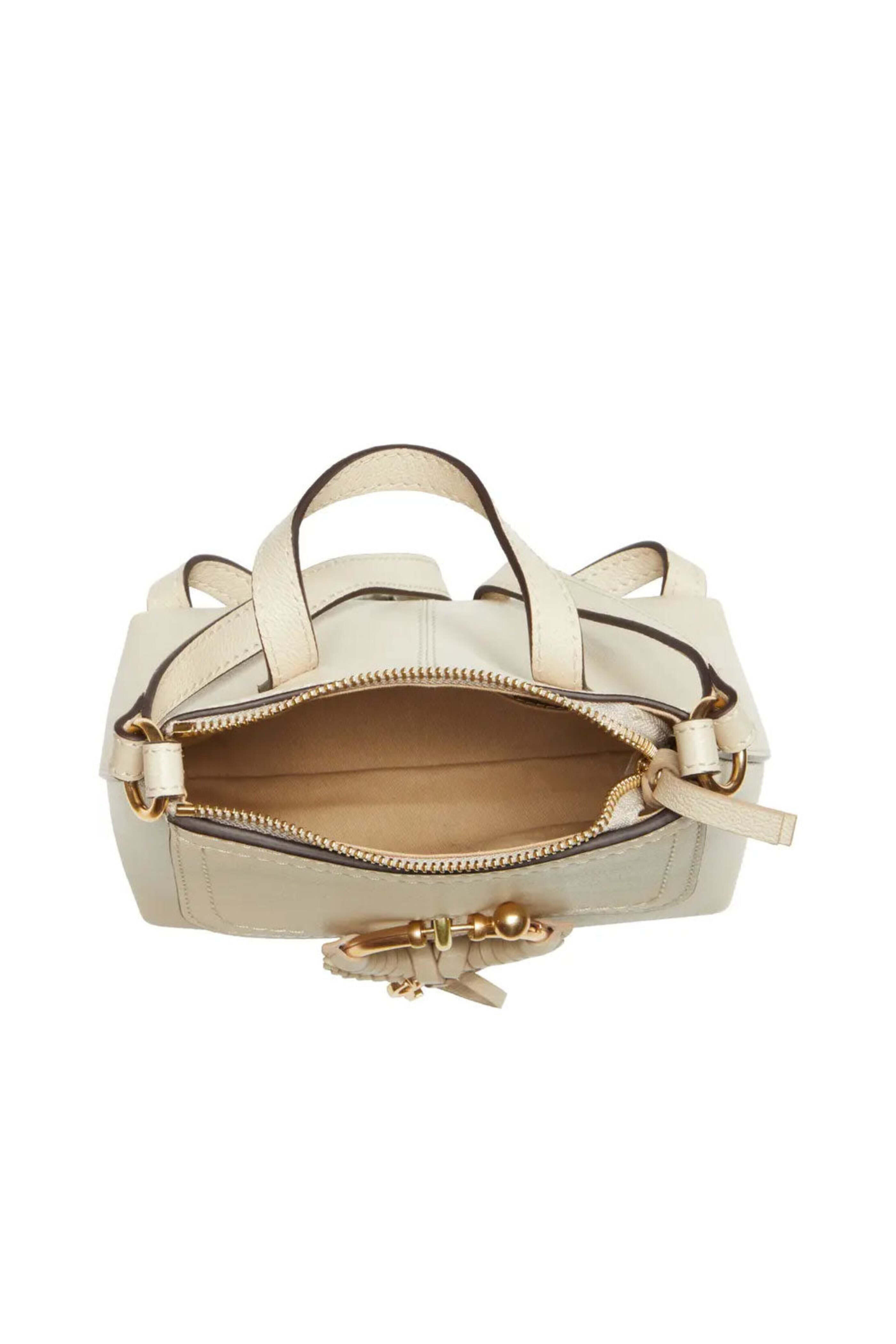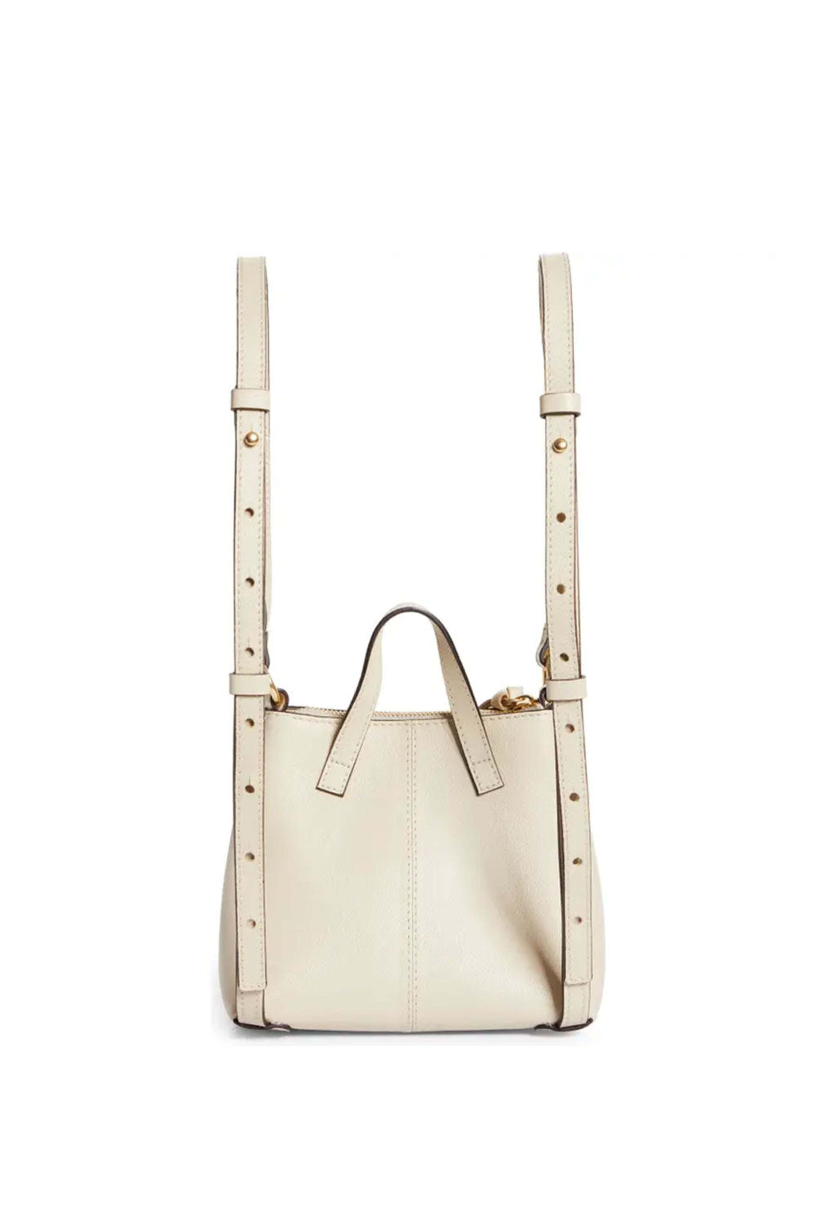 See by Chloe Joan Leather Backpack in Cement Beige. Zip closure. Adjustable and comfortable shoulder straps. One main compartment. 1 flat pocket with a flap closed by an oversized round hook on the front. 3 card slots inside. Gold brass finish. Small grain cowhide outer. Cotton canvas lining. 7.9 W x 7.1 H, 4.1 D. Imported.
