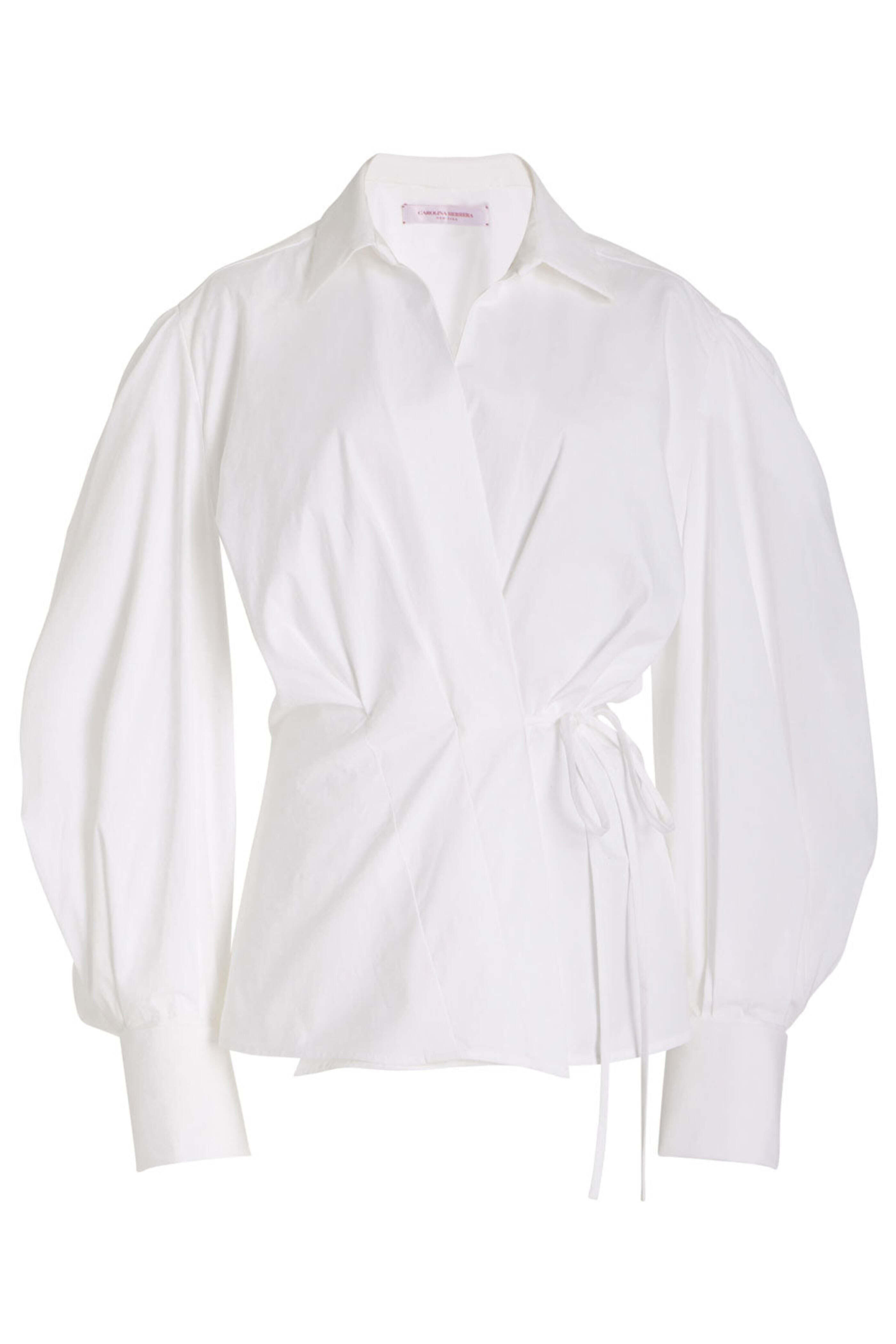 Carolina Herrera White Puff Sleeve Wrap Blouse. Spread collar. Long puff sleeves; button cuffs. Wrap style. Self-tie closure at waist. Made in USA. 97% cotton, 3% polyurethane.
