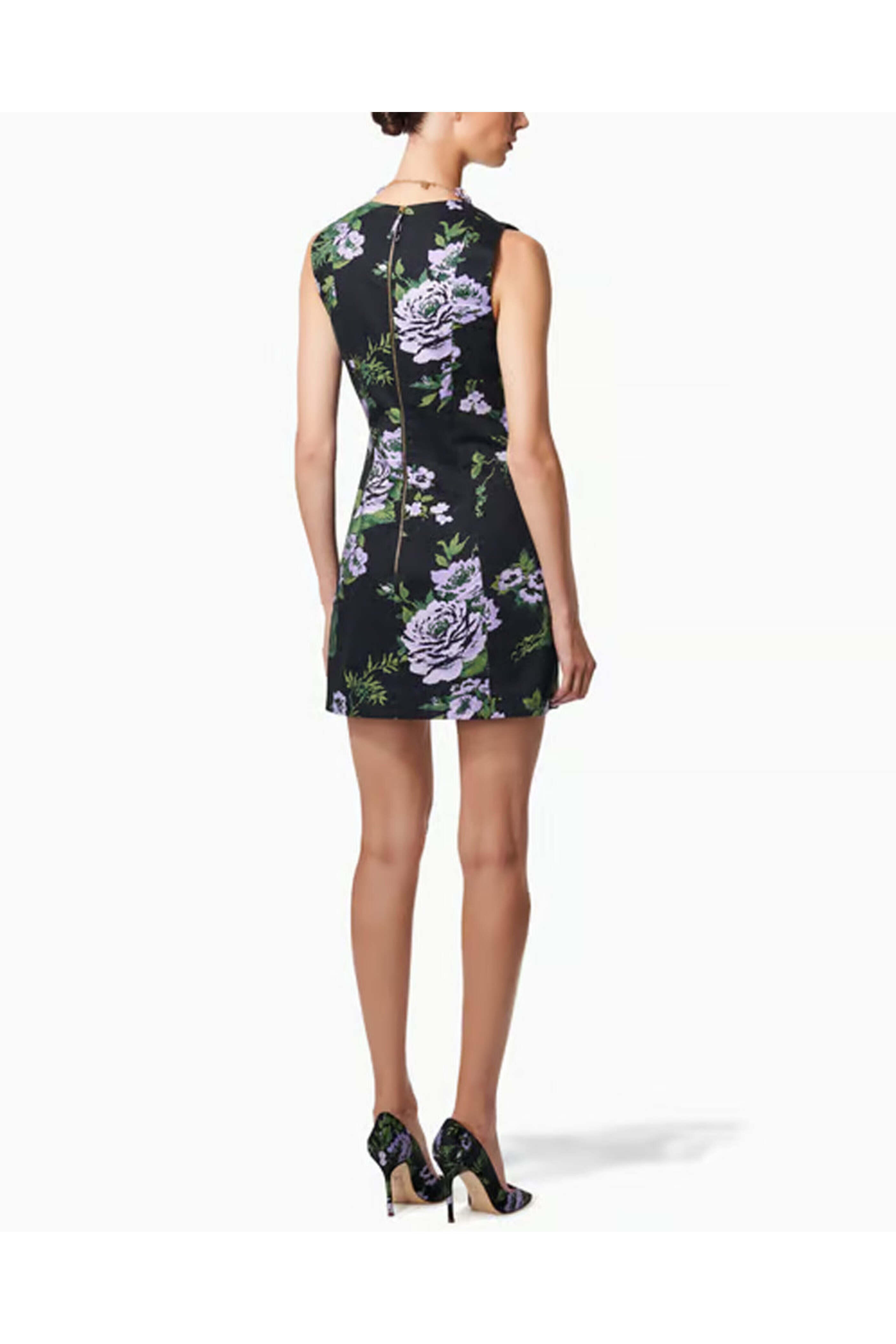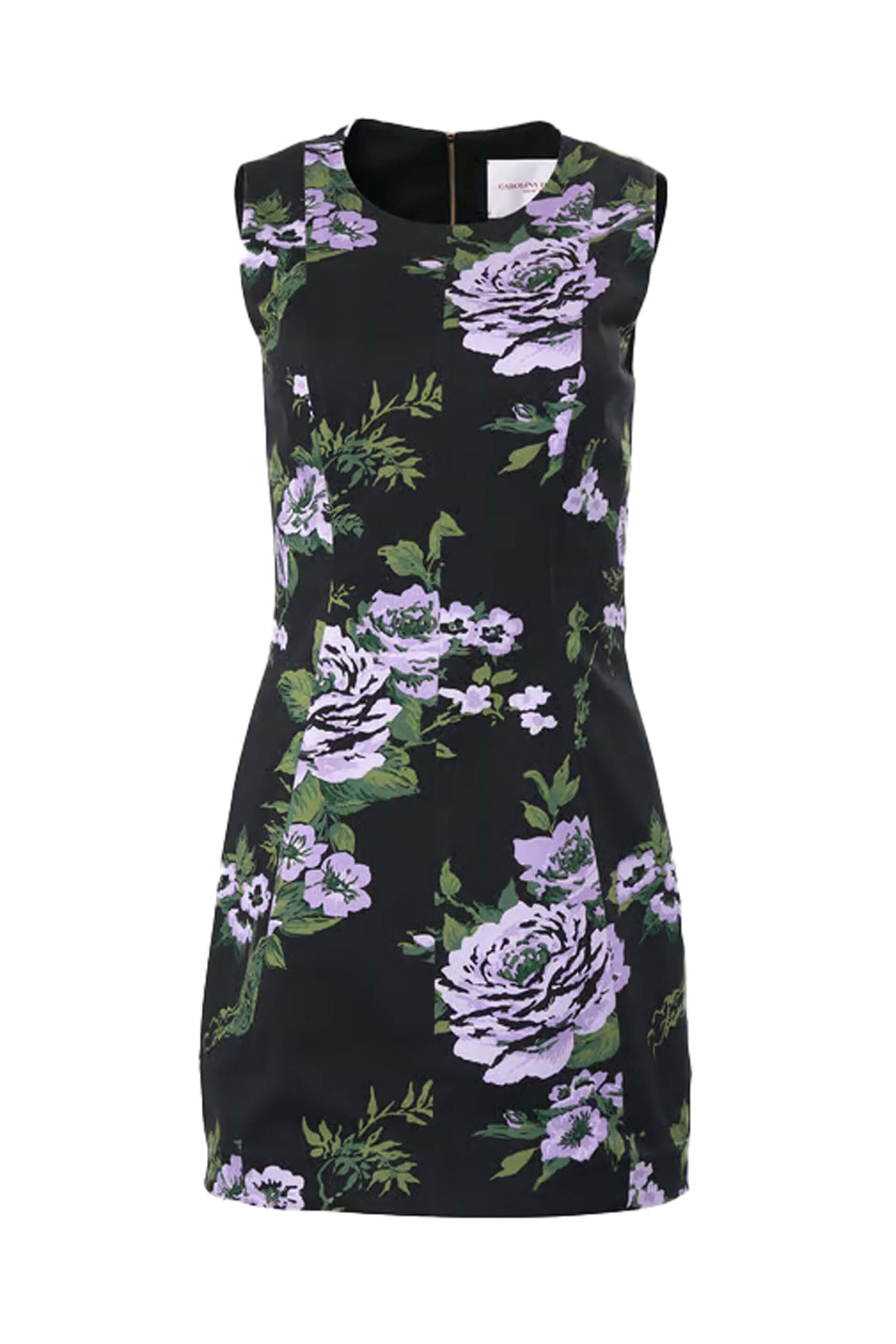Carolina Herrera Black Floral Print Sleeveless Mini Dress. Round neck. Sleeveless. Back zip closure. Slim silhouette. Mini length. Made in Italy. 97% cotton, 3% elastane.