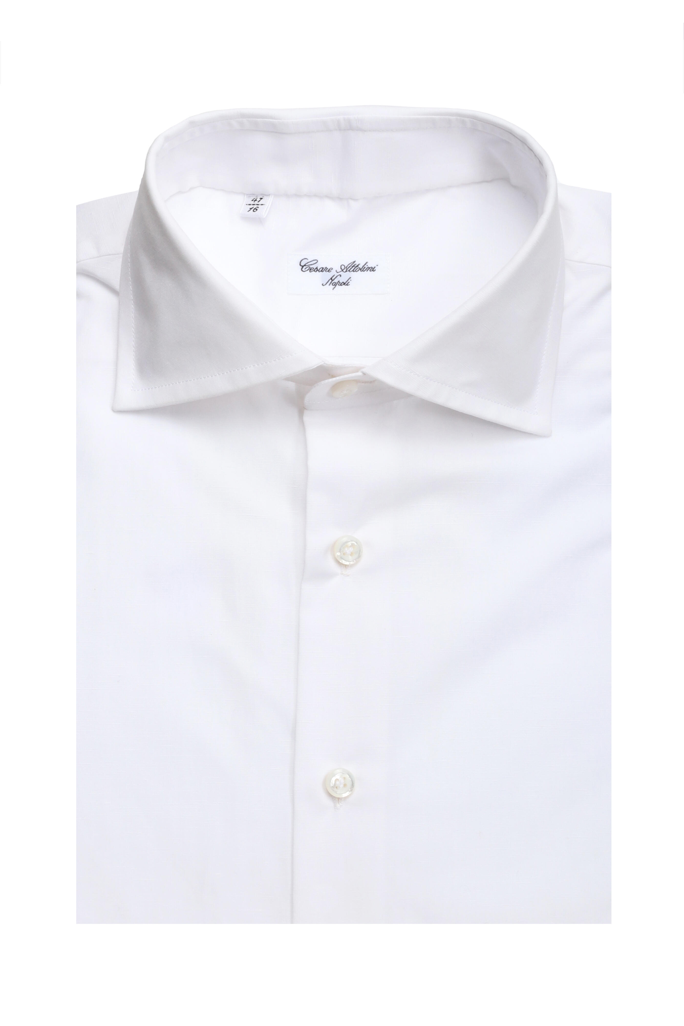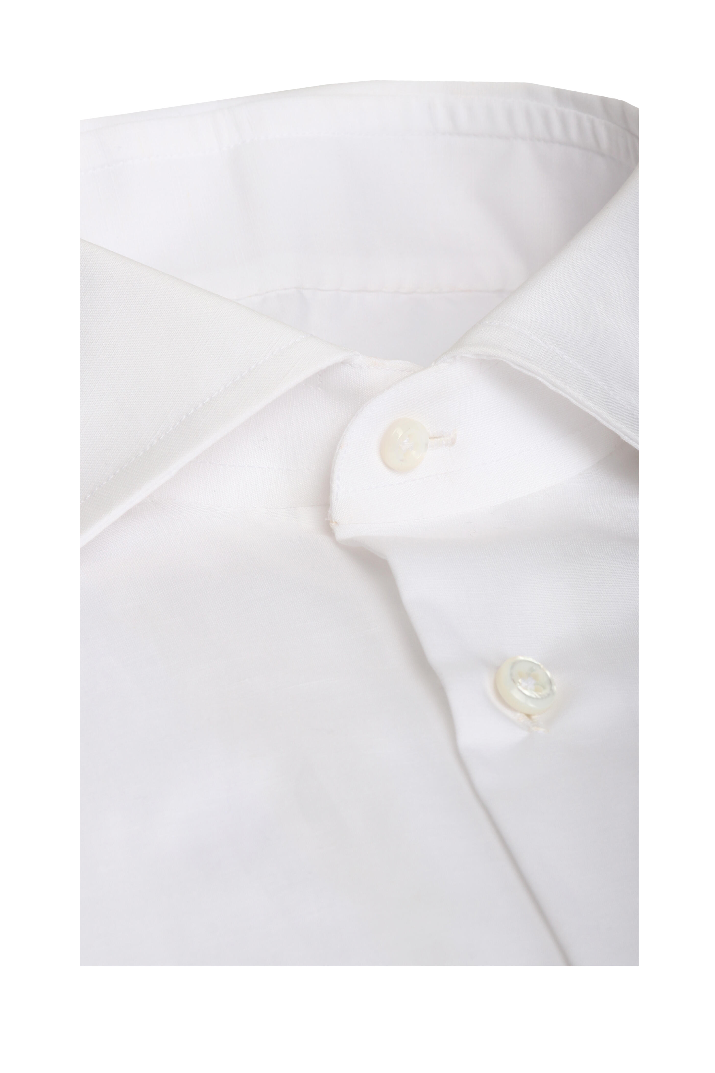 Spread collar. French front button placket. Single button barrel cuffs. Made in Italy. 66% cotton, 34% linen. Dry clean.