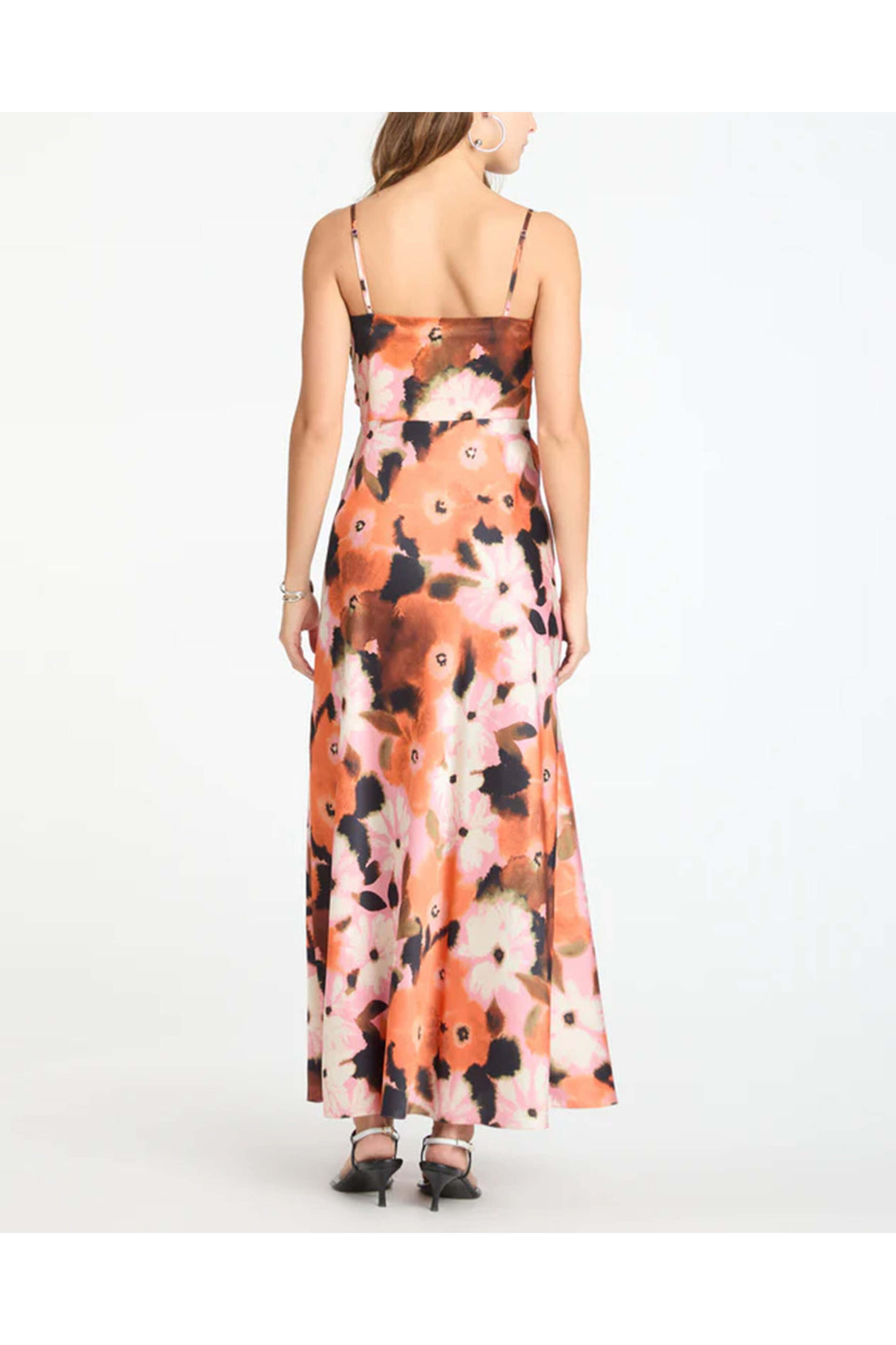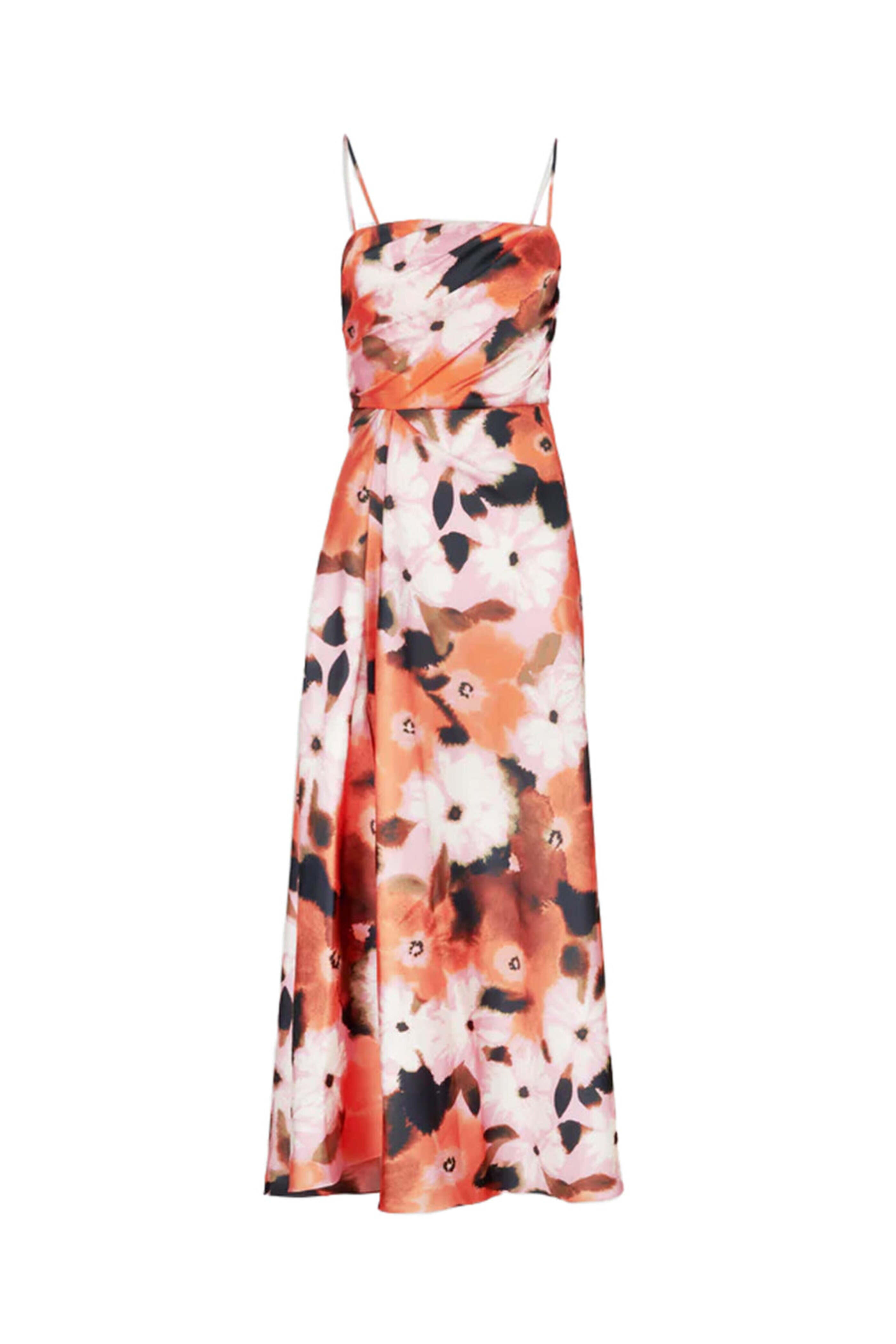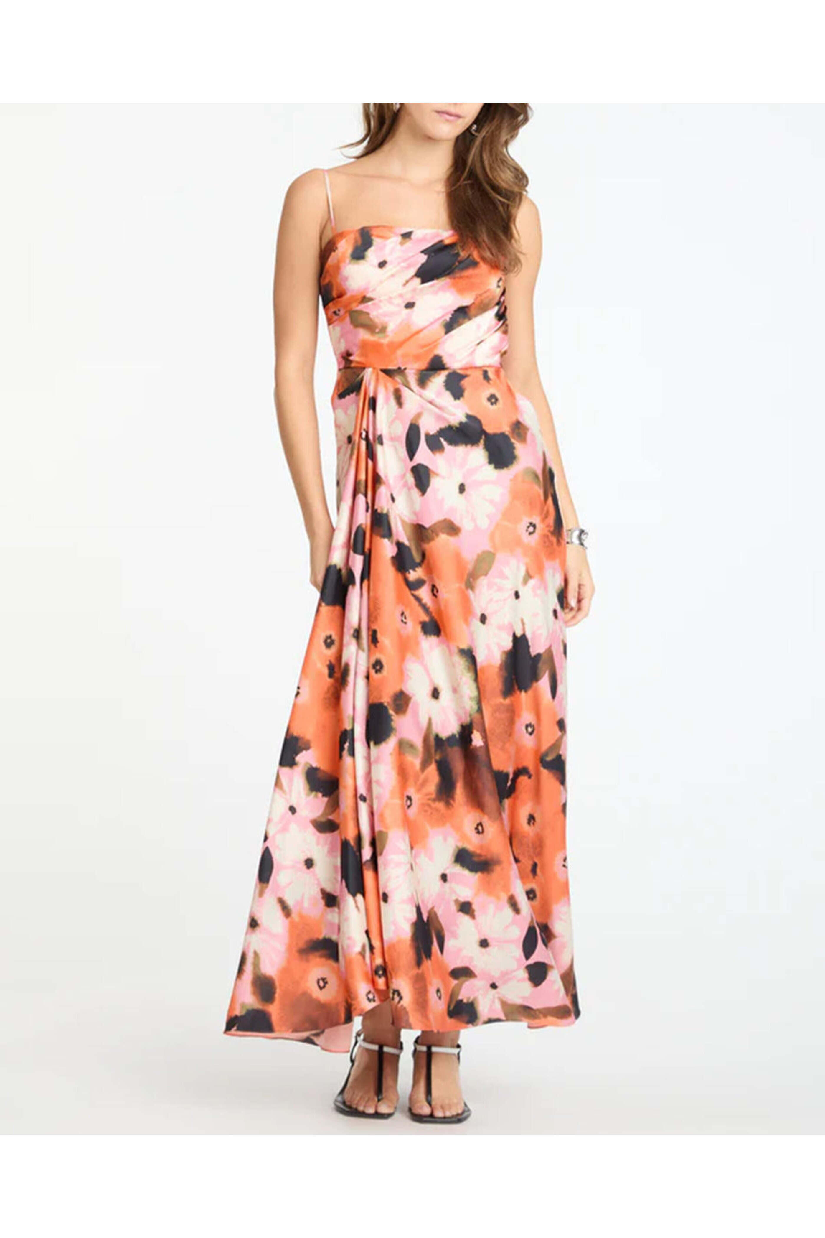 Tanya Taylor Peony Chloe Dress. Square neck. Square back. Sleeveless; thin adjustable shoulder straps. Concealed side zip closure. Drape detail. Aline silhouette. Midi length. 100% polyester.