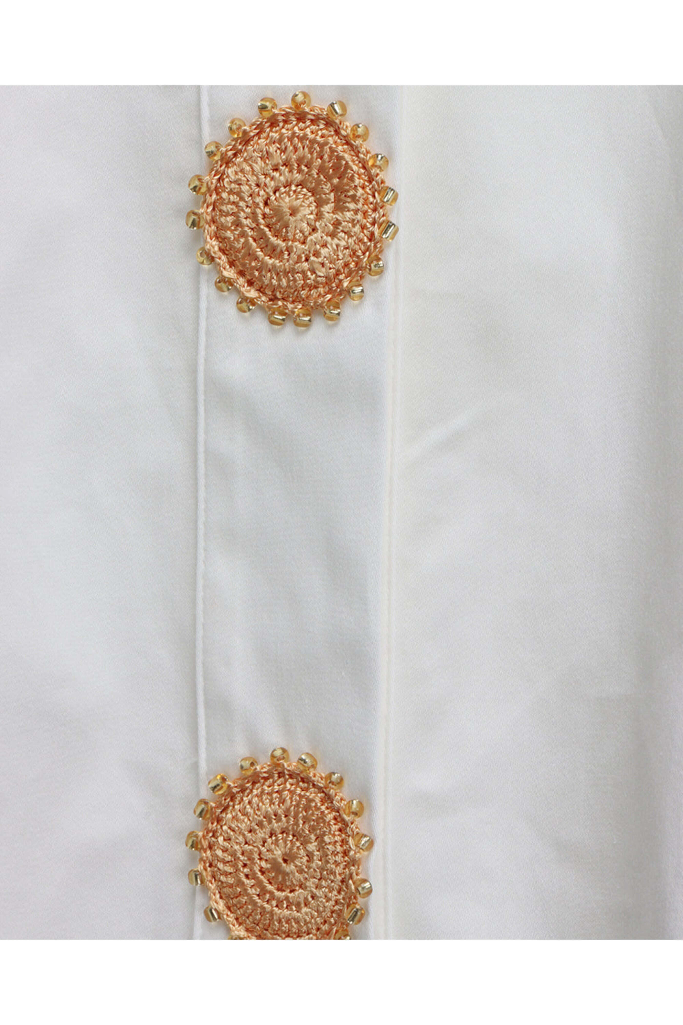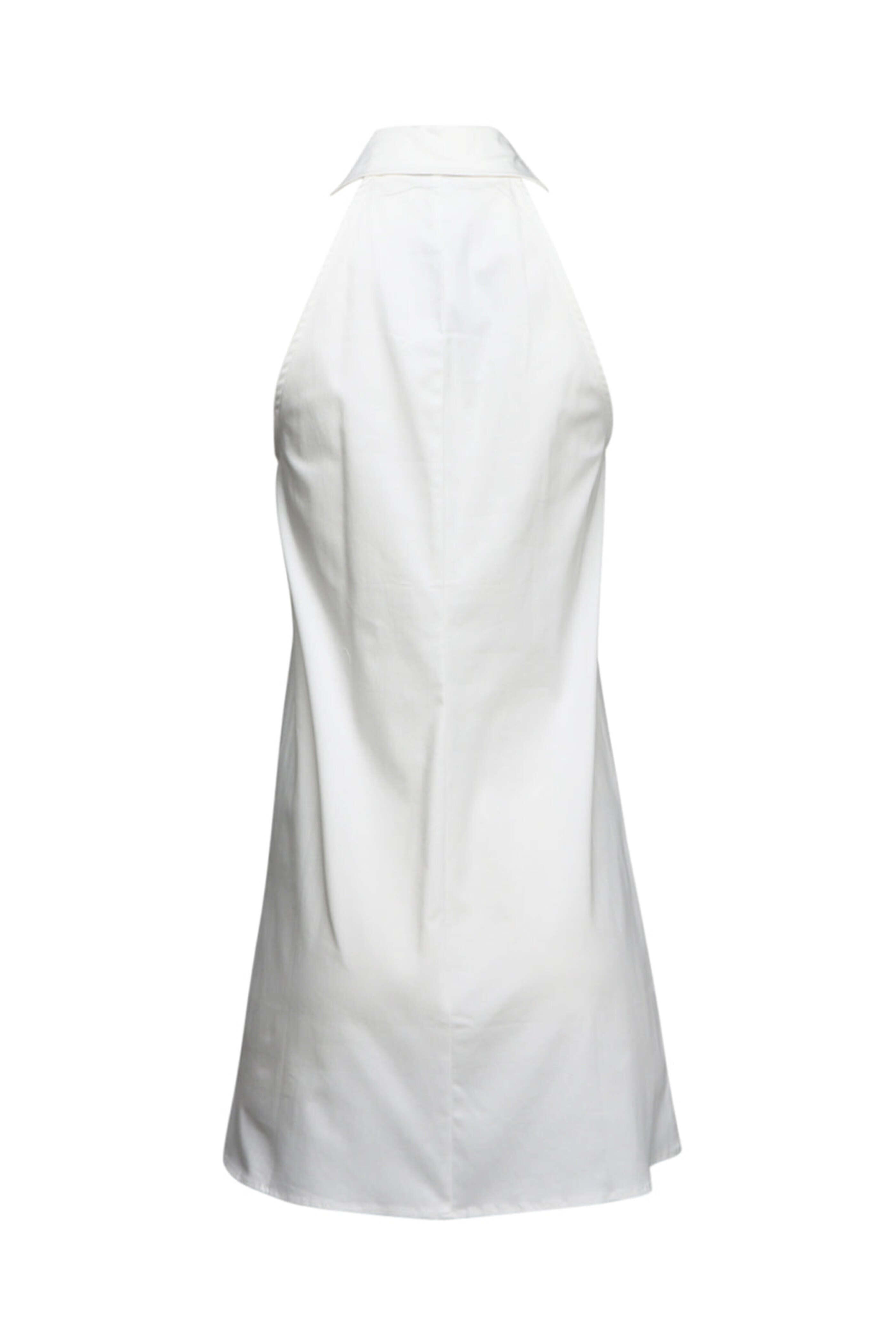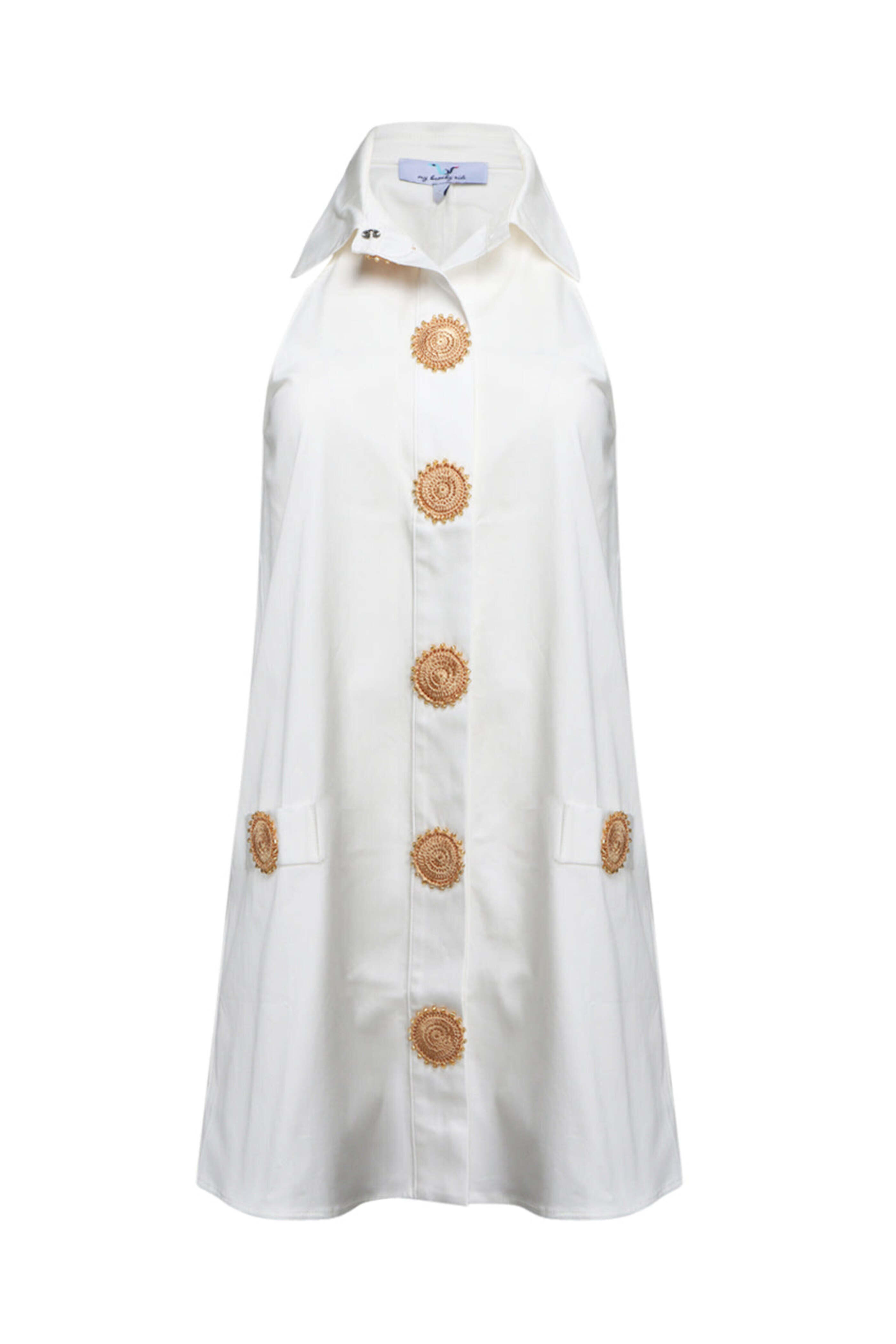 My Beachy Side Ivory Amber Mini Dress. Collar. Sleeveless. Button down front closure; snap button with woven cover detail. Hip welt pockets; woven detail. Mini length. 96% cotton, 4% elastane.