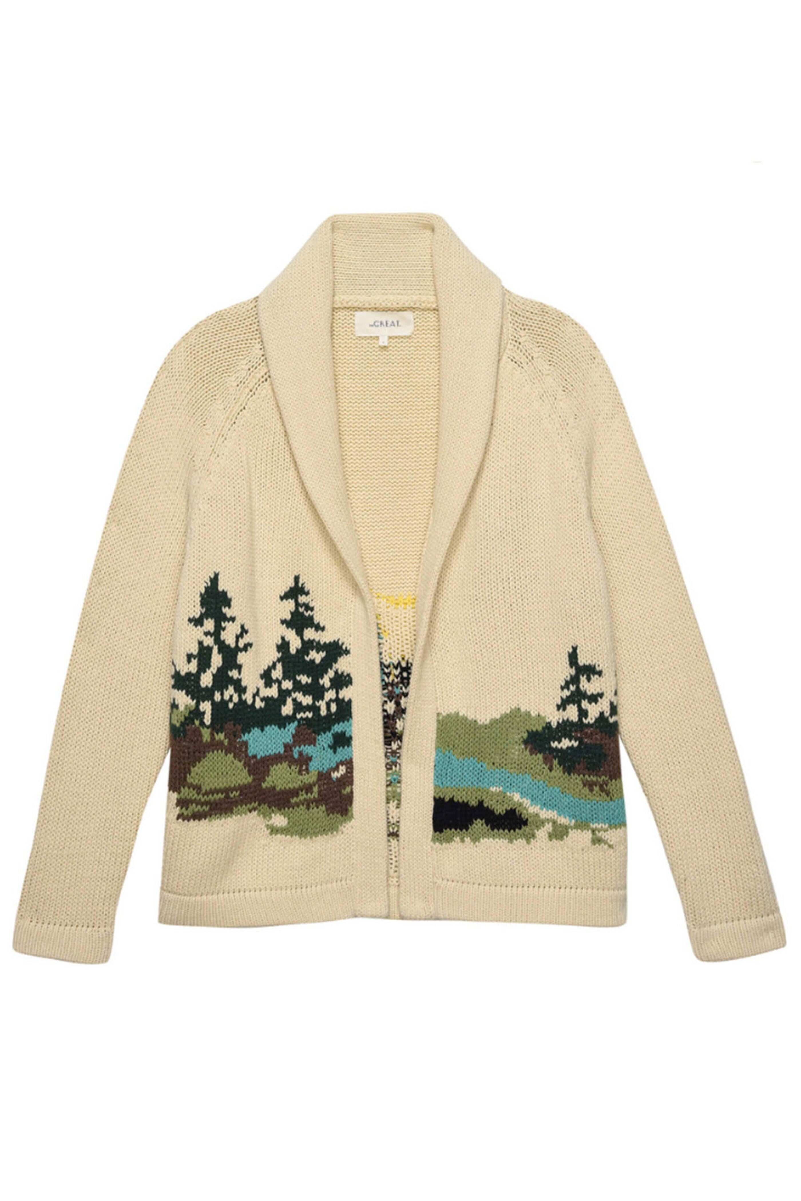 The Great The Camp Lodge Cardigan in Cream. Shawl neck. Long raglan sleeves. Open front. Relaxed fit. Knit fabrication. 60% cotton, 40% acrylic.