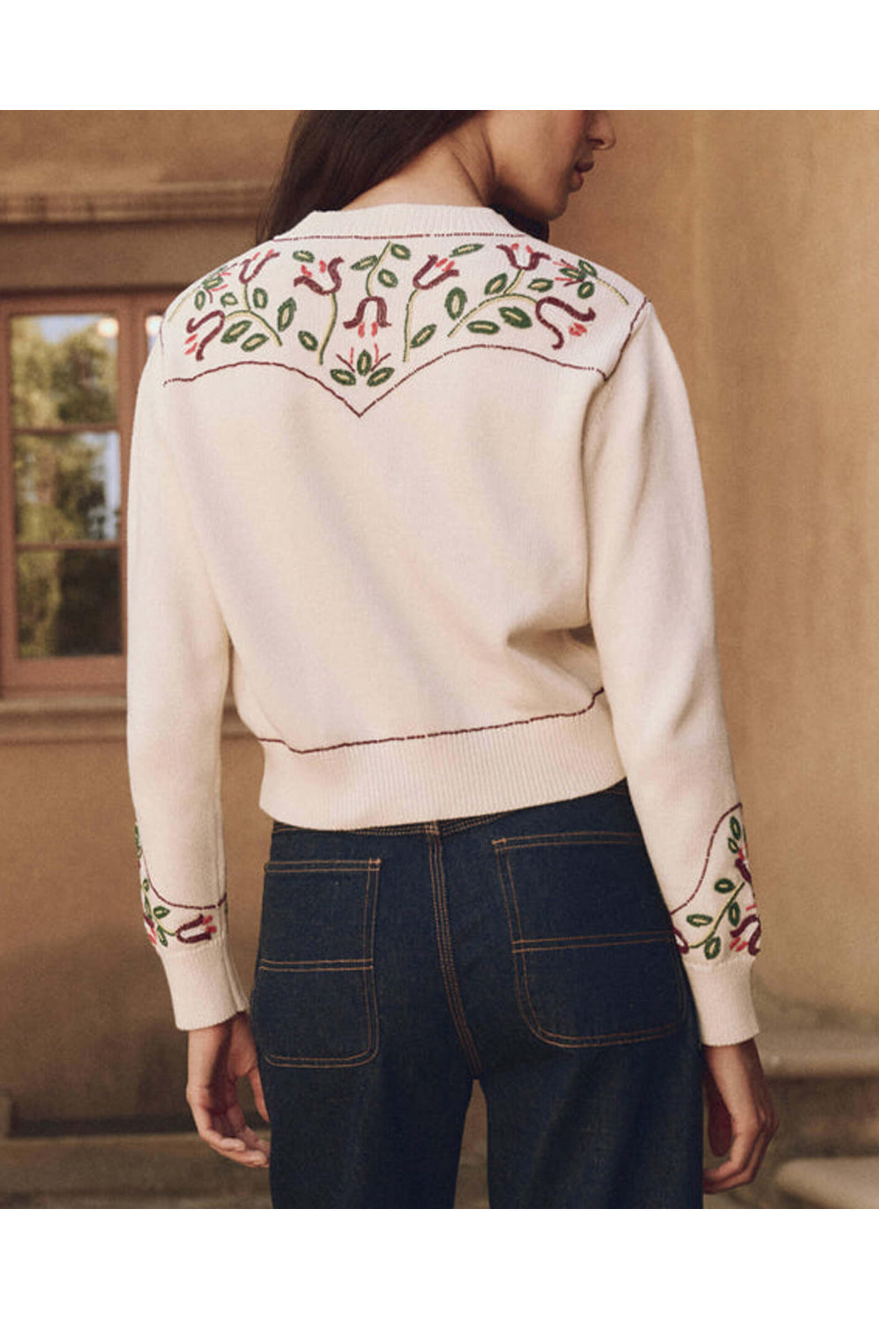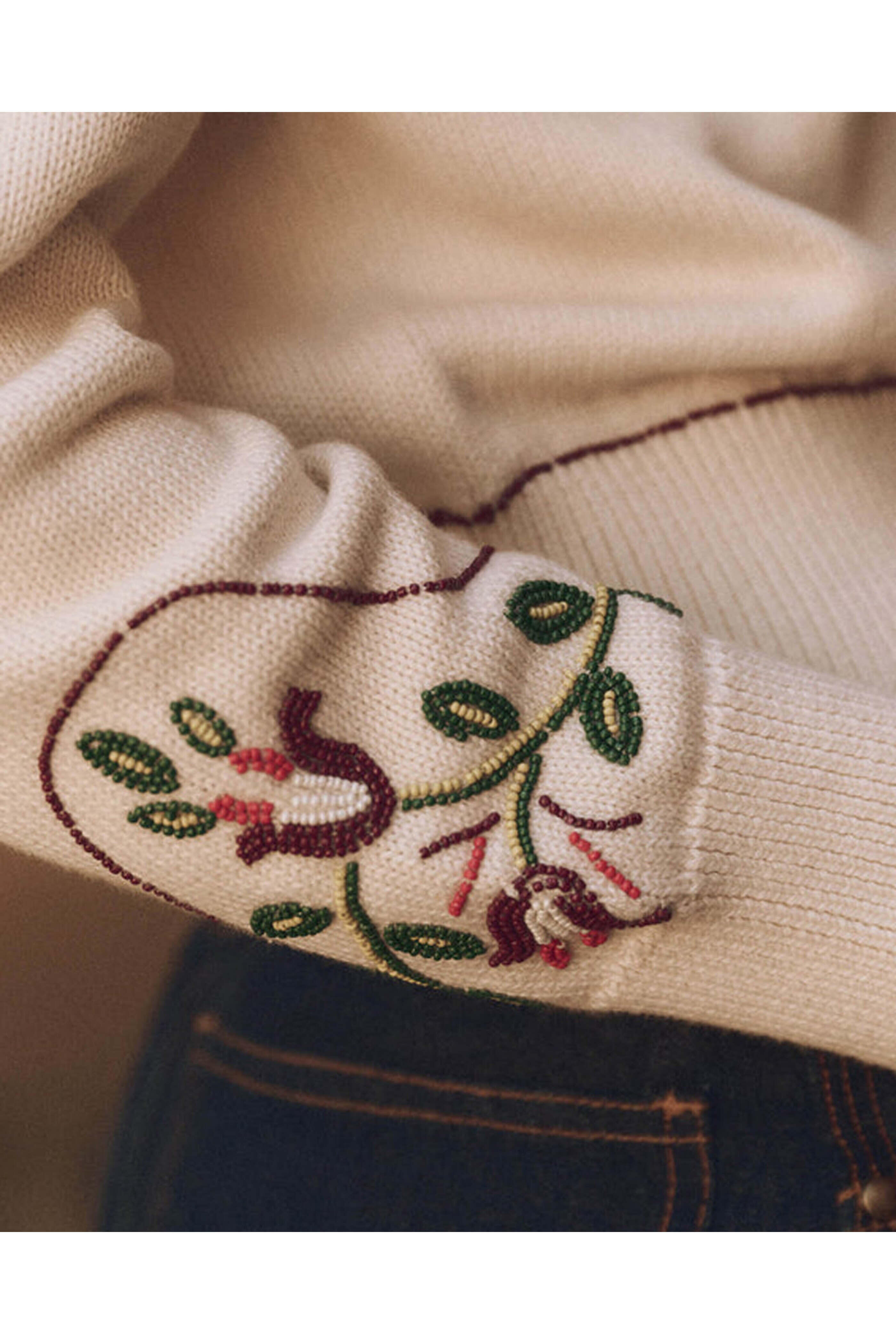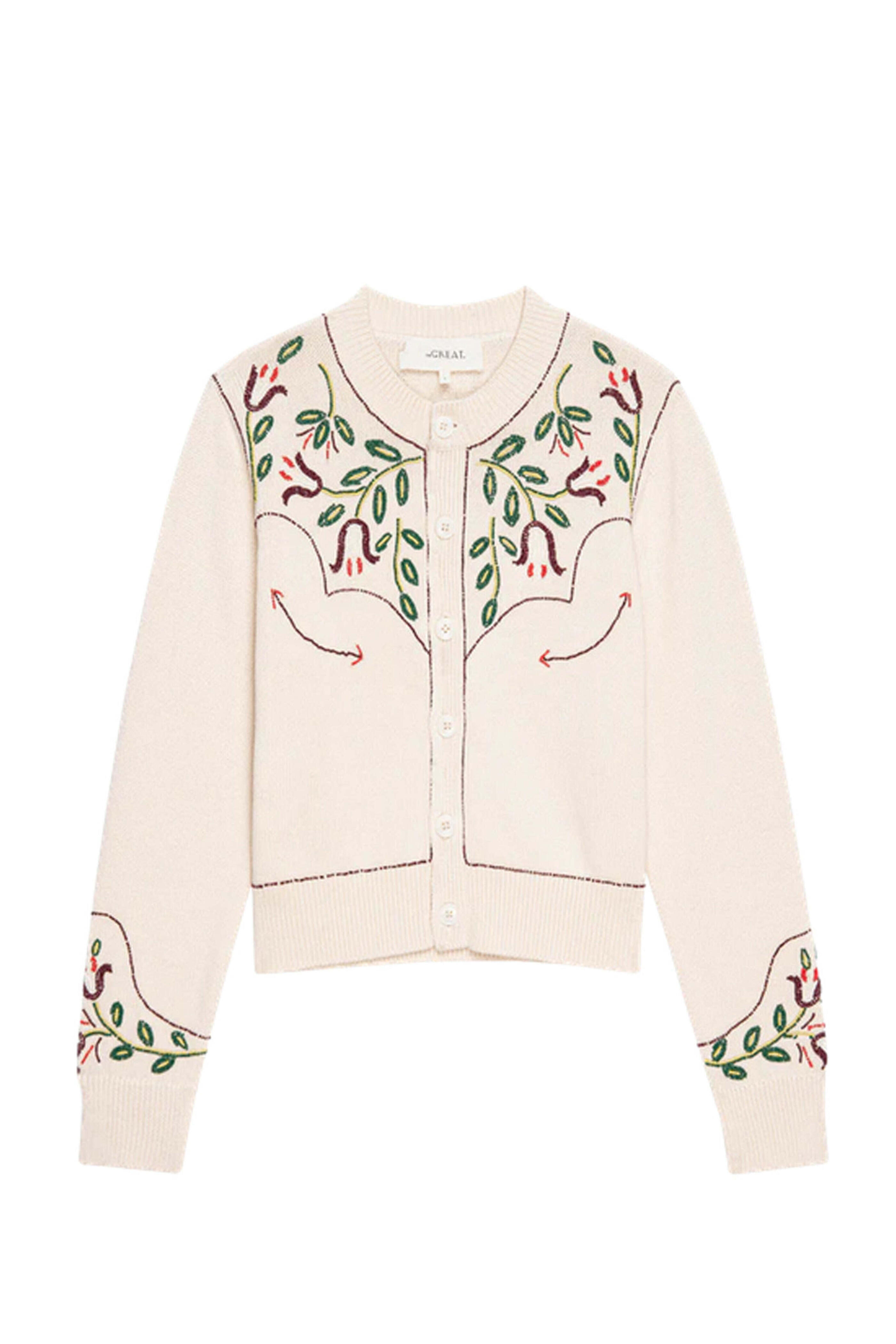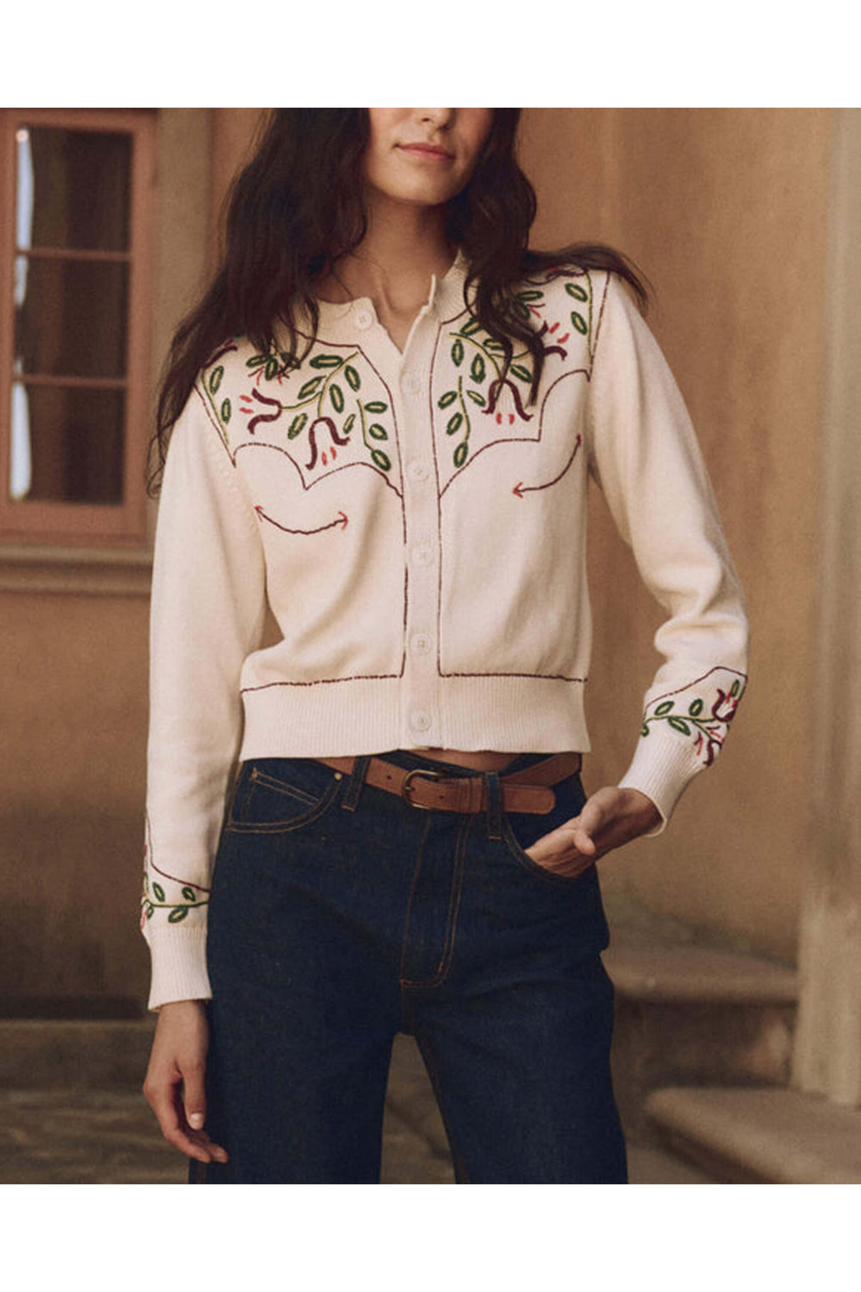 The Great Natural Western Beaded Cardigan. Round neck. Long sleeves. Button down front closure. Beaded detail throughout. Relaxed fit. Hip length. 100% cotton.